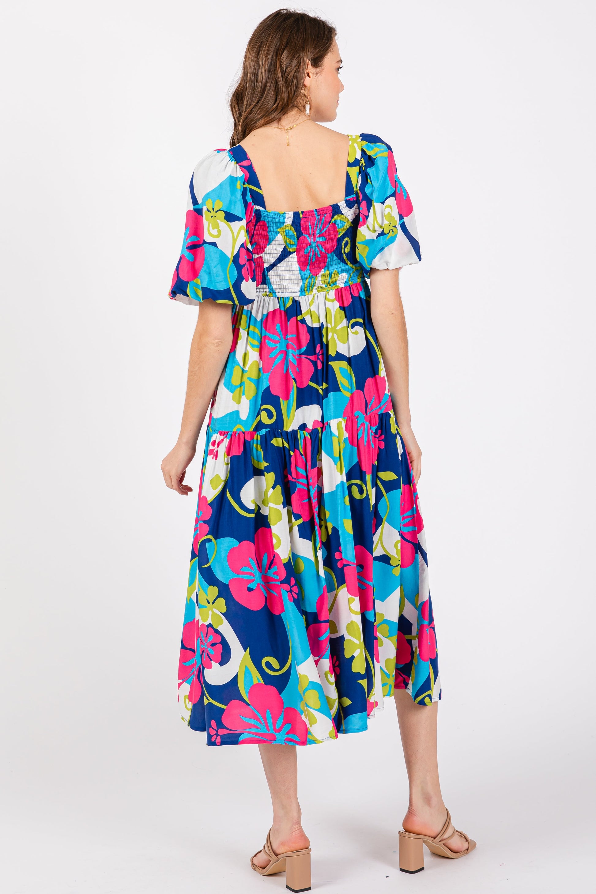 A floral print midi dress featuring short puff sleeves, a tiered skirt, a smocked back and a square neckline.