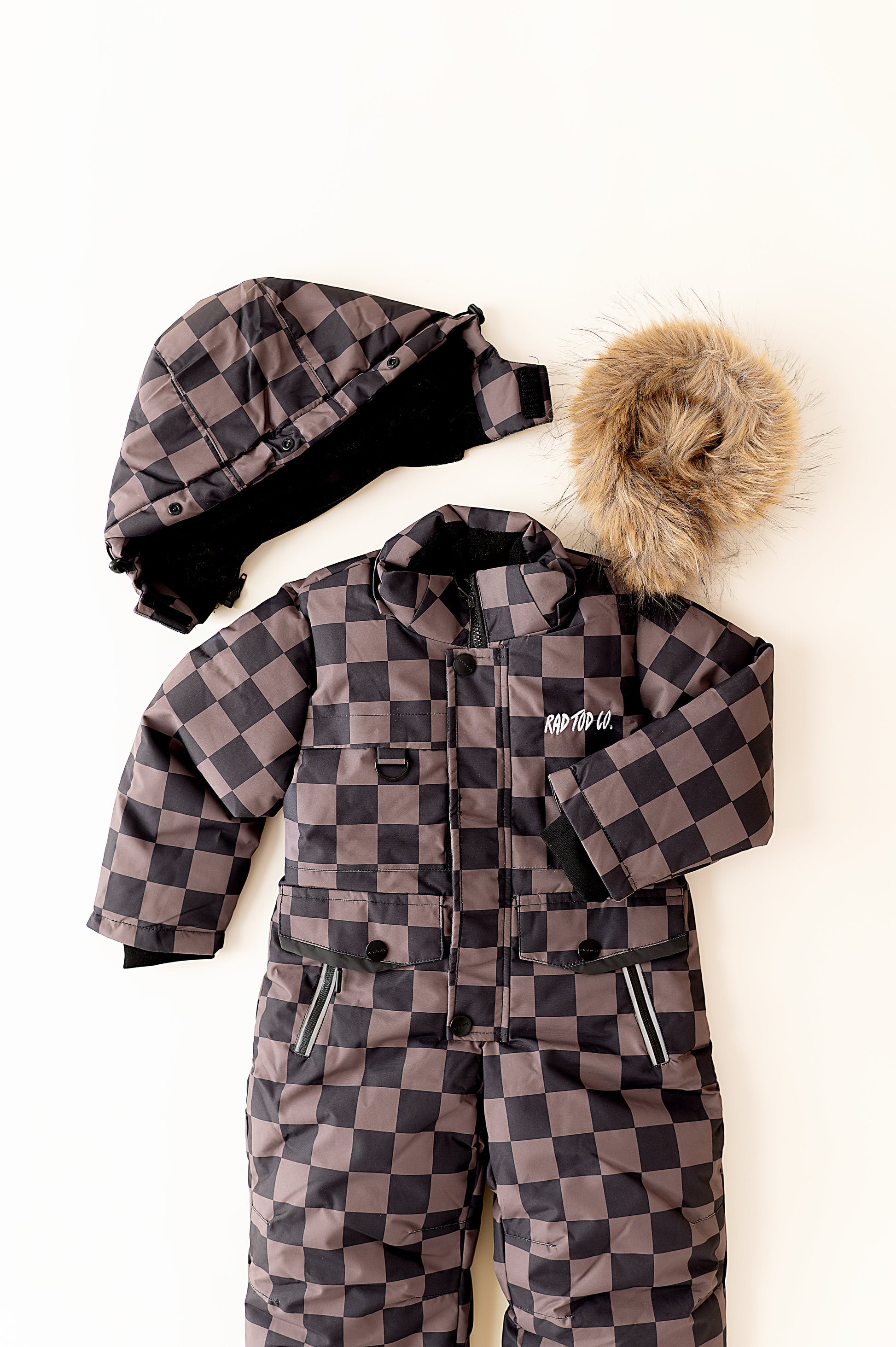 Got a little shredder or a snow loving toddler who likes to spend his winter days outdoors? We've got you covered with our rad toddler snowsuit! It is well padded and insulated for those chilly snow days ahead! Easy on/off with a mid body zipper, waist is adjustable, features many functional pockets, and is lined with the softest fleece to keep your little one nice and toasty during the coldest days of winter! Removable hoodie, removable fur. They do run on the bigger side, if in between sizes please size down.