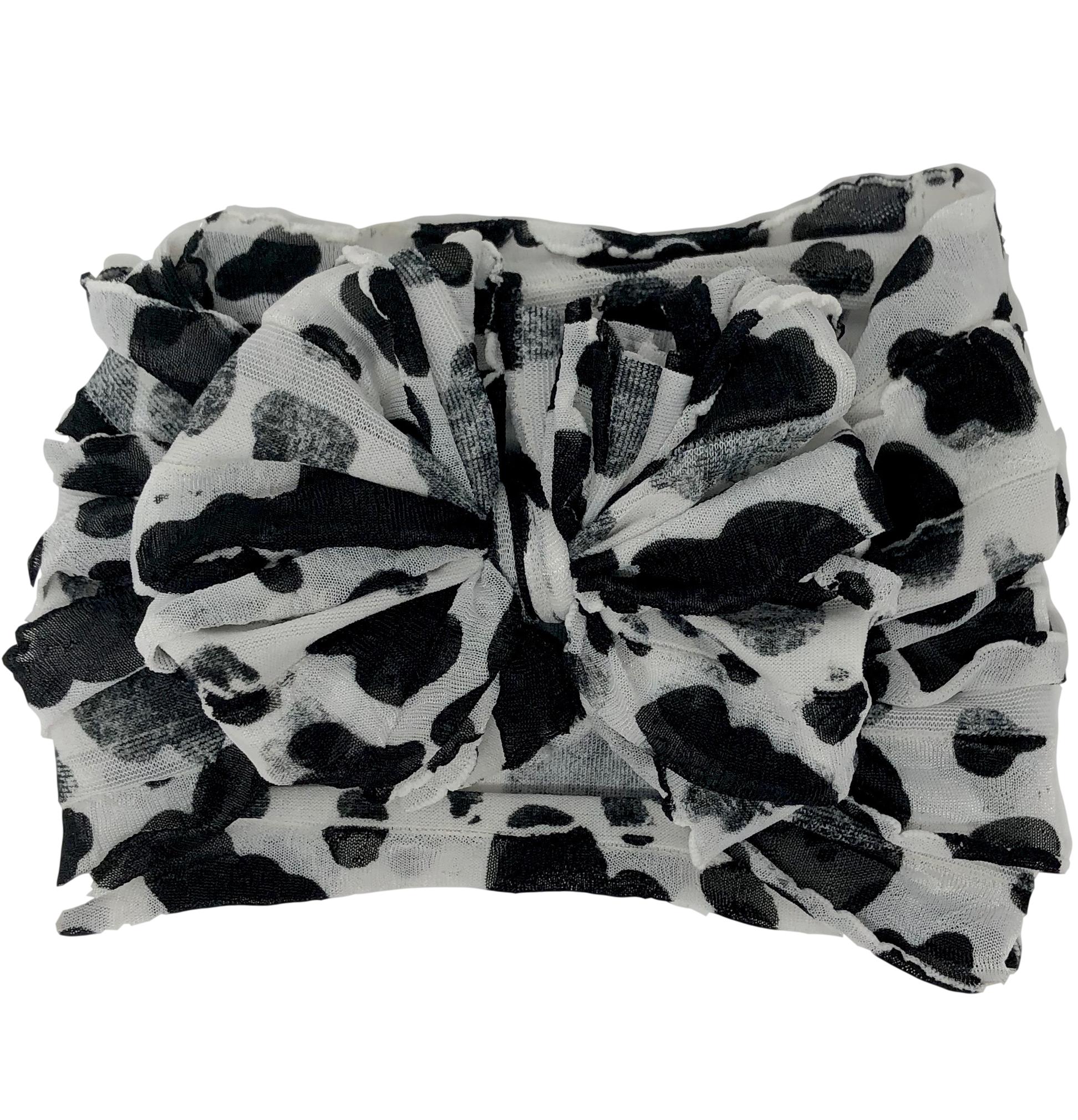 This playful Ruffled Headband in Cow print is crafted from a unique custom-dyed ruffled material, offering the perfect blend of softness and stretch for a comfortable fit. Designed to fit newborns and grow with your baby, this headband will stretch to stay snug and cozy as your little one grows. Featuring a fun 4.5-inch wide bow made from a polyester spandex blend, it adds a quirky touch to any outfit. With a circumference of 13 inches, this headband is perfect for dressing up or down for any occasion. Hand-tied with love by moms in Dallas, TX, this is our #1 selling product that both moms and babies adore! Keep your little one looking adorable and stylish with this fun headband from Rockin Royalty!