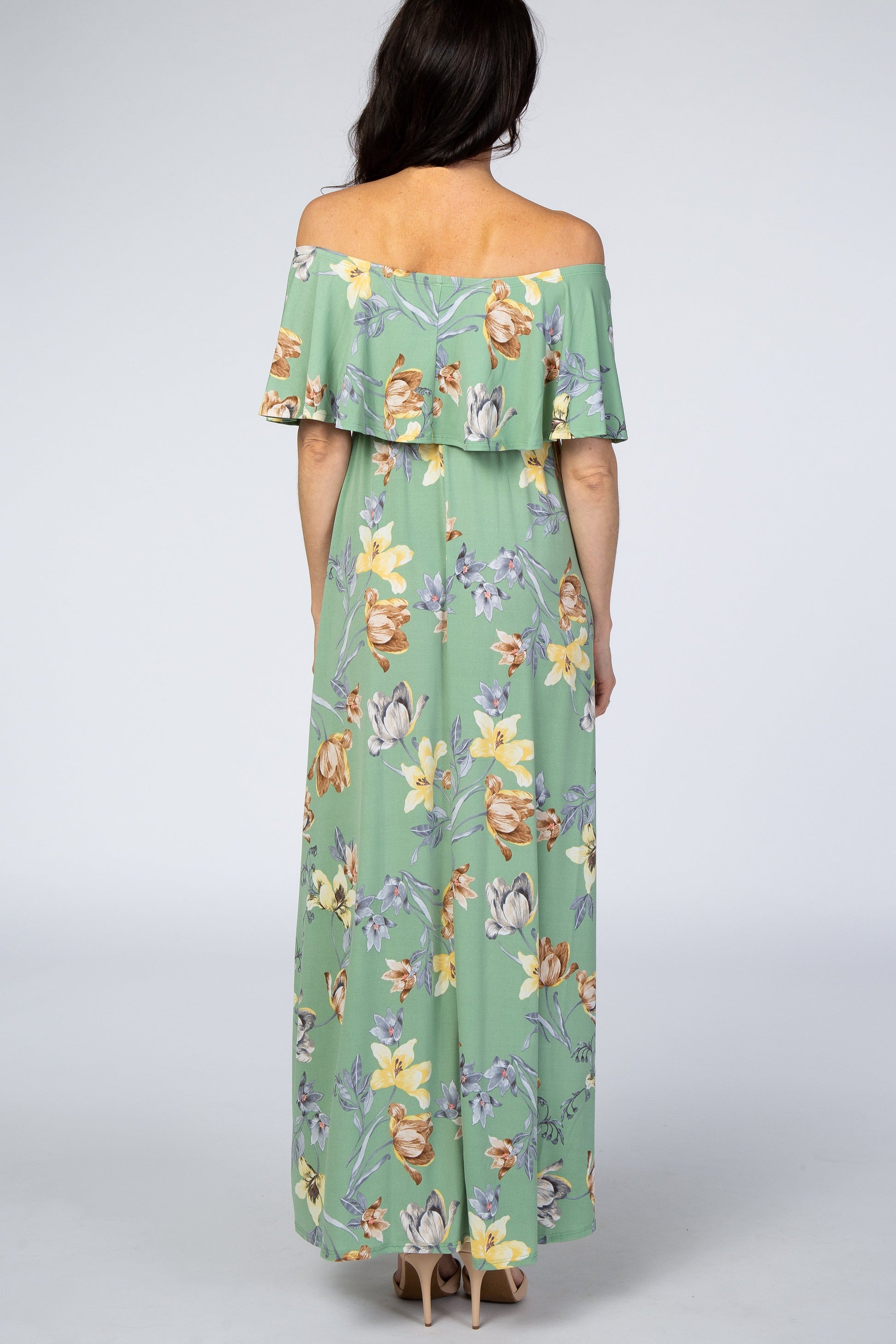 A floral maxi dress featuring a fold-over off shoulder neckline.