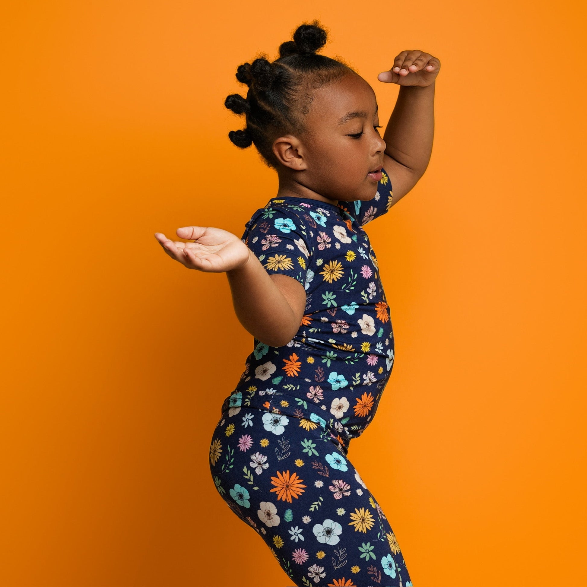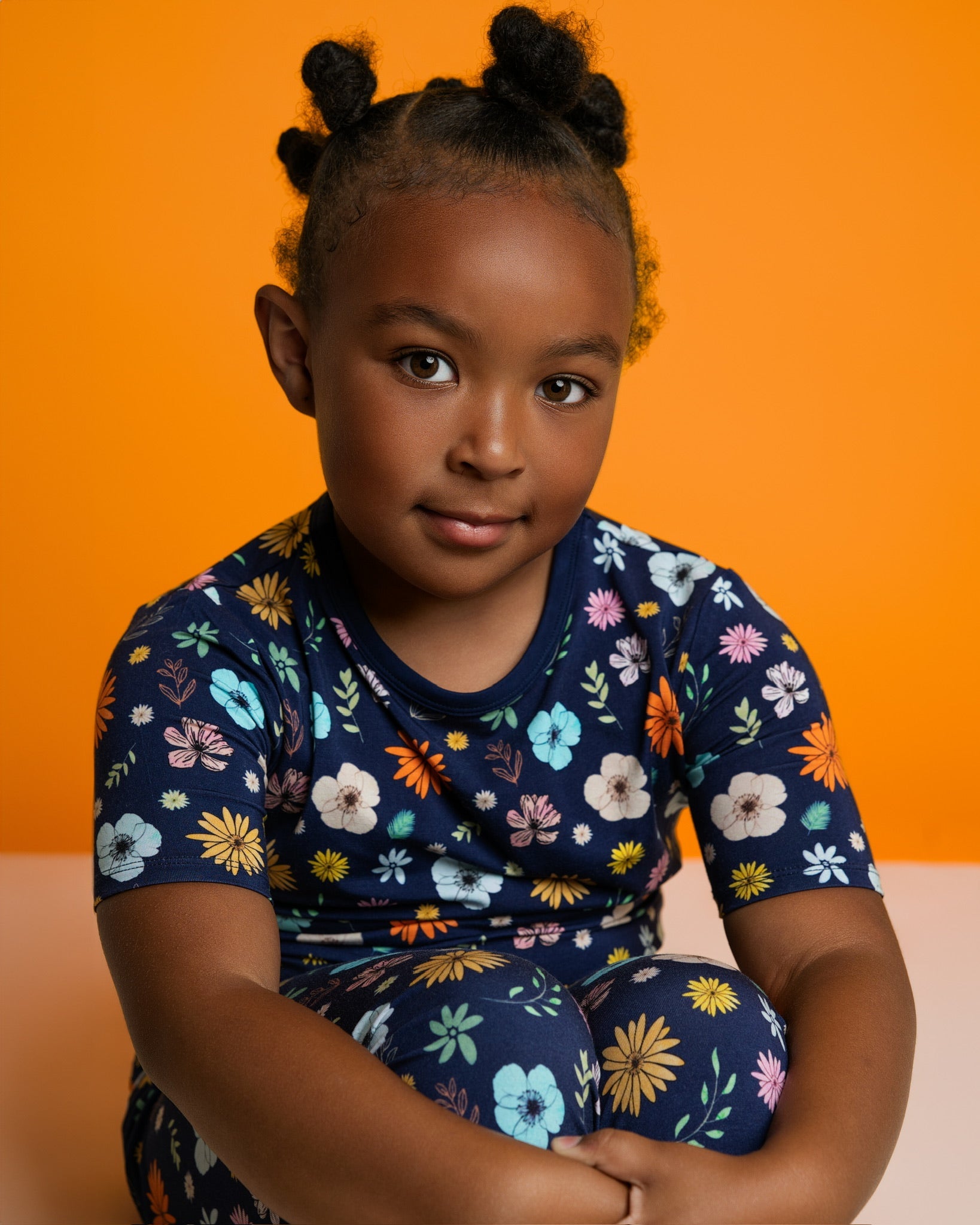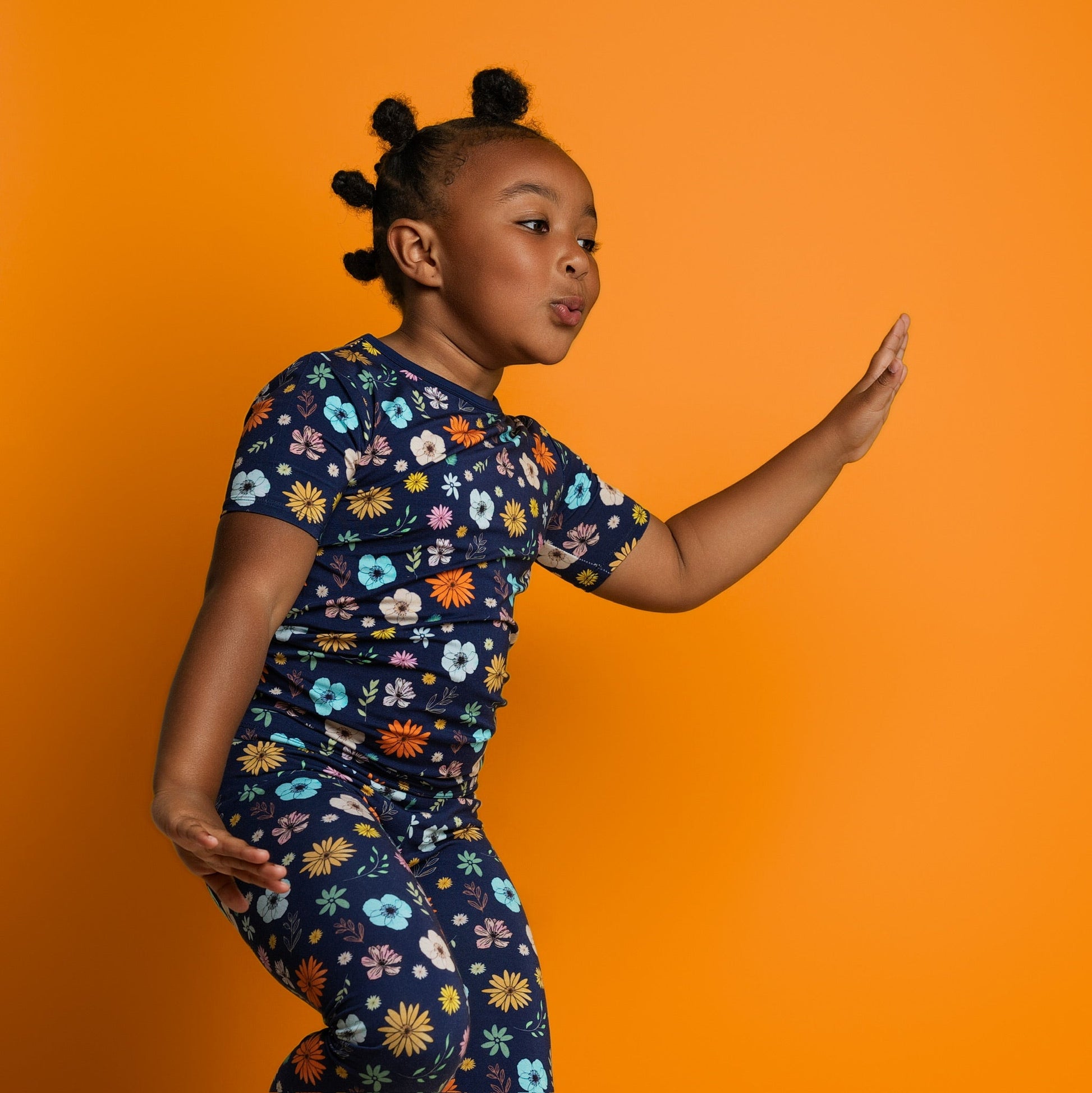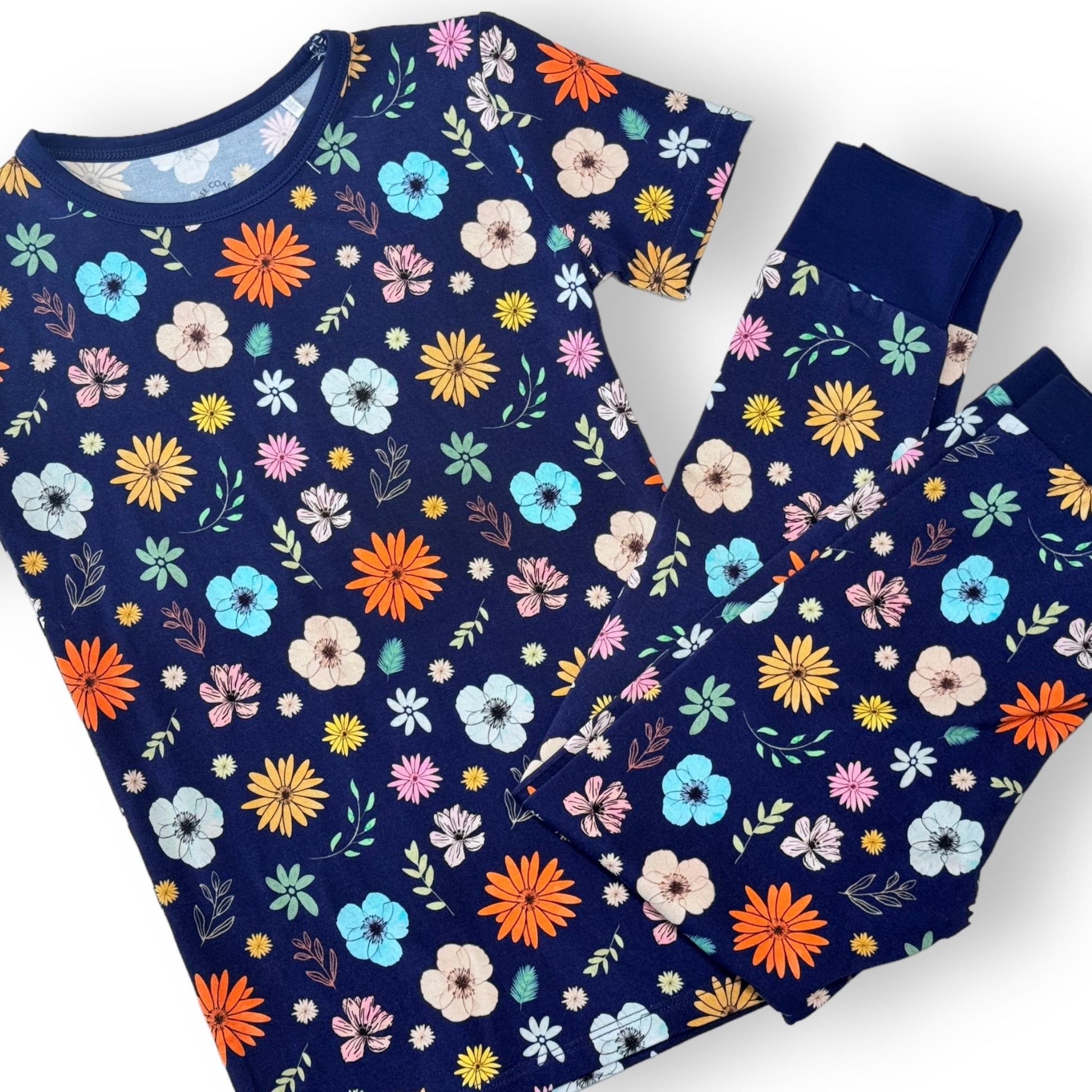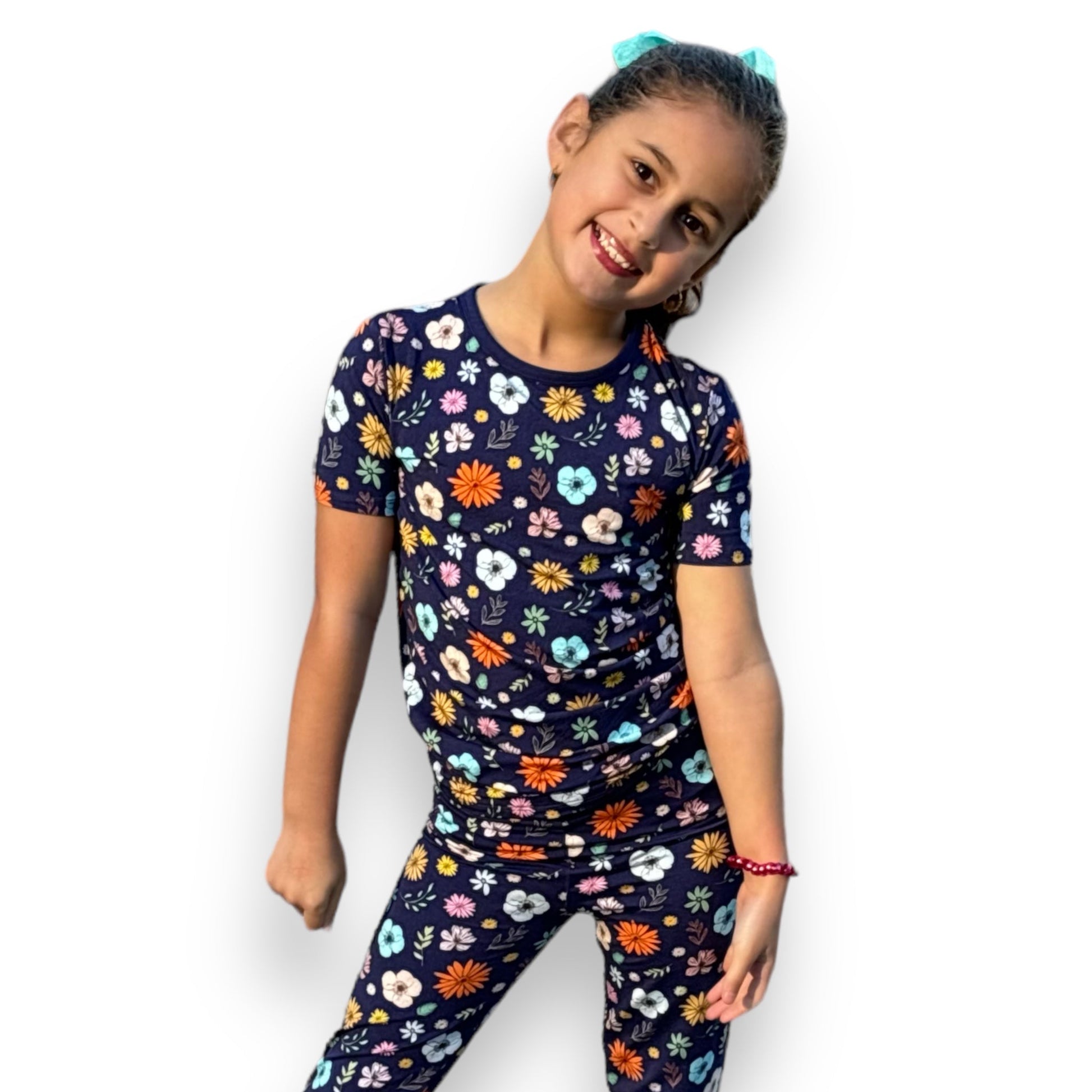 Introducing the Sandy 2pc Bamboo Set – style and comfort in one. The short-sleeve top and cuffed bottoms, crafted from bamboo fabric, feature a vibrant spring floral design on navy blue. A Perfect harmony for spring and fall! Day and night!