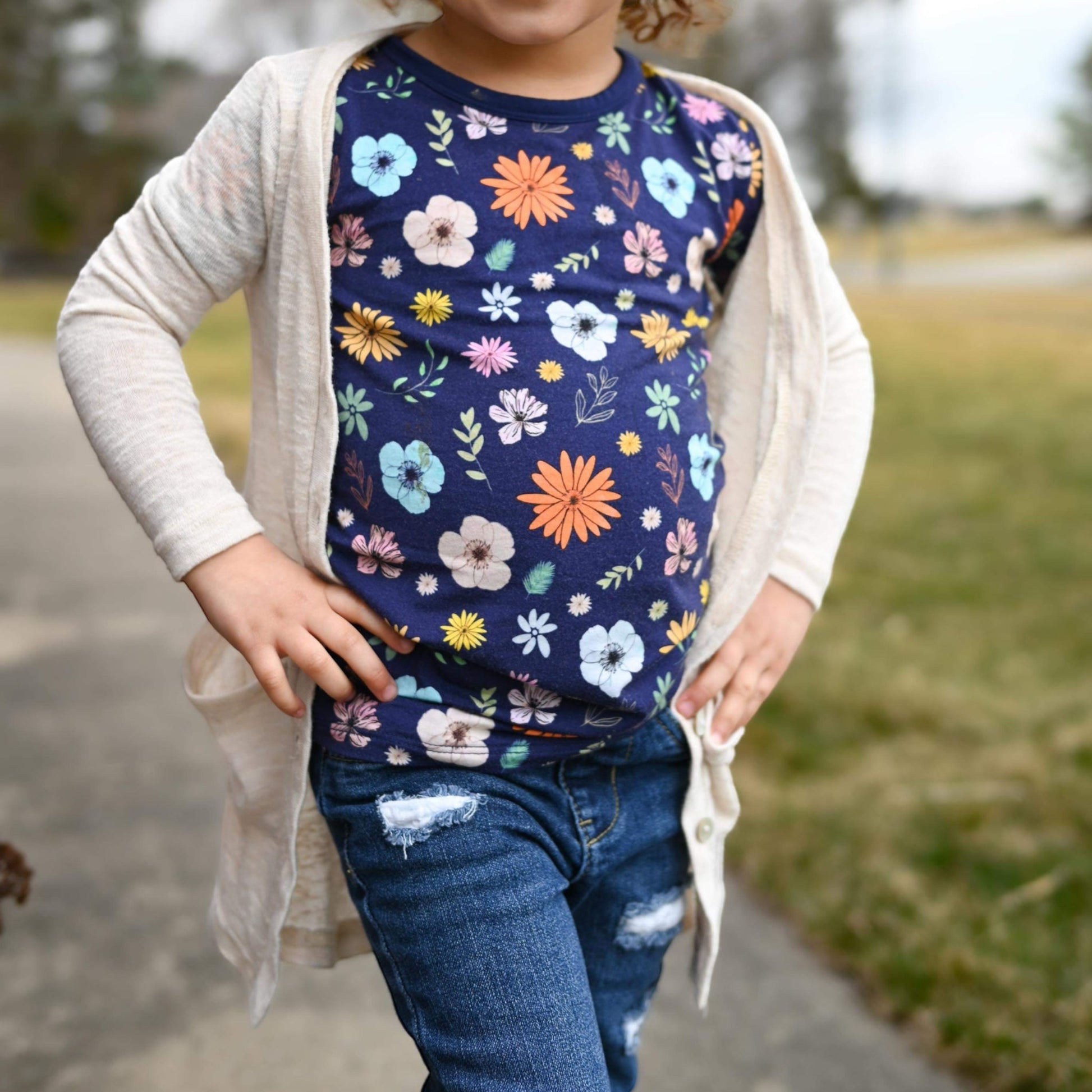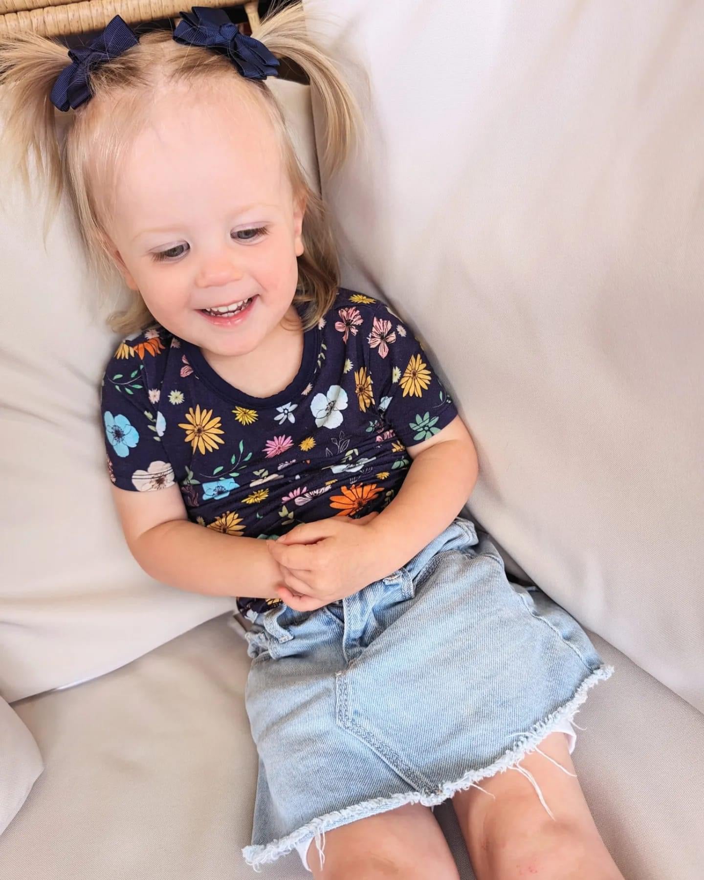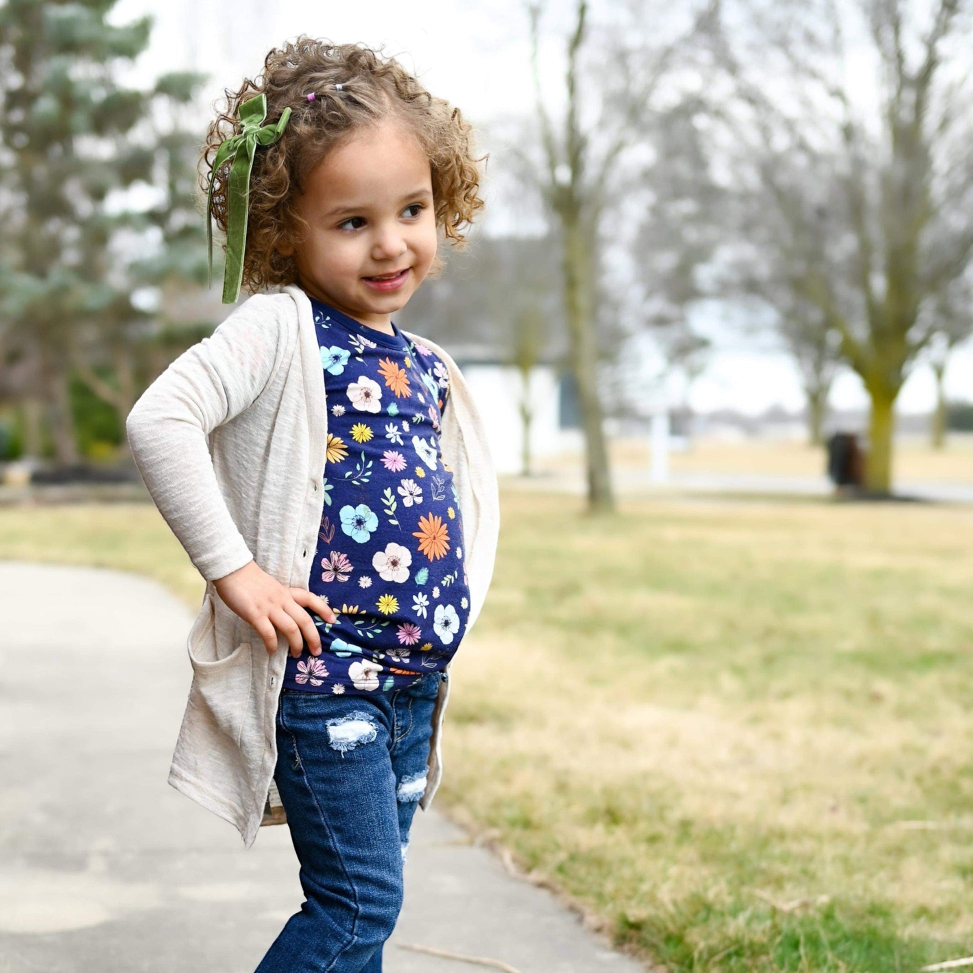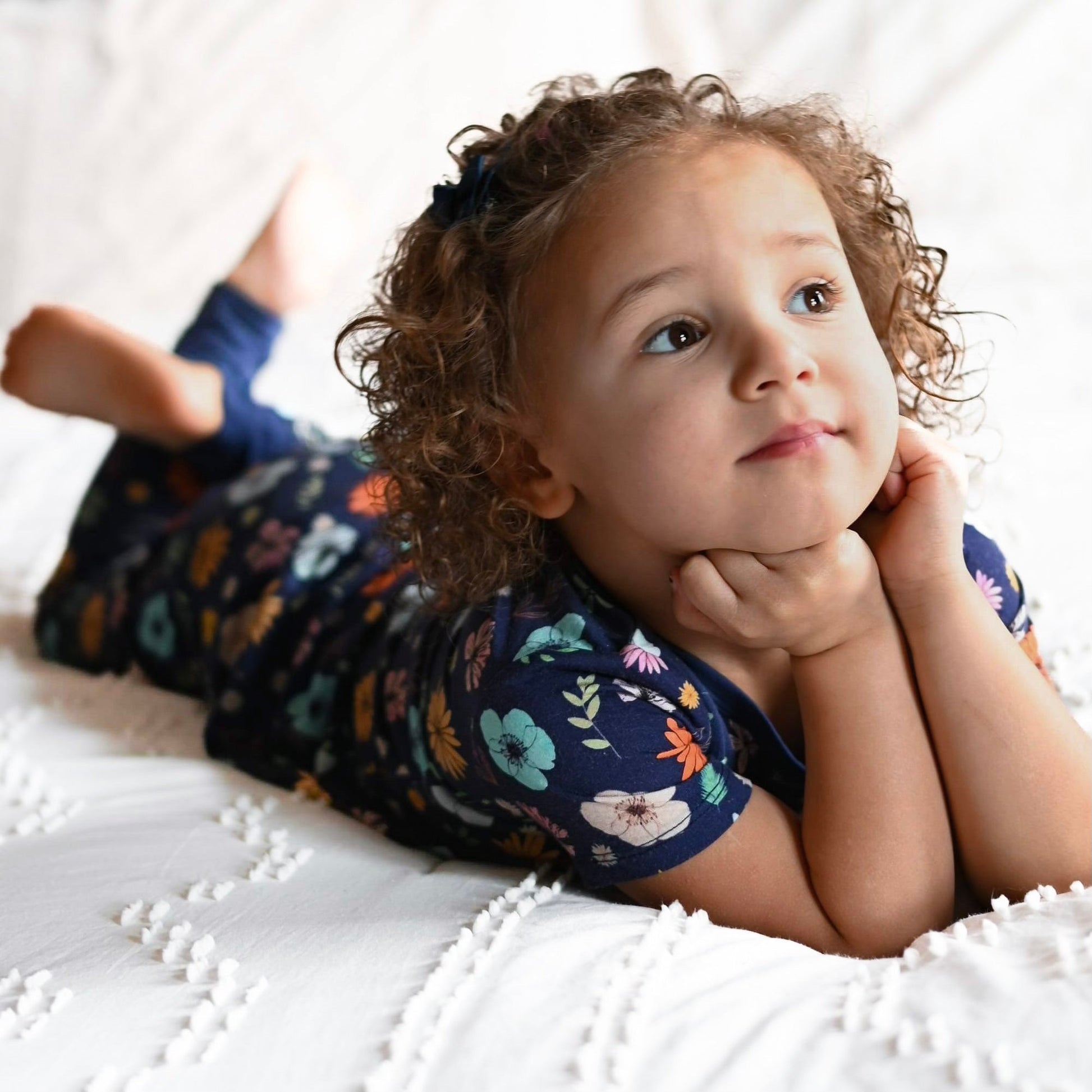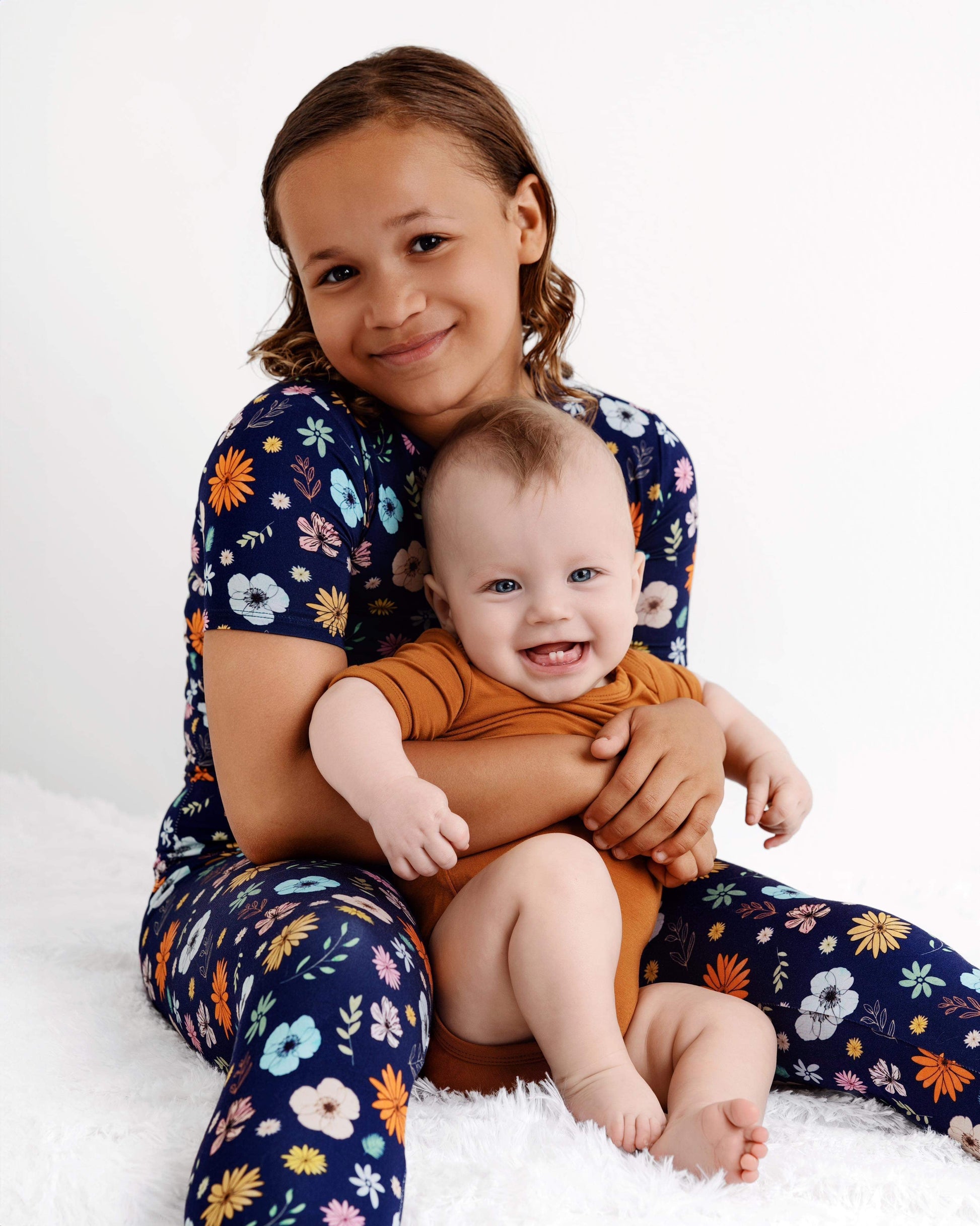 Introducing the Sandy 2pc Bamboo Set – style and comfort in one. The short-sleeve top and cuffed bottoms, crafted from bamboo fabric, feature a vibrant spring floral design on navy blue. A Perfect harmony for spring and fall! Day and night!