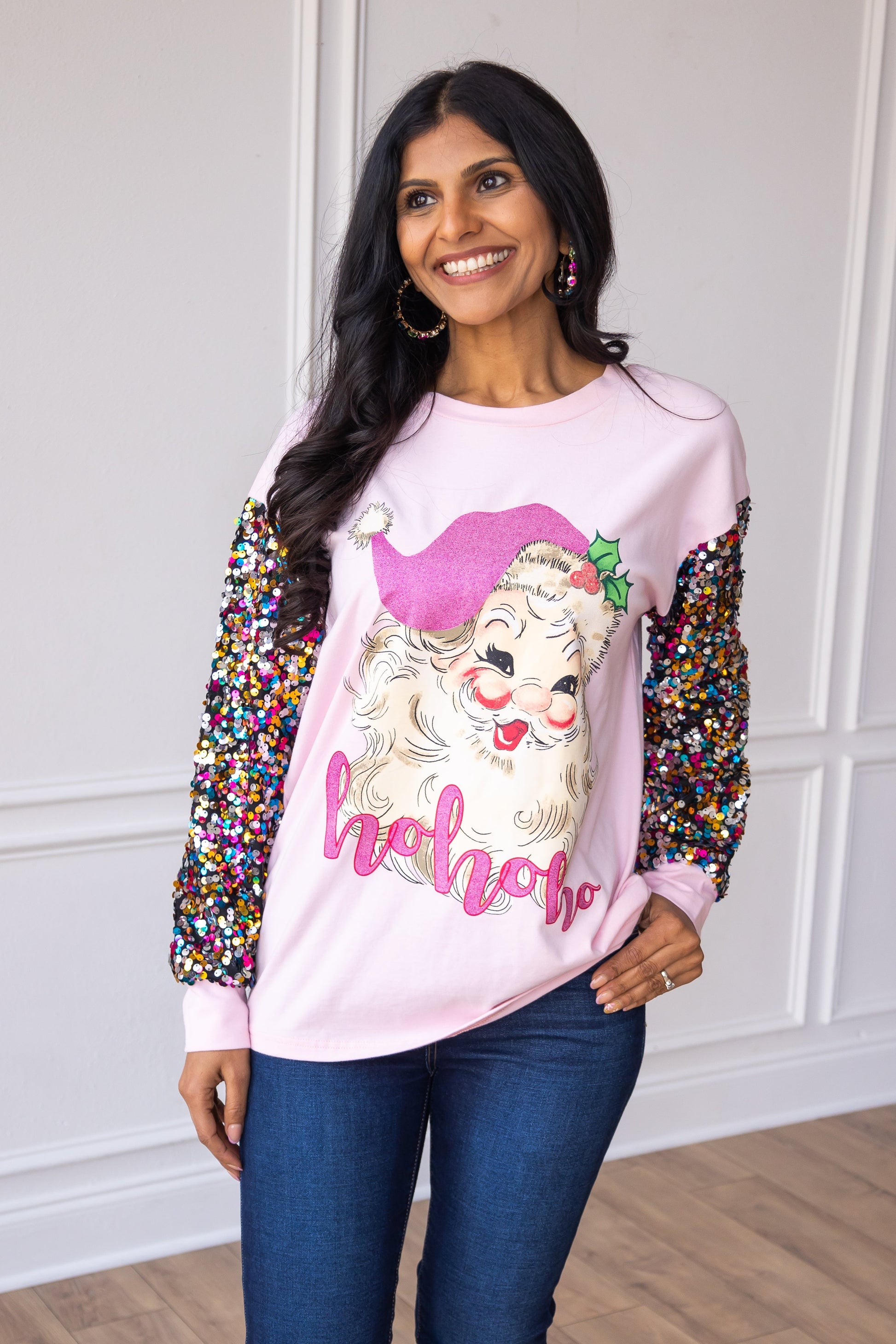 Santa on Pink Sweatshirt with Sequin Sleeves