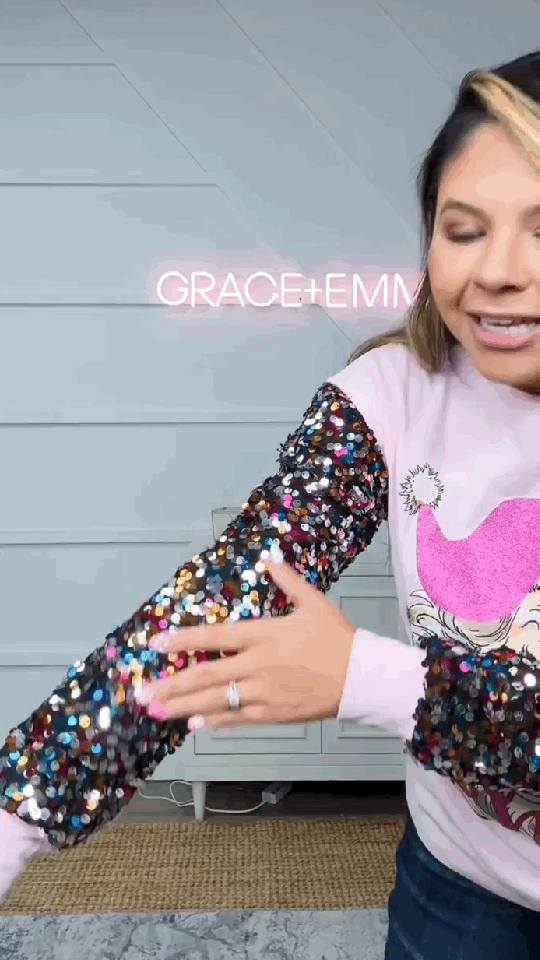 Designed with vanity sizing, this top ensures a more comfortable and flattering fit, making you feel confident in a smaller labeled size. The eye-catching pink sequined sleeves add a playful and glamorous twist to the classic Santa Claus theme.