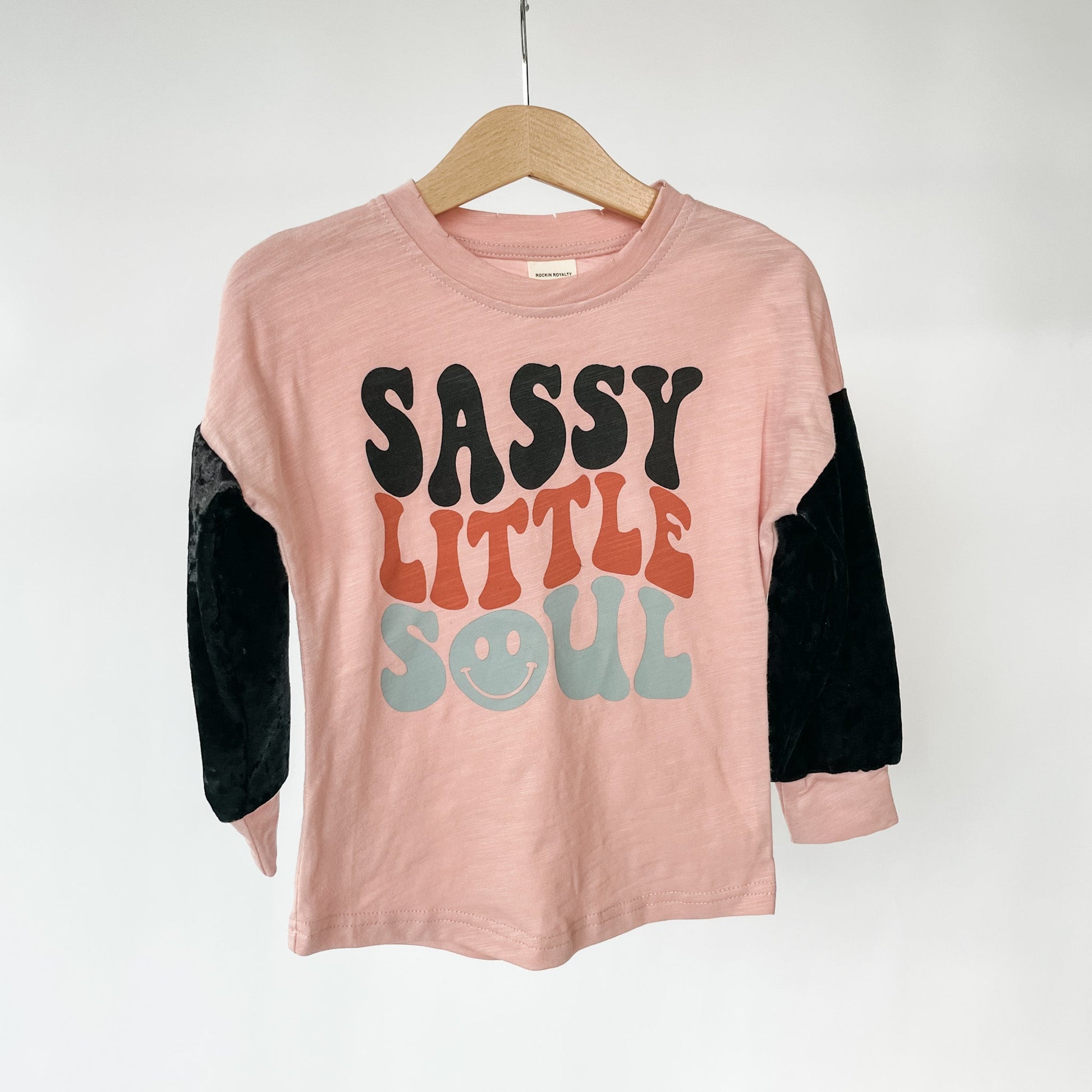 Sassy Little Soul Graphic Tee shirt is made from 100% cotton, offering comfort and style. It feature a distressed hem at the neck for a trendy, vintage look. This tops pair perfectly with our Bell Bottom Pants and are the ideal complement to our ruffled headbands or clippys. Note: Bell bottoms are sold separately.