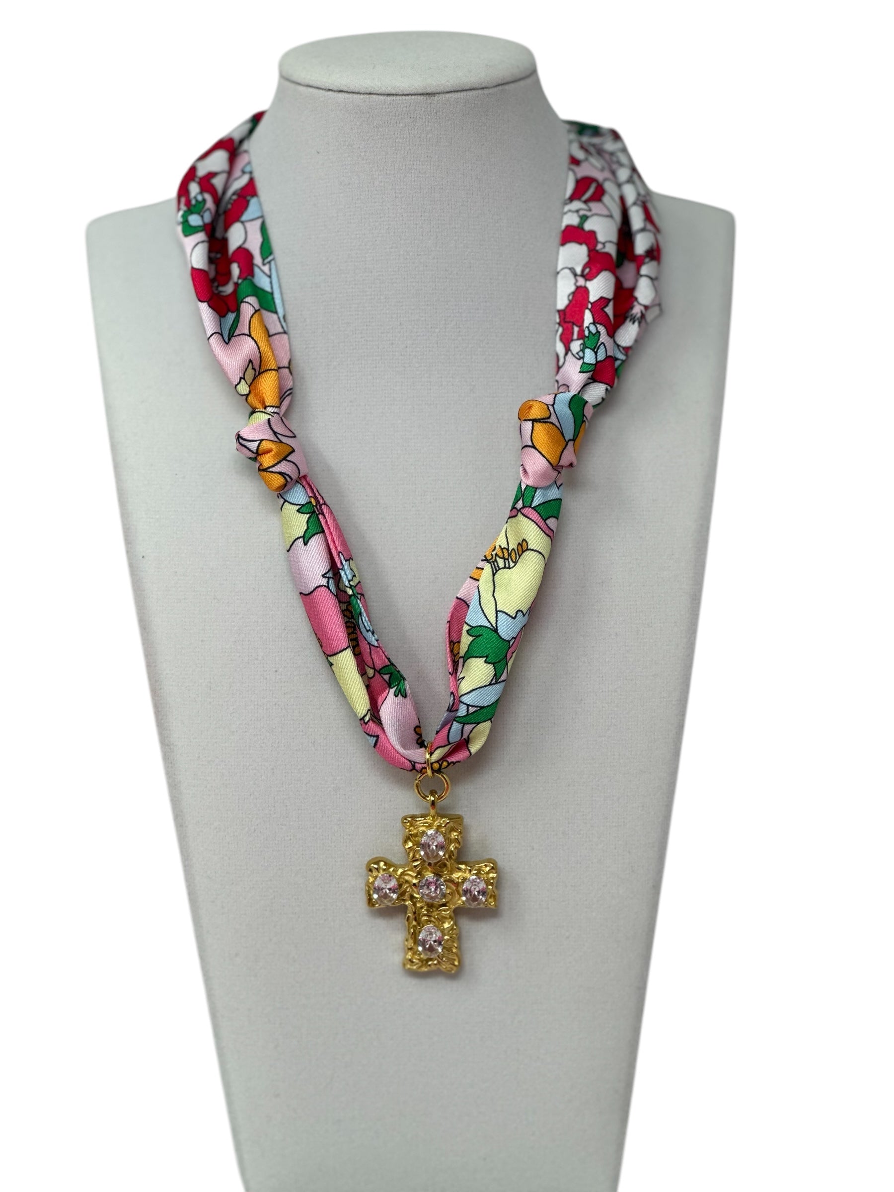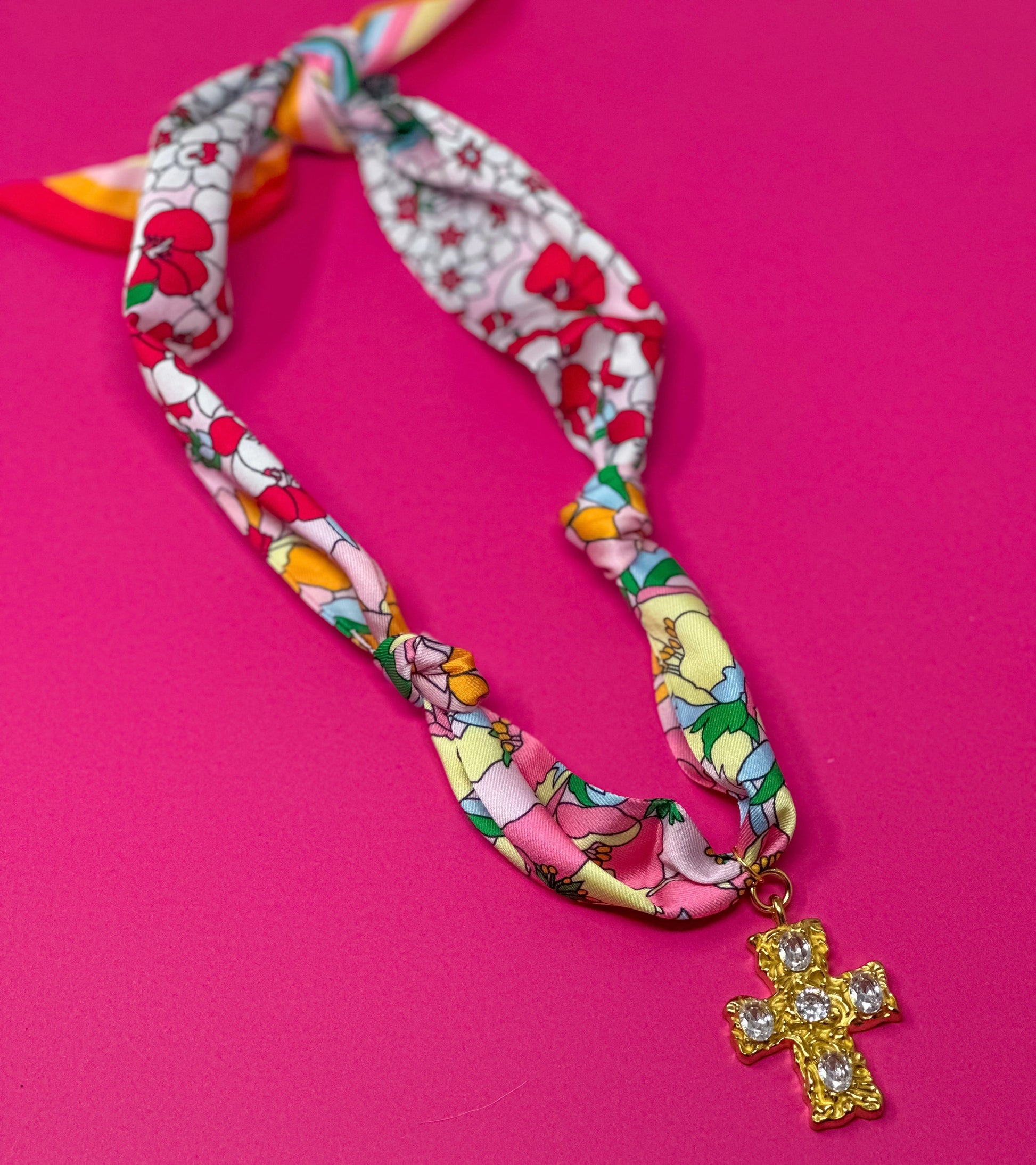 Scarf Charm Necklace – Multi Pink with Rhinestone Cross