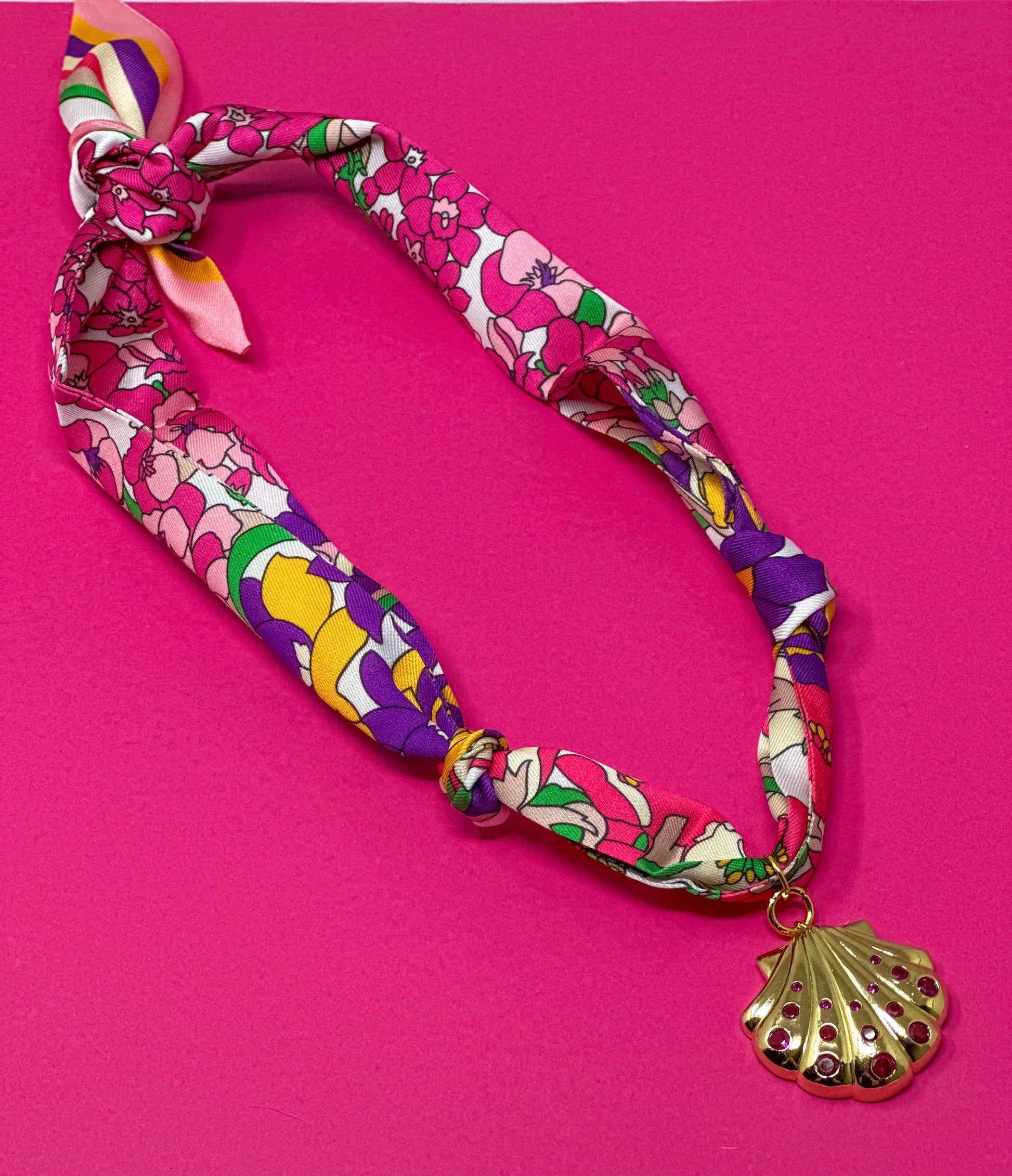 Scarf Charm Necklace - Pink and Purple Multi Flowers with Shell Charm