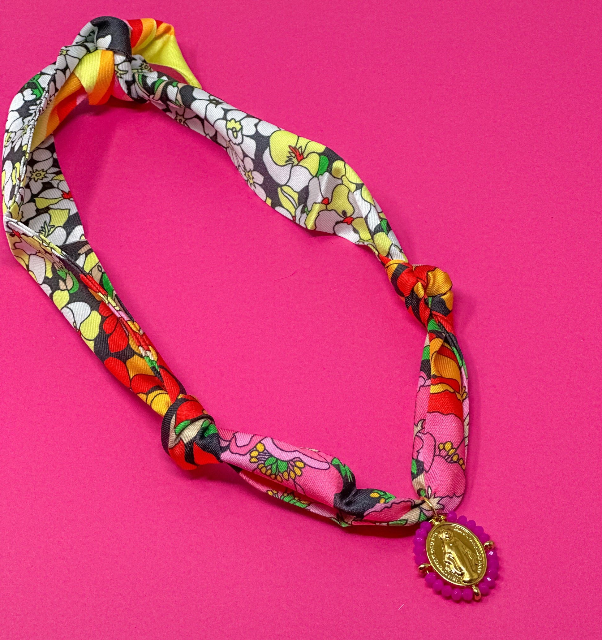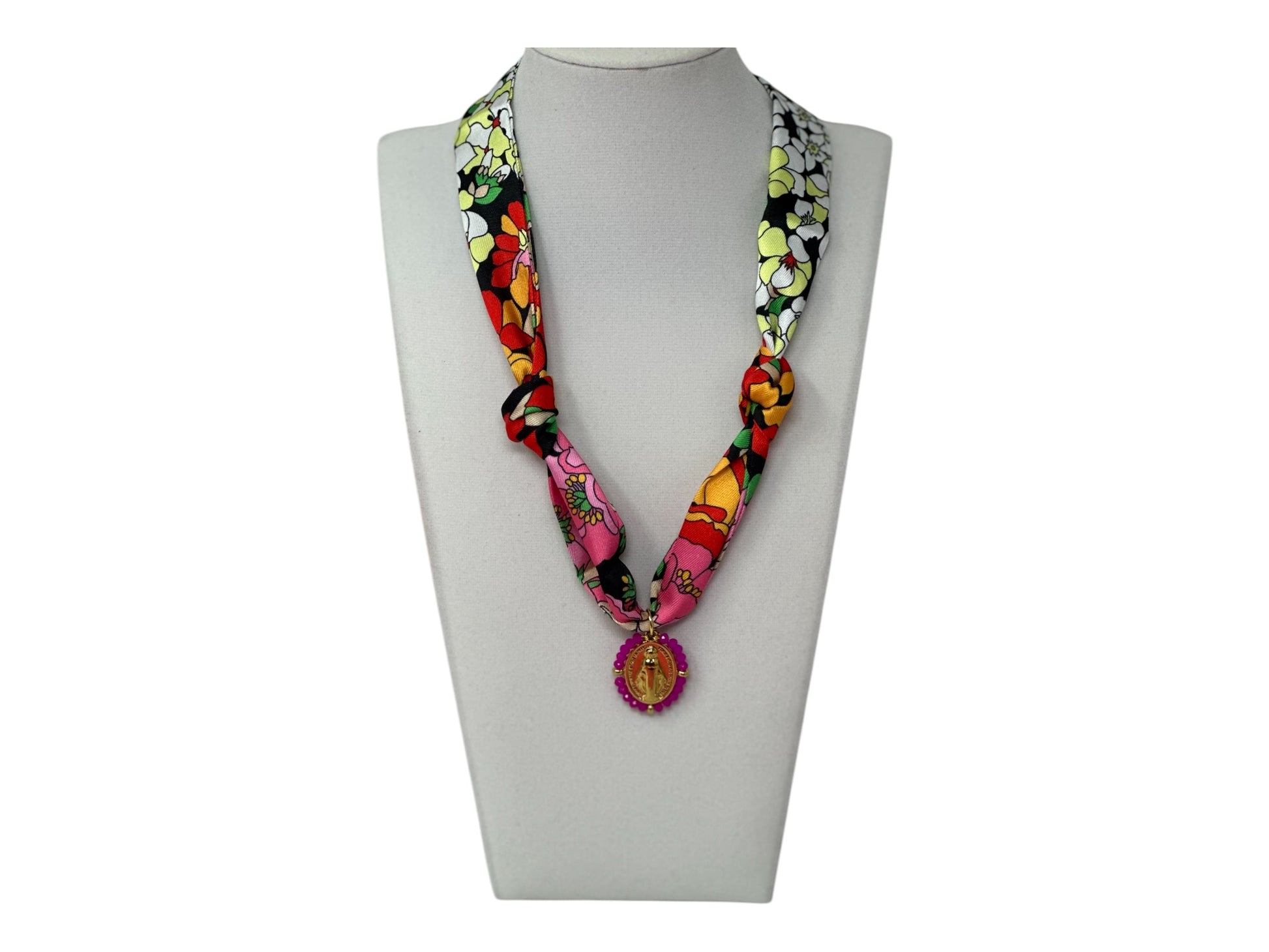 Scarf Charm Necklace - Pink Multi Flower with Mary Pendant with Pink Beads