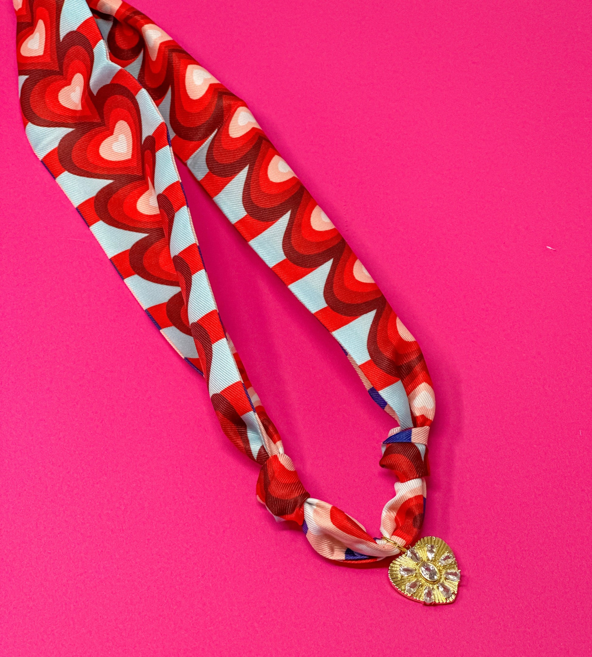 Scarf Charm Necklace - Red and Blue Heart Print with Small Rhinestone Heart Pendant