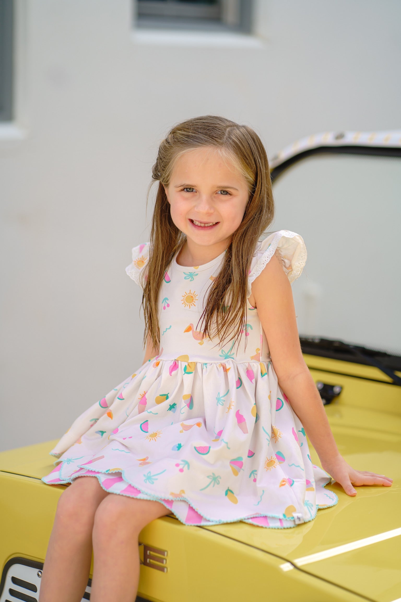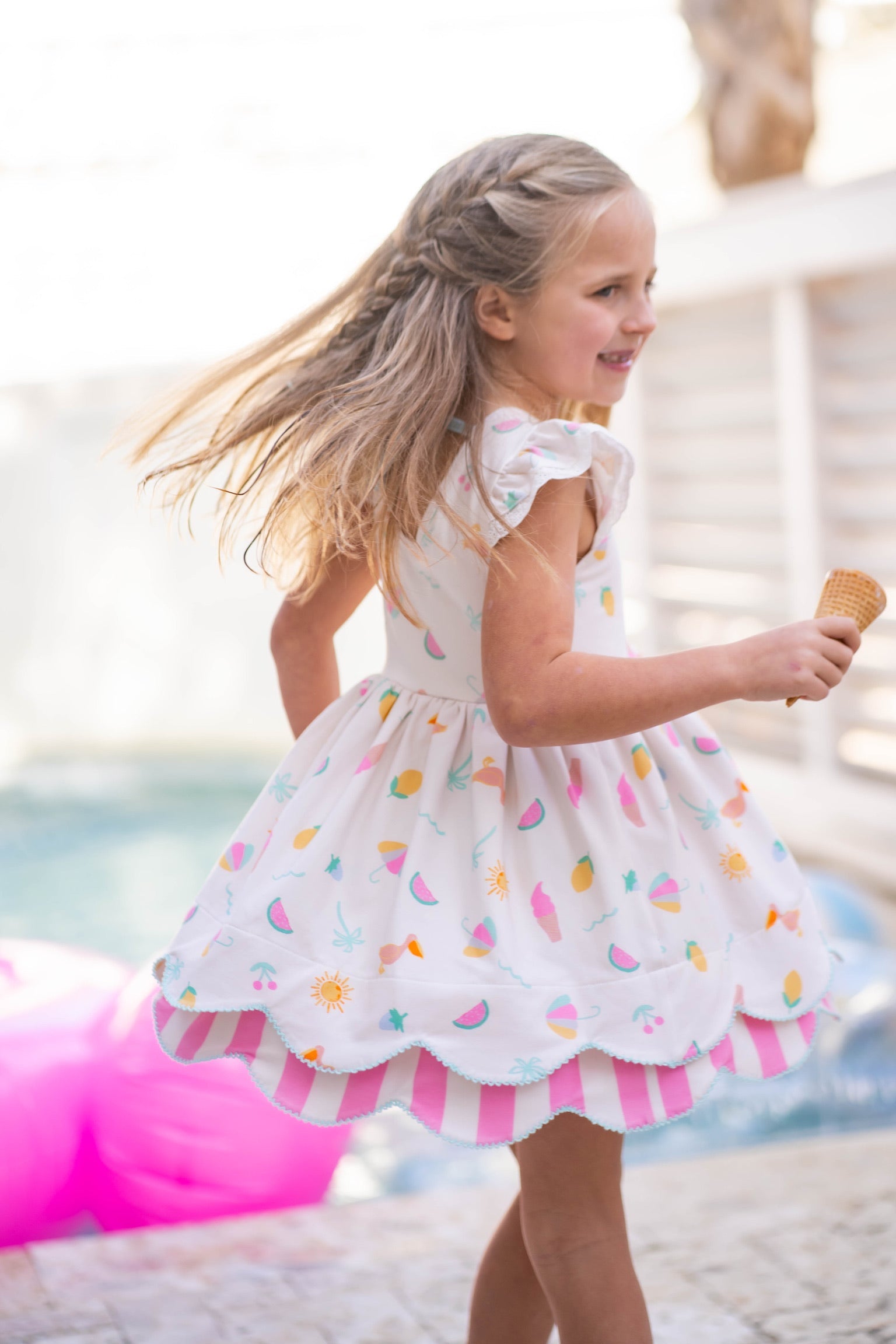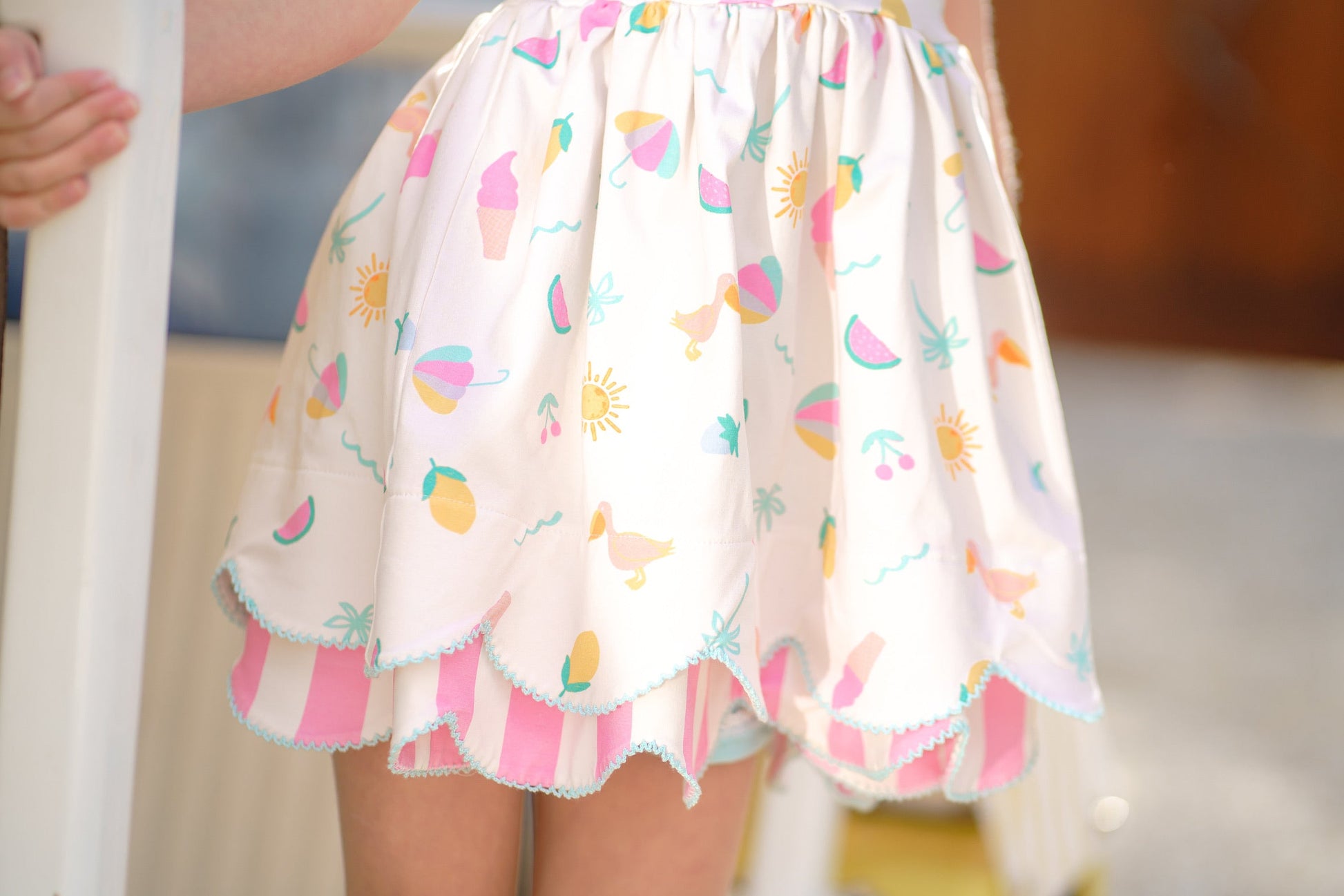 - Top features a double layer scallop hem and a tie back at the neck