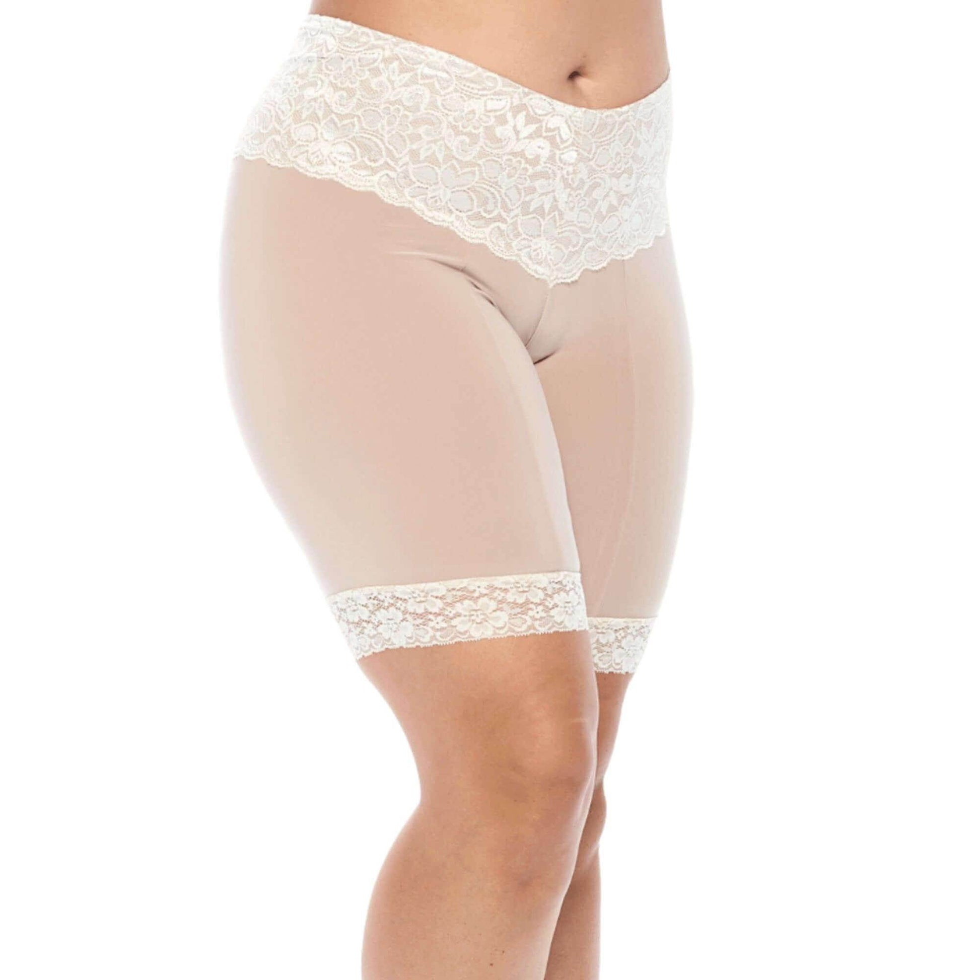 - Wide soft lace waistband and 9" Inseam with front seam to flatter your curves
