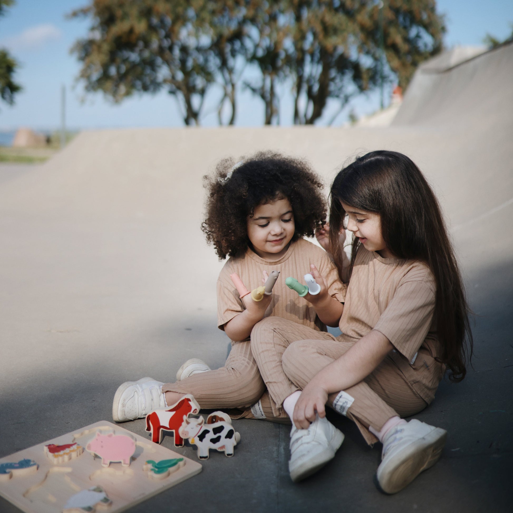 Crafted from non-toxic silicone, Mushie finger puppets fit on small fingers, making them easy for children to handle and manipulate. Designed wide enough to also fit most adult fingers, so parents can join in on the fun. The set includes a cat, lamb, bunny, bear, and dog, each brightly colored and detailed to engage young imaginations.