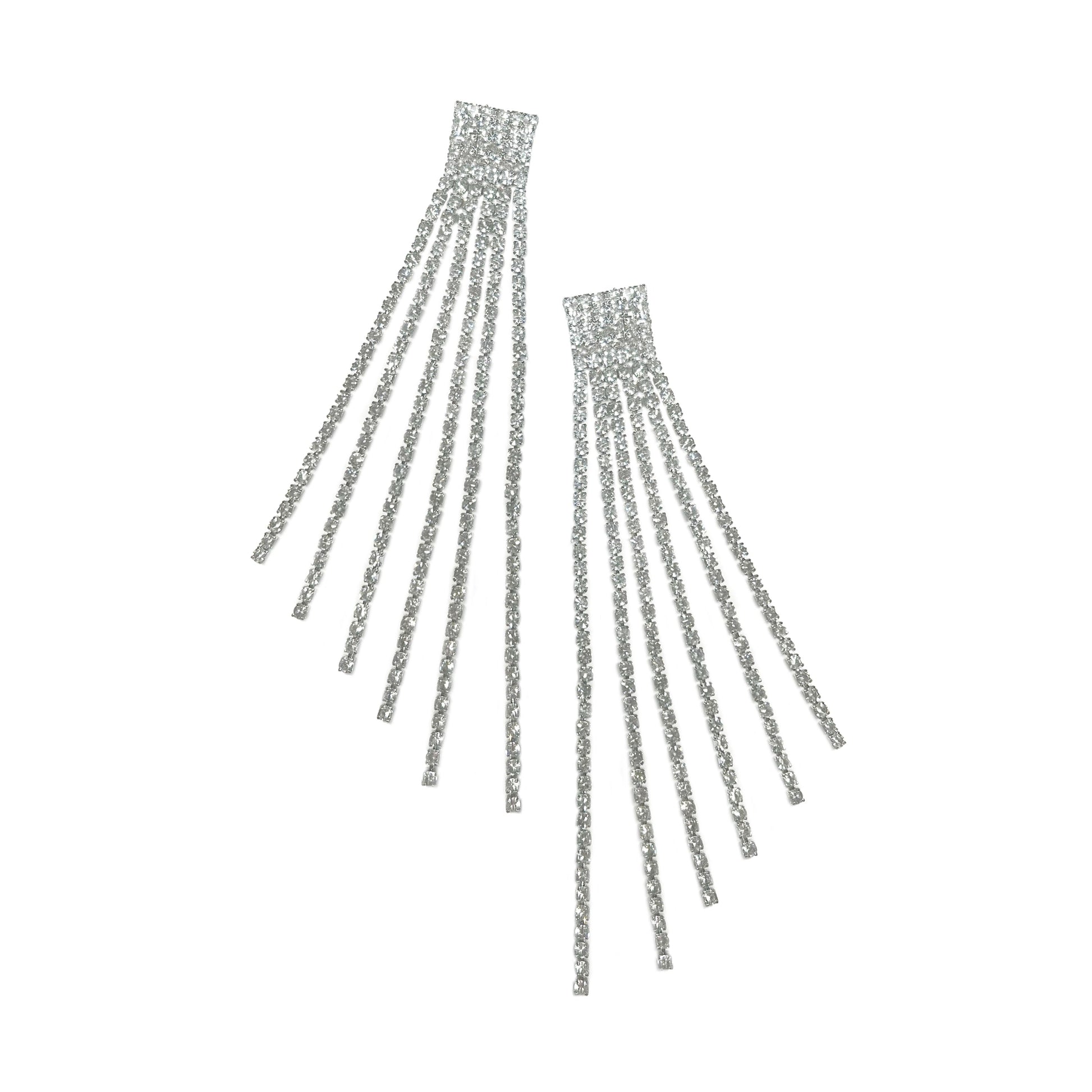 Introducing our Silver Abstract Rhinestone Fringe Earrings, a mesmerizing accessory that effortlessly combines modern style with a touch of vintage glam. These earrings feature an abstract design adorned with shimmering rhinestones, creating a captivating play of light and sparkle. The elegant fringe detail adds movement and allure, making these earrings a statement piece for any occasion. Crafted with precision and sophistication, these silver earrings are the perfect choice to elevate your look and add a touch of chic sophistication to your ensemble.