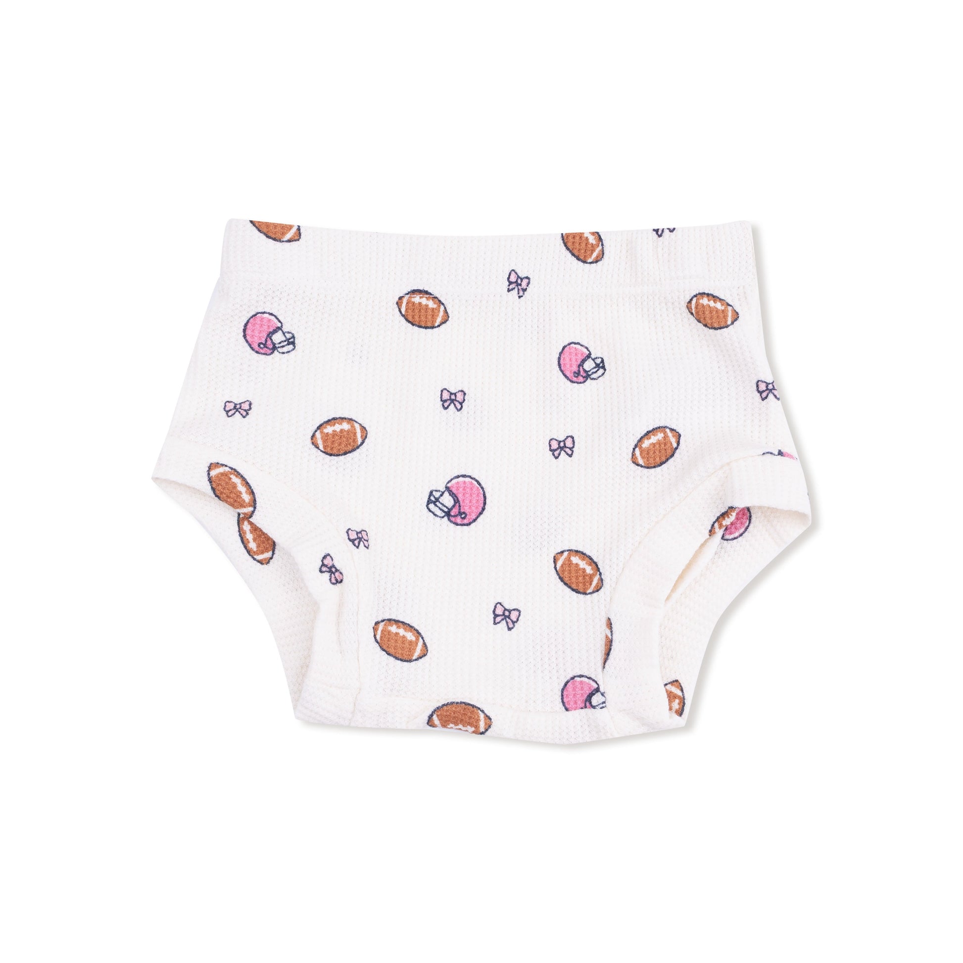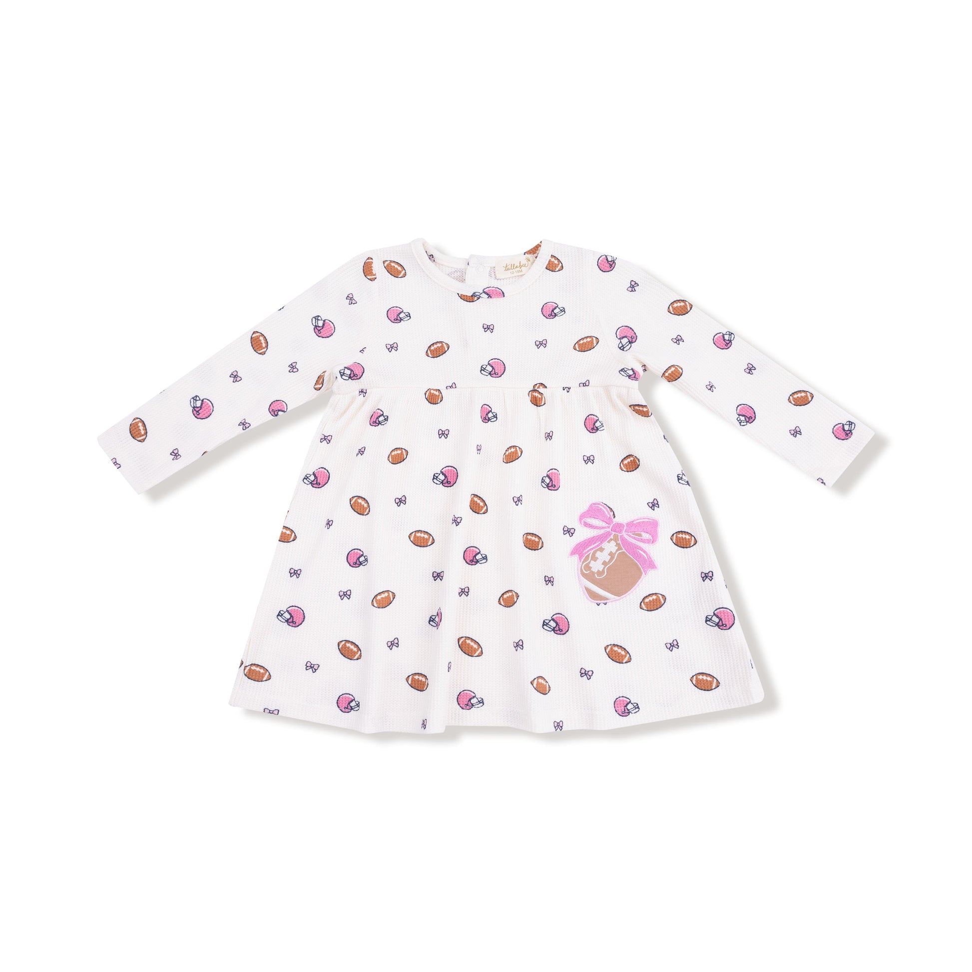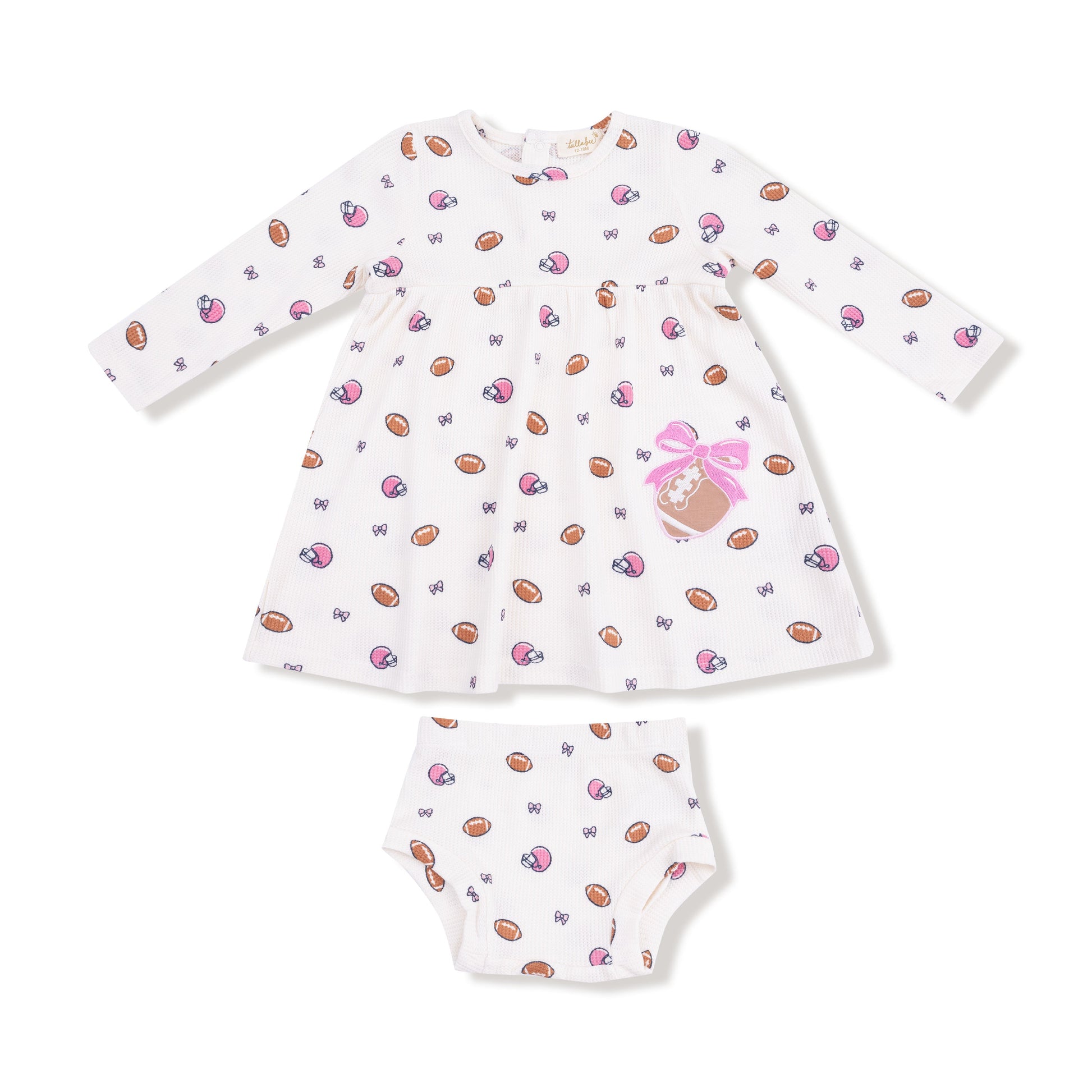 Get game day ready with our Simple Dress and Bloomer set, featuring a fun football bow applique for that perfect sporty touch! Crafted from warm and textured waffle fabric, this duo keeps your little MVP comfy and cute during all those fall and winter adventures.