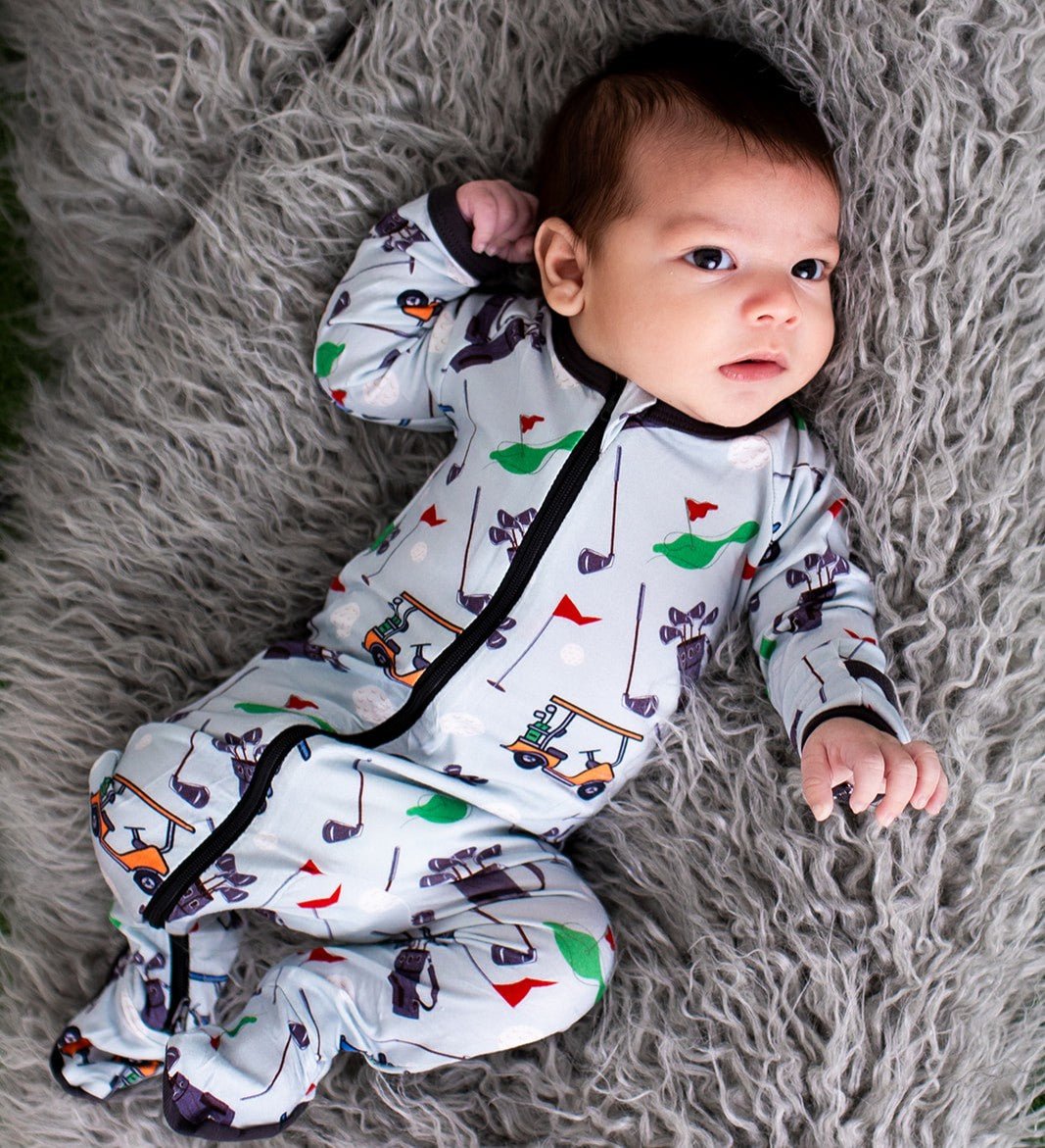 Keep your little snuggled up in our golf print footie! Made with super soft bamboo, this footie features golf related items all over the print and a dual 2-way zipper for hassle-free diaper changes. Plus, keep little hands warm with fold over mittens on NB and 0/3m sizes, and foot grips on larger sizes. So soft and cozy, your baby will love it!