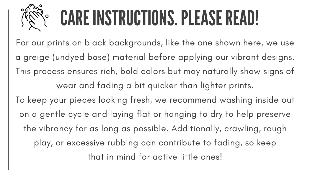 To keep your pieces looking fresh, we recommend washing inside out on a gentle cycle and laying flat or hanging to dry to help preserve the vibrancy for as long as possible. Additionally, crawling, rough play, or excessive rubbing can contribute to fading, so keep that in mind for active little ones!