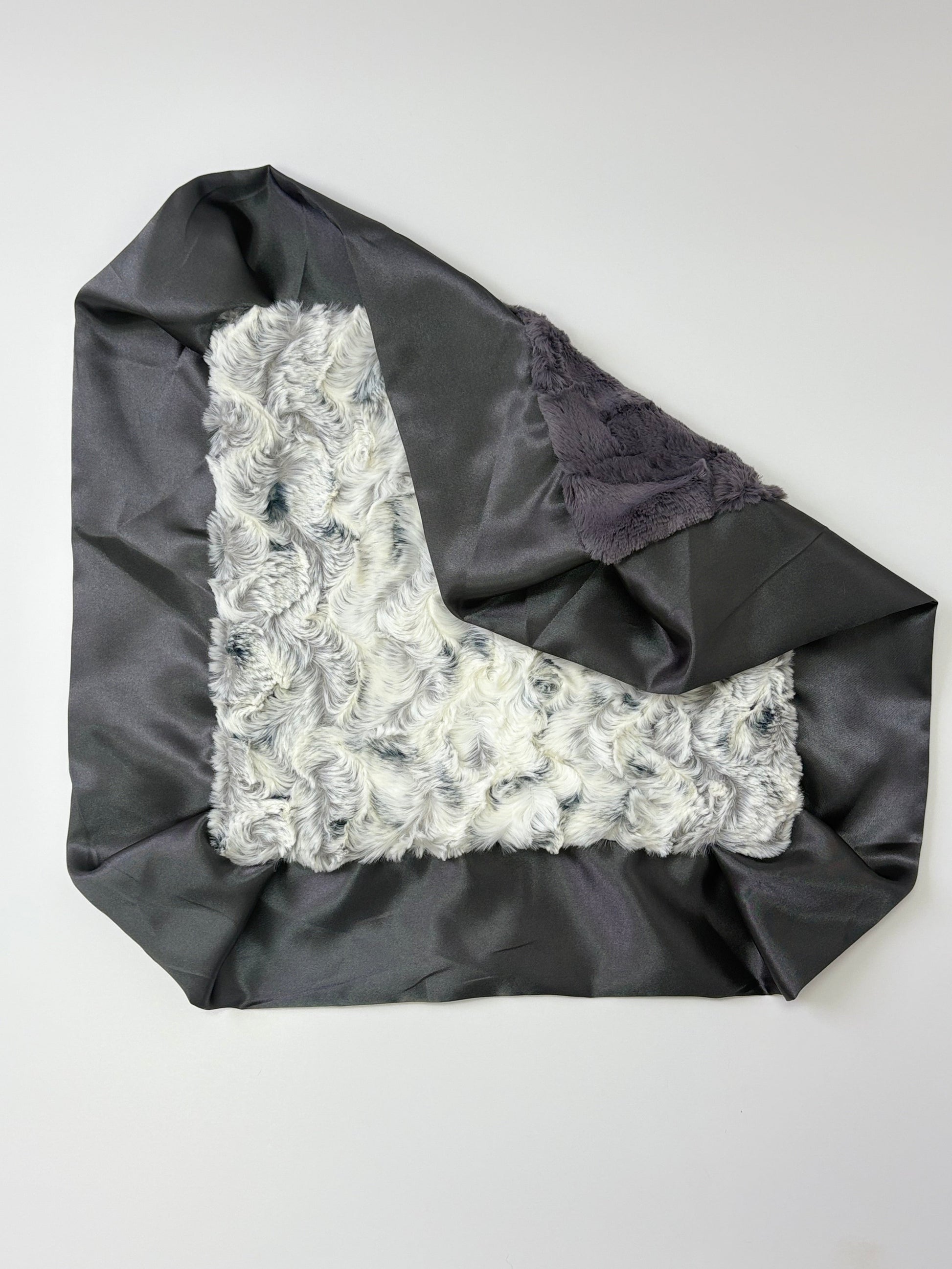 Soothing and stylish, our Snowy Owl Luxury Lovie is the perfect mini comfort companion. Inspired by the soft, feathery texture of an owl’s wings, this 15" by 15" lovie features a beautiful blend of ivory and dark grey faux fur, trimmed in silky satin for a gentle, elegant finish.