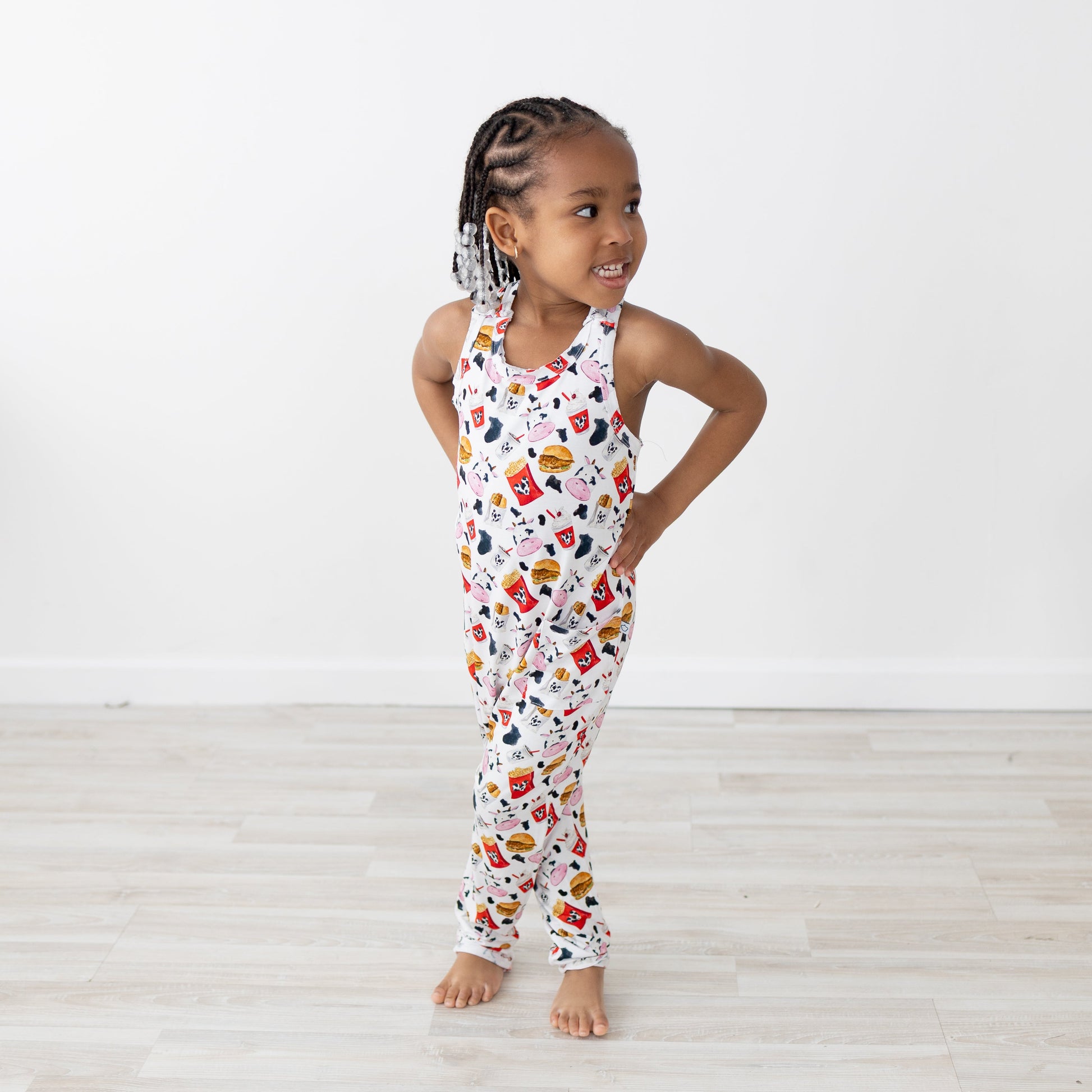 The perfect blend ofย style and comfort, our Snuggies & Nuggies Racerback Romper is made for little snack lovers on the go! Featuring a fun print of chicken nuggets, fries, and milkshakes, this ultra-soft bamboo romper is perfect for playdates, park days, and cozy lounging. With a chic racerback design, functional pockets, and easy snaps at the top, itโs as practical as it is adorable! ๐
