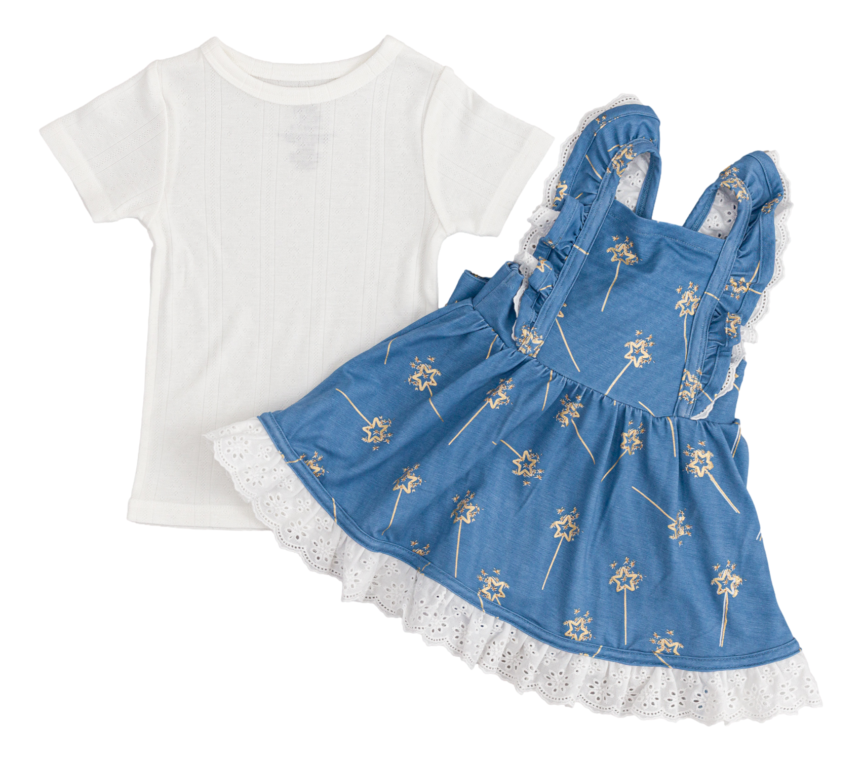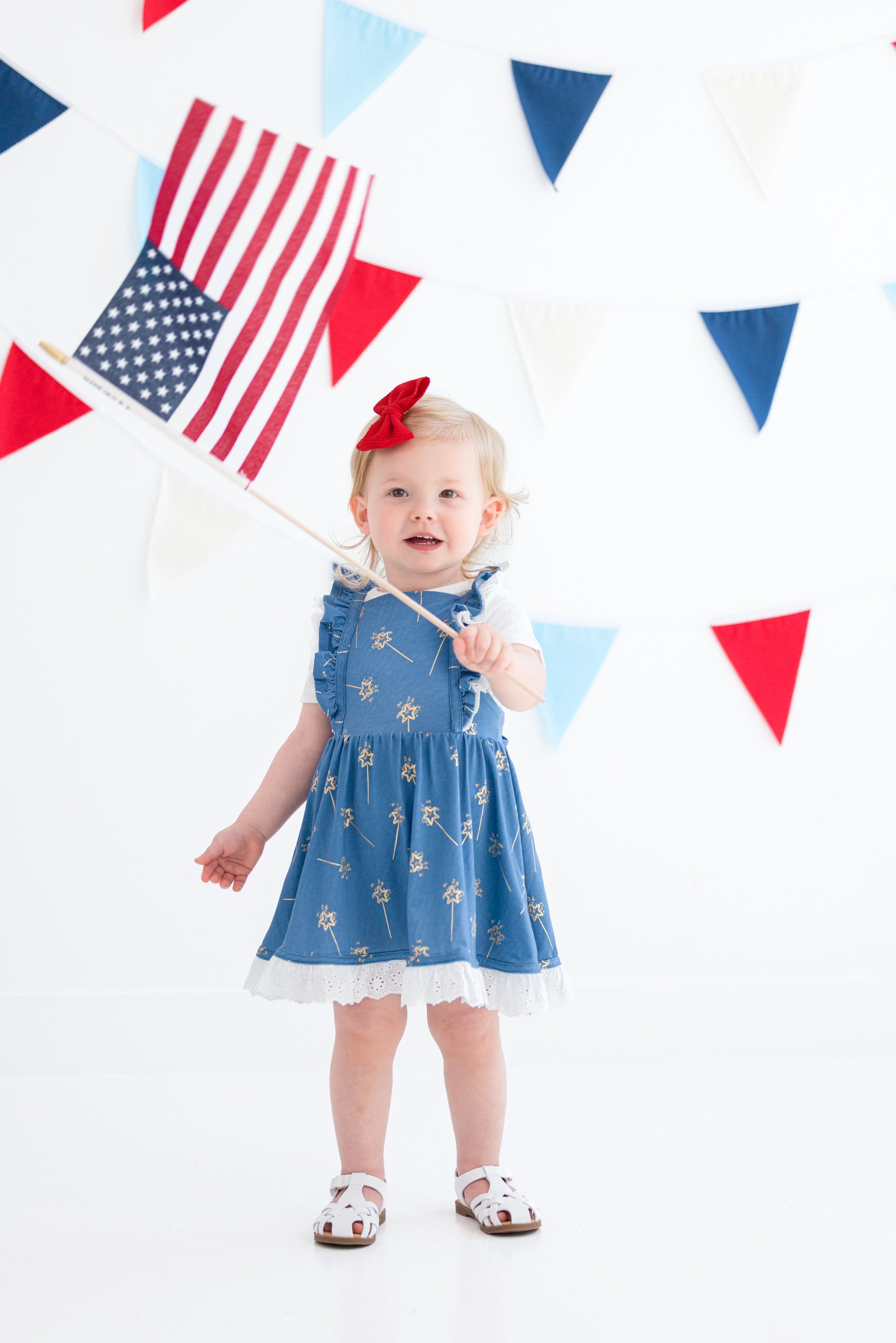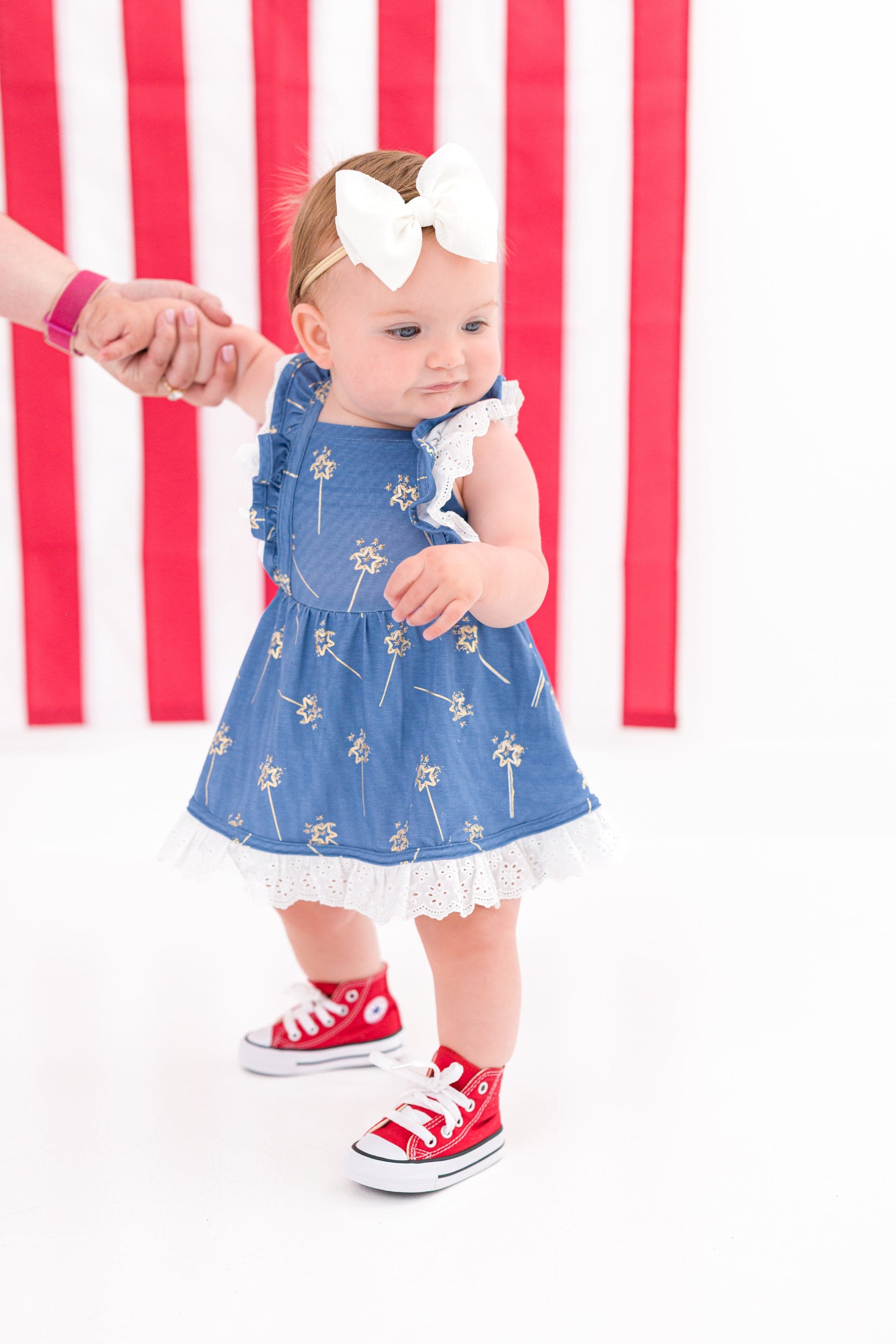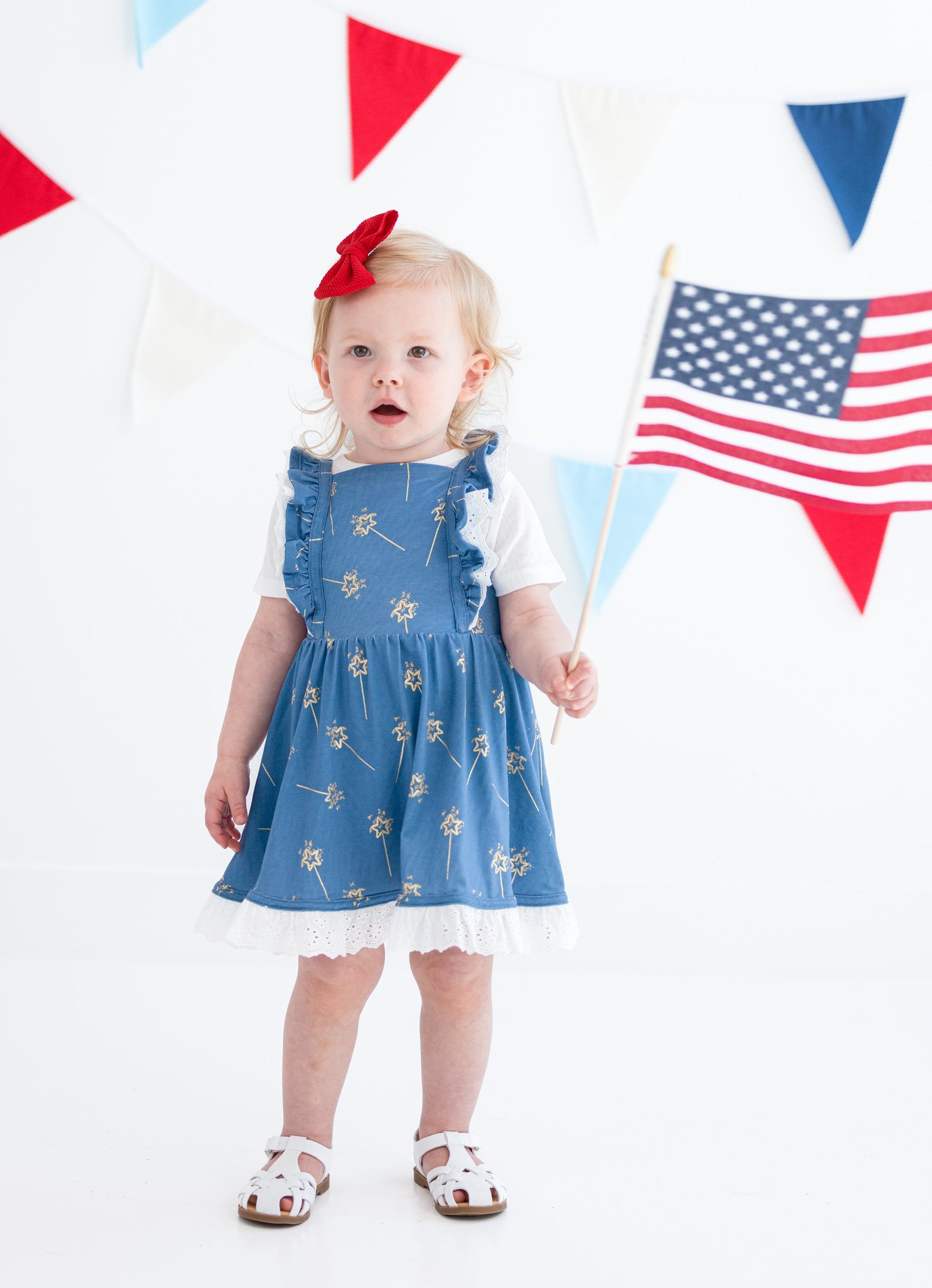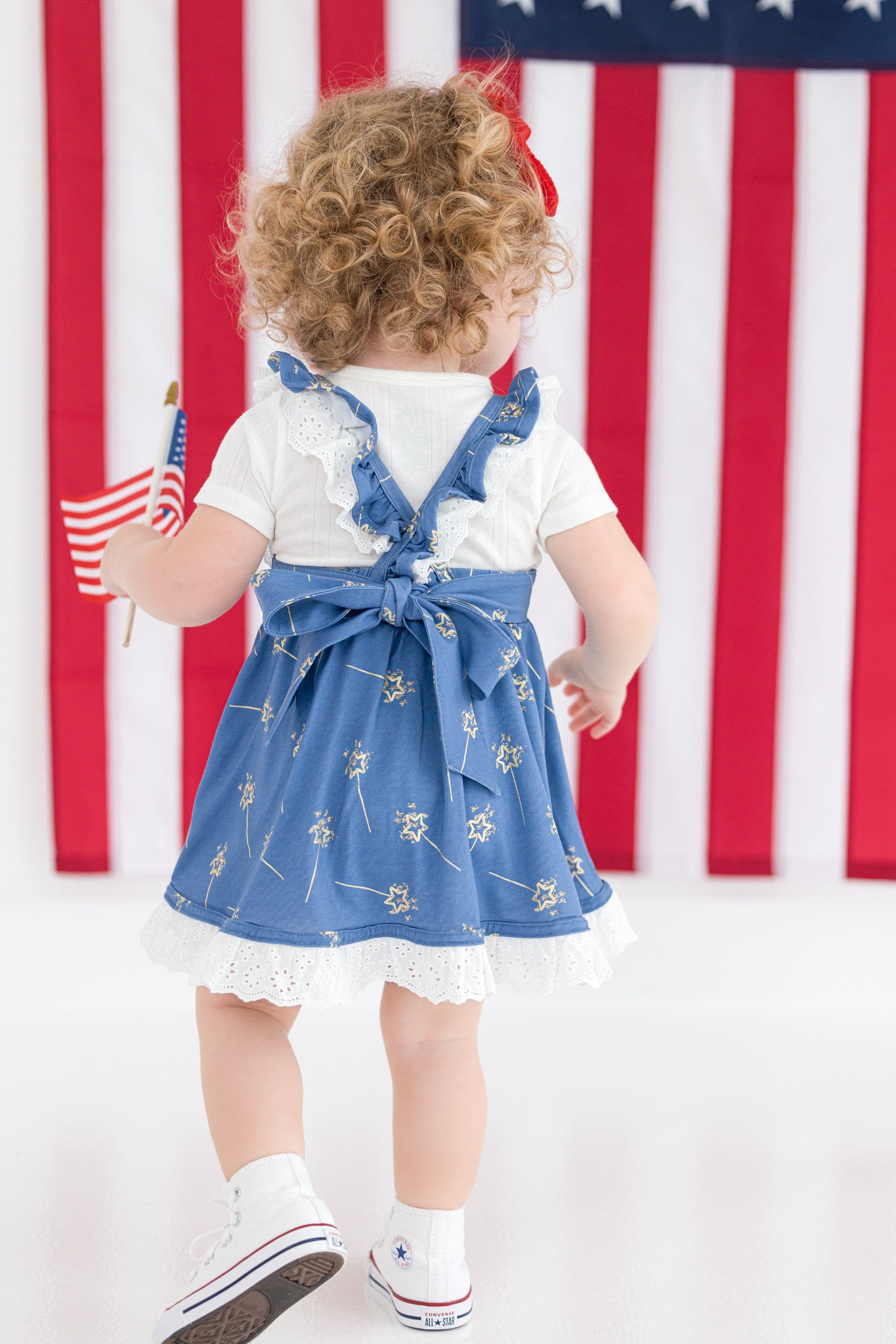 Designed with both comfort and charm in mind, this two-piece set is perfect for twirls, playdates, and patriotic celebrations. The soft pointelle tee pairs effortlessly with the printed twirl dress, featuring dainty ruffle straps and a sweet eyelet lace hem. Crafted from our signature bamboo blend, it’s lightweight, stretchy, and gentle on sensitive skin—ideal for all-day fun in the sun.