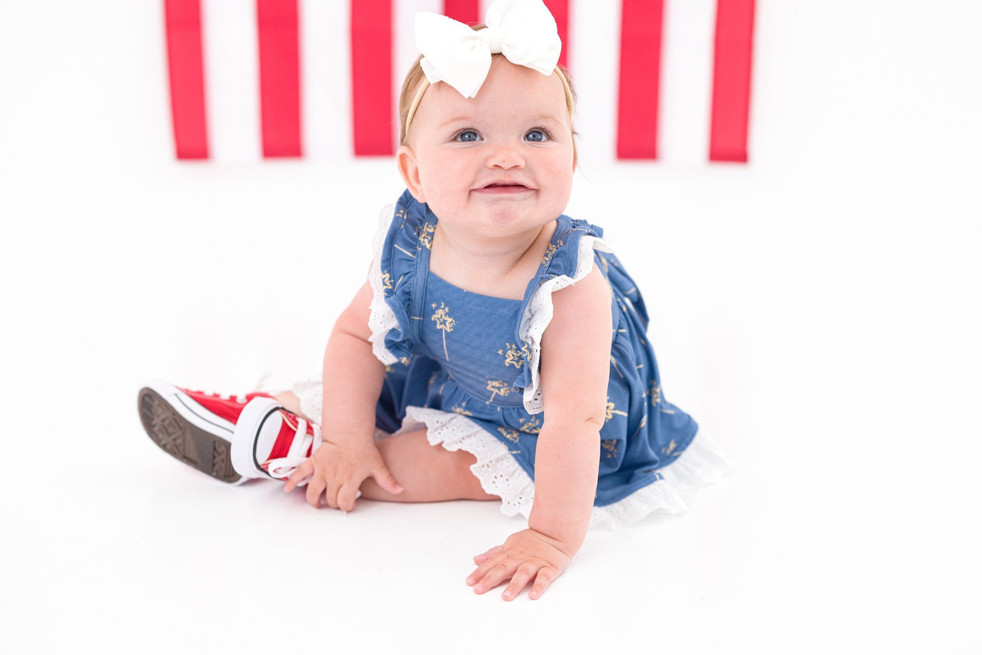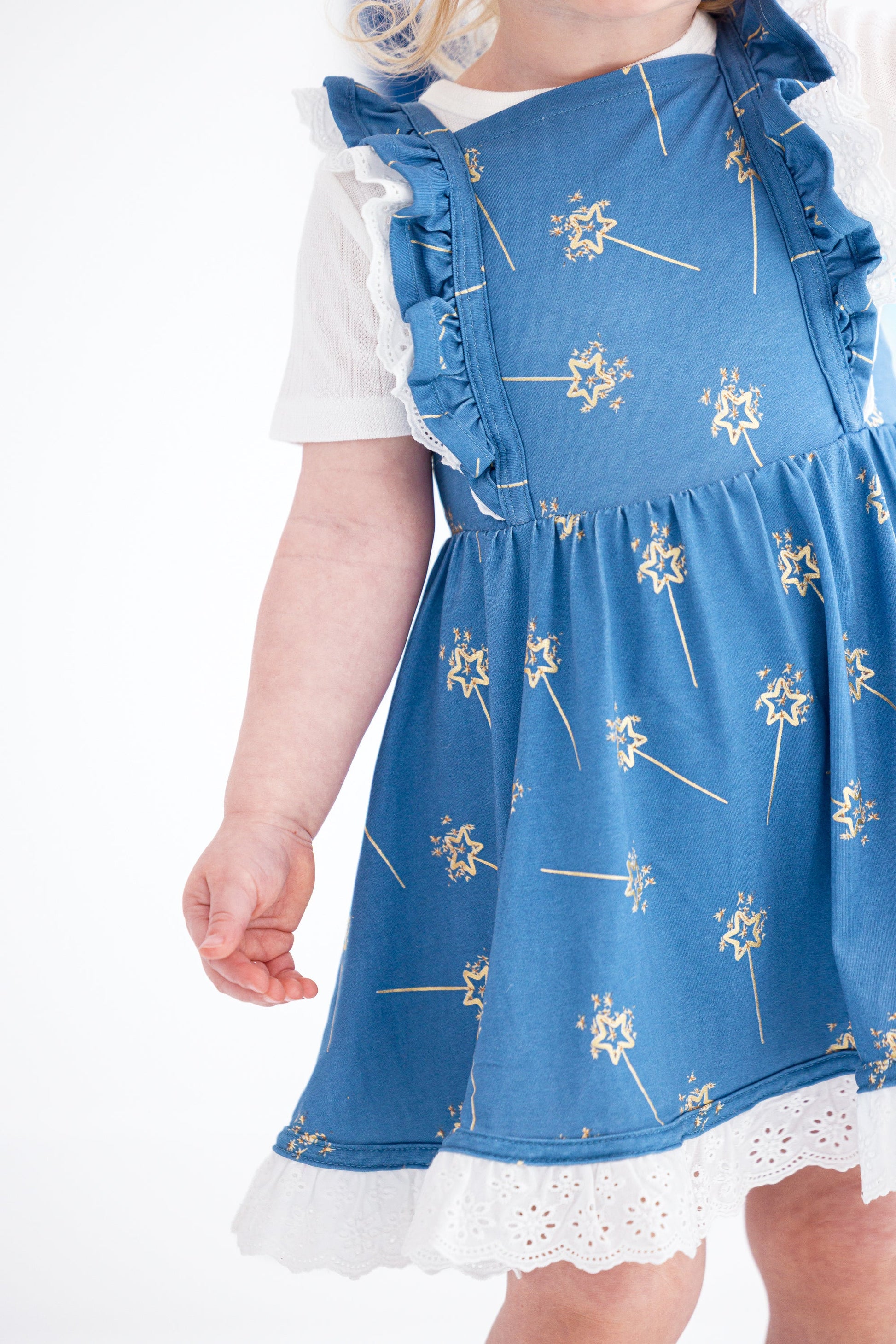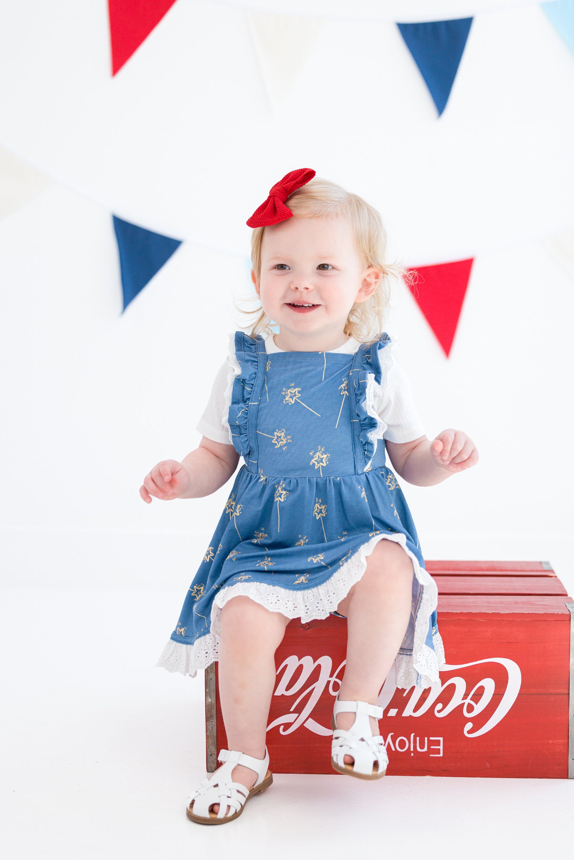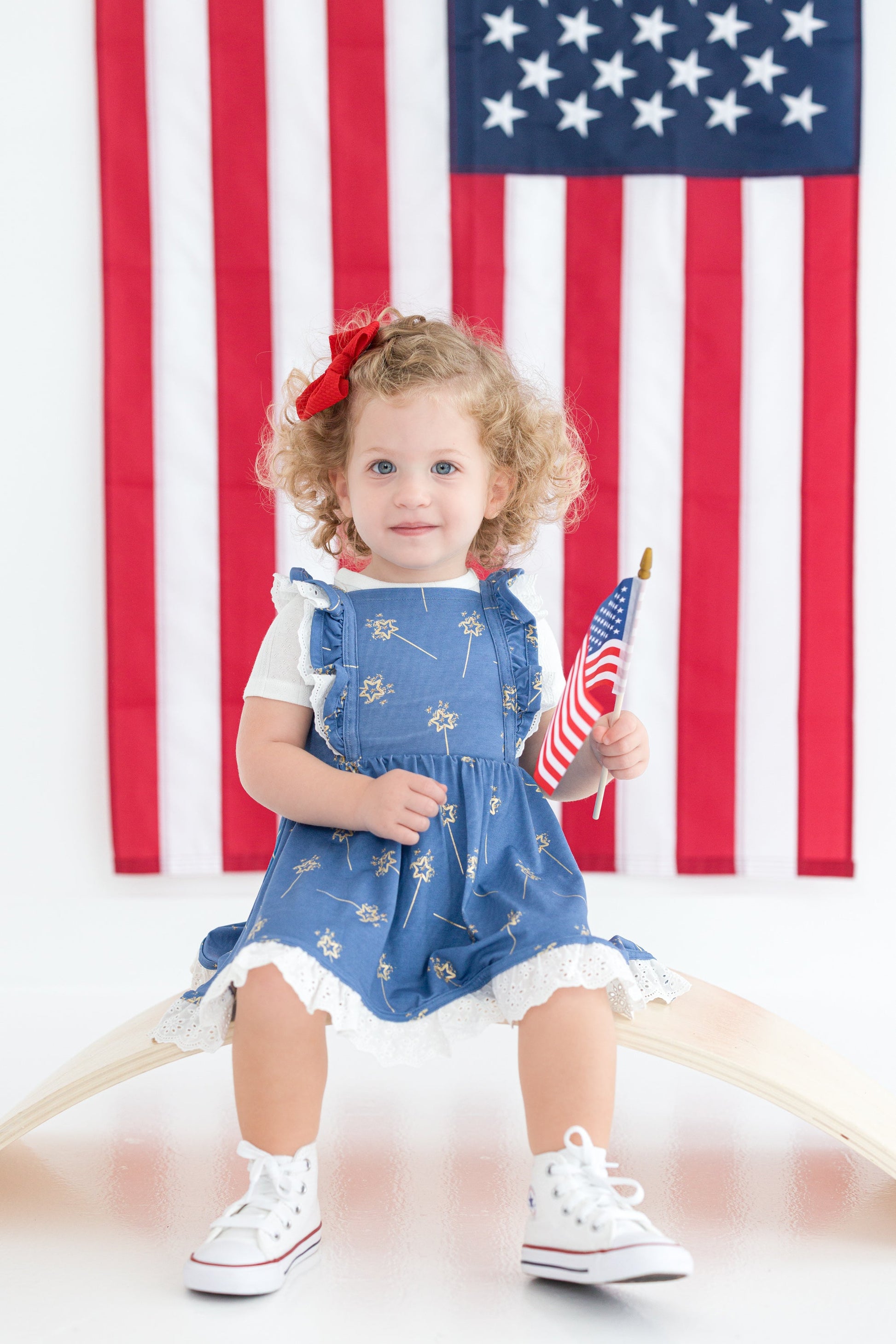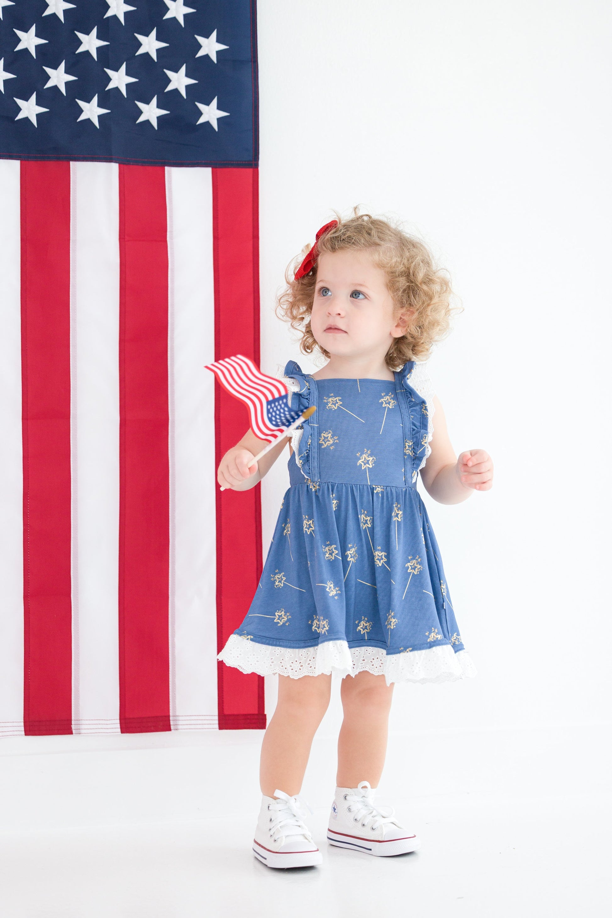 Designed with both comfort and charm in mind, this two-piece set is perfect for twirls, playdates, and patriotic celebrations. The soft pointelle tee pairs effortlessly with the printed twirl dress, featuring dainty ruffle straps and a sweet eyelet lace hem. Crafted from our signature bamboo blend, it’s lightweight, stretchy, and gentle on sensitive skin—ideal for all-day fun in the sun.