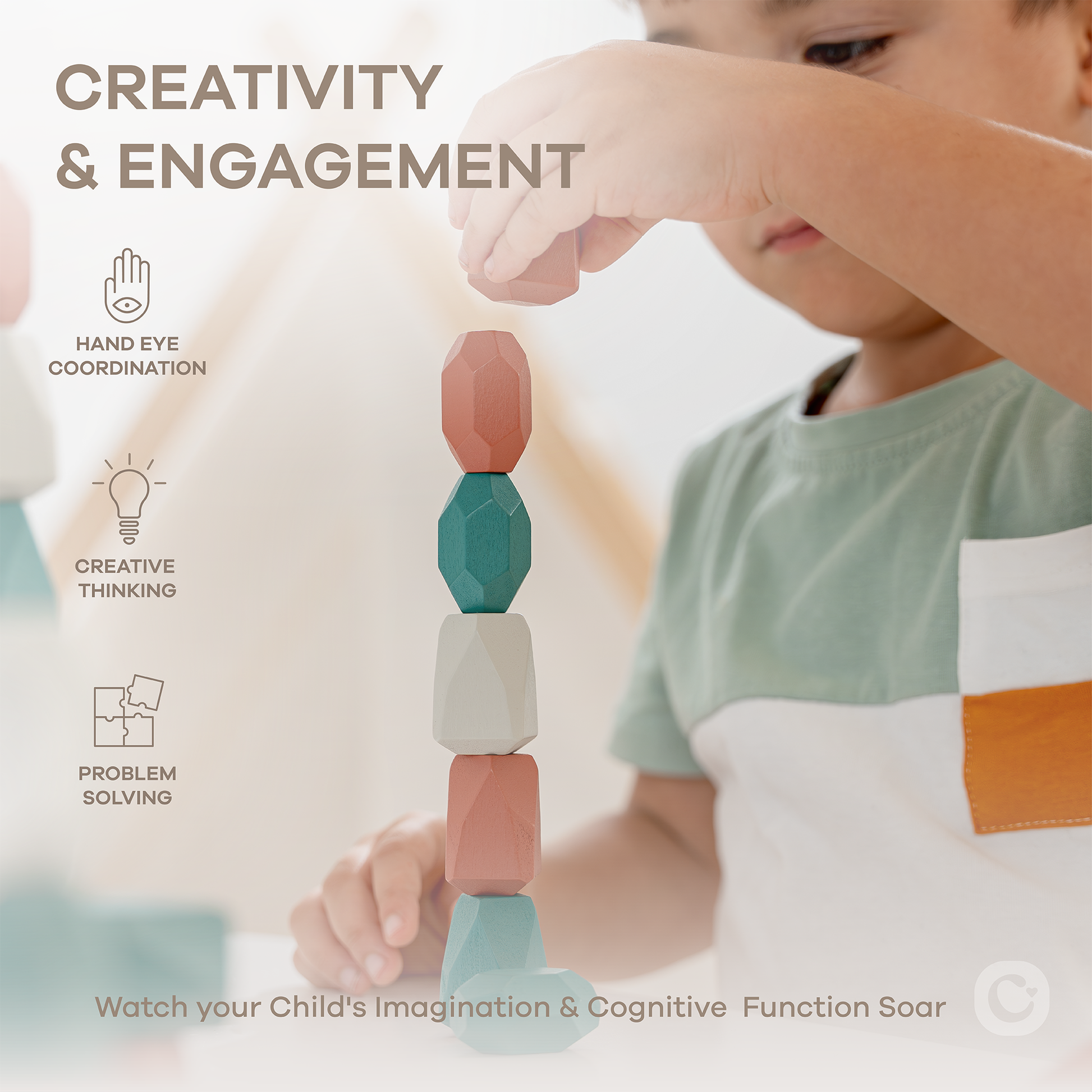 Watch your Child's Imagination Soar: See the joy and wonder in their eyes as they build, create, and explore with 36 colorful wooden stacking rocks. Comfy Cubs toy rocks are designed to stimulate their creativity and enhance their playtime experiences.