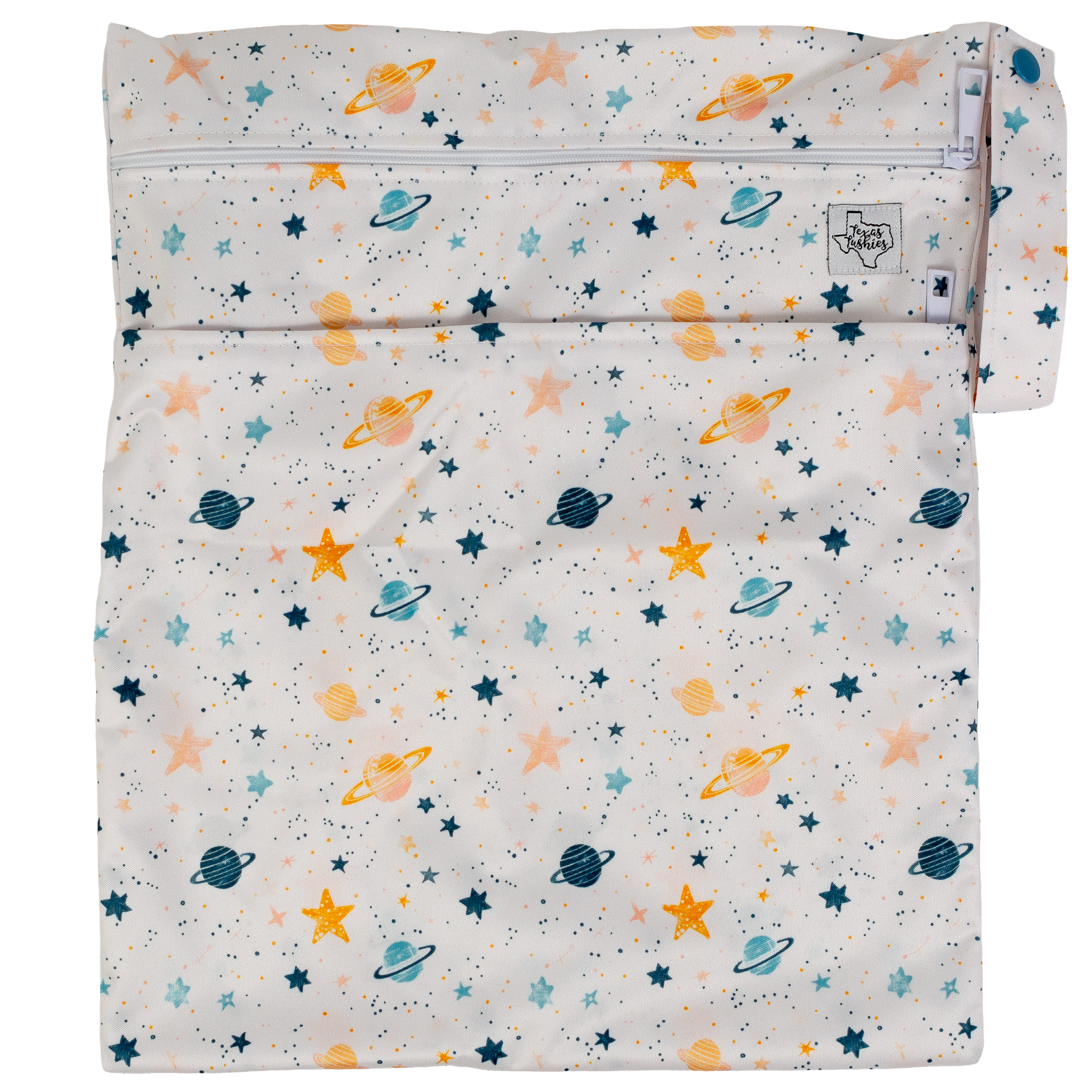 Texas Tushies Wet/Dry bags are designed to hold your dirty cloth diapers or other messes on the go. Perfect for a trip out, these bags feature two compartments for your wet or dry items. Machine washable, hang to dry for best results.
