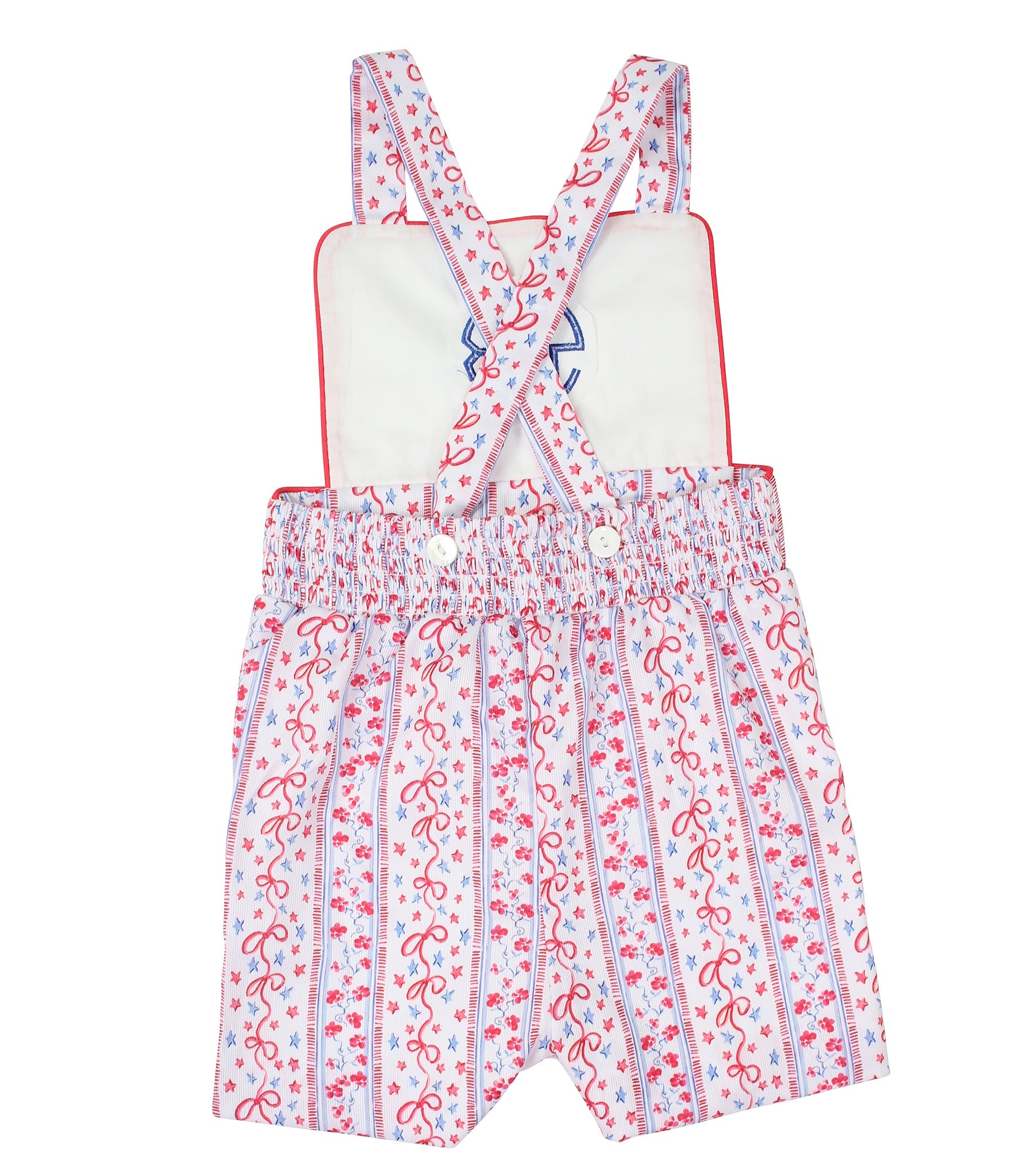 Let the patriotic celebrations begin! Festive and charming this Stars and Stripes Shortall is sure to light up your little ones wardrobe. Shortall features criss cross adjustable straps, decorative pockets, and bib front to add a name or monogram. Metal snaps in stride, 100% cotton.