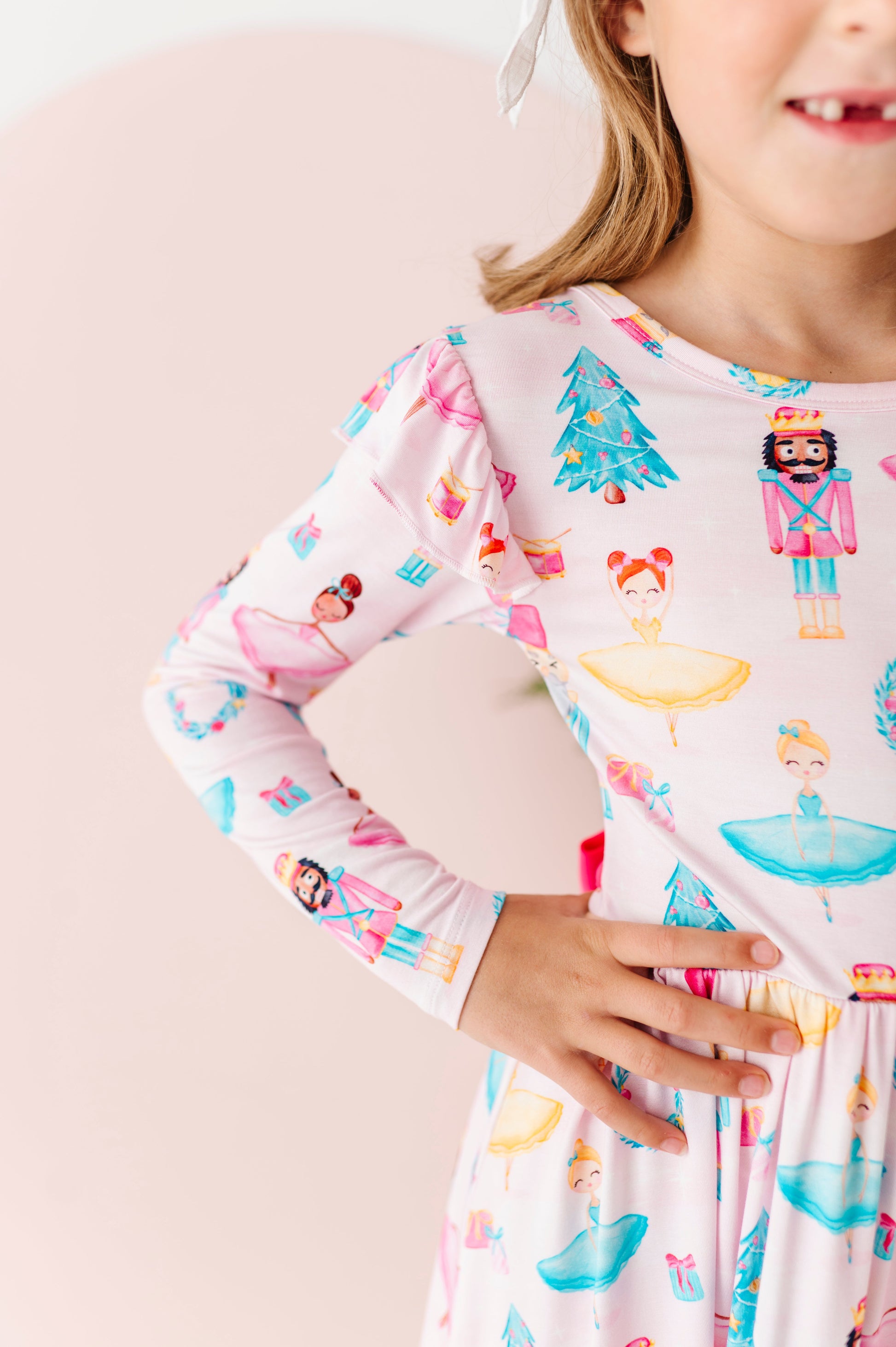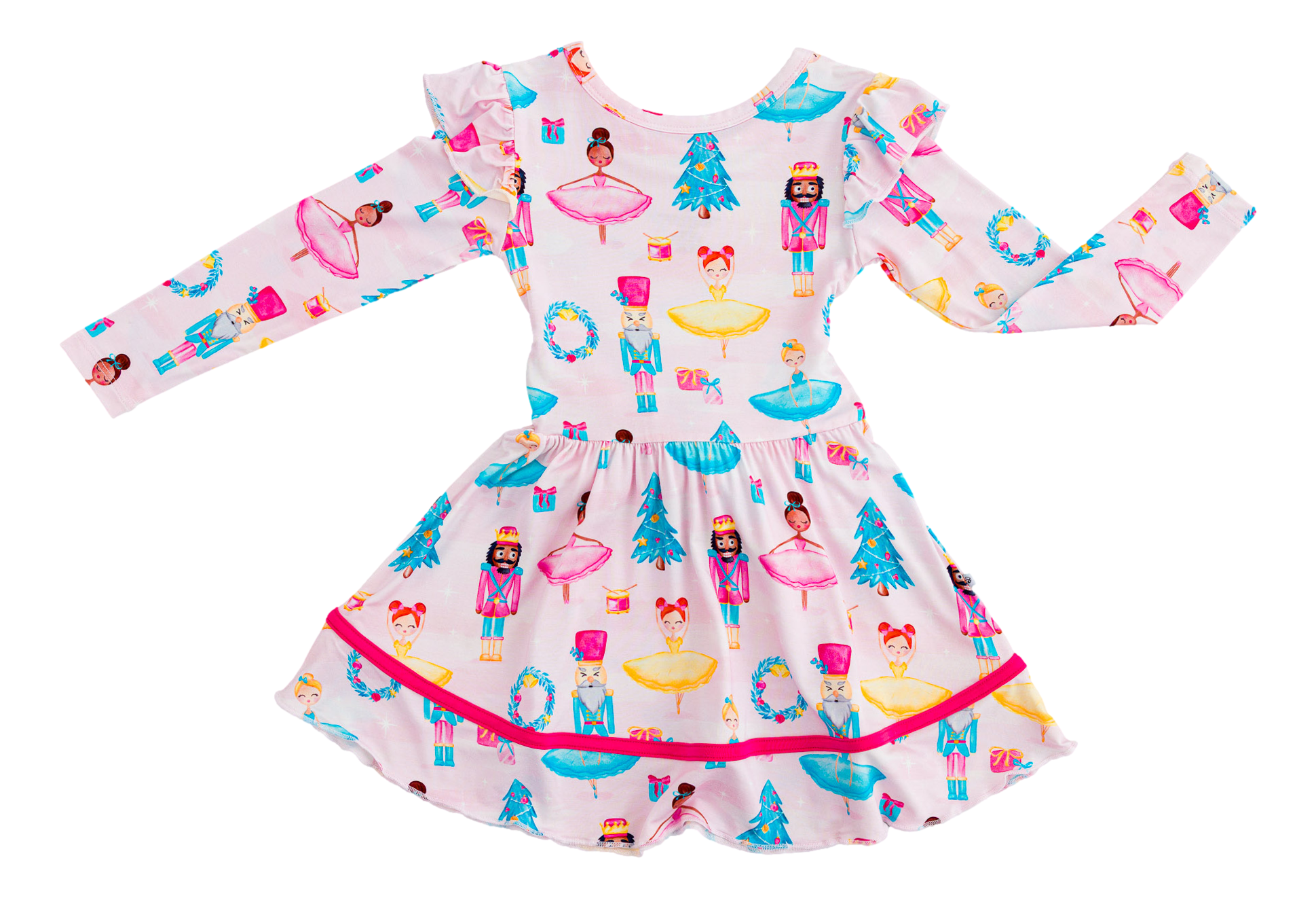 Let the holiday magic begin! This adorable dress brings the enchantment of the season to life with a whimsical print featuring ballerinas, nutcrackers, trees, and festive wreaths — all in a sweet pastel palette. Designed with a tiered ruffle hem and oversized bow at the back, this dress is picture-perfect for holiday performances, parties, or just dancing through December.