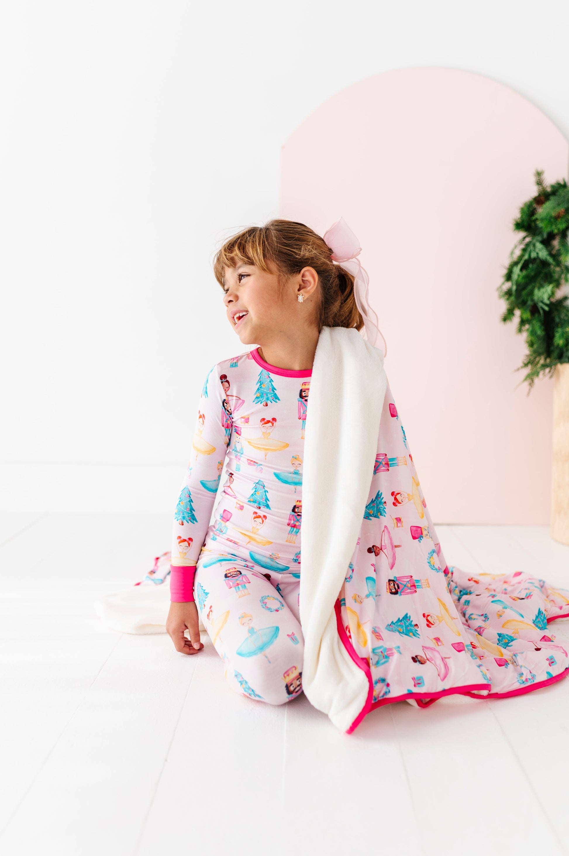 Wrap your little one in holiday magic. Our plush toddler blanket pairs a buttery-soft bamboo viscose knit front with an ultra-cozy plush backing—light enough for daily snuggles, warm enough for couch cuddles and bedtime stories. The whimsical Nutcracker print (ballerinas, toy soldiers, wreaths, and gifts) adds a twirl of cheer to every nap and movie night.