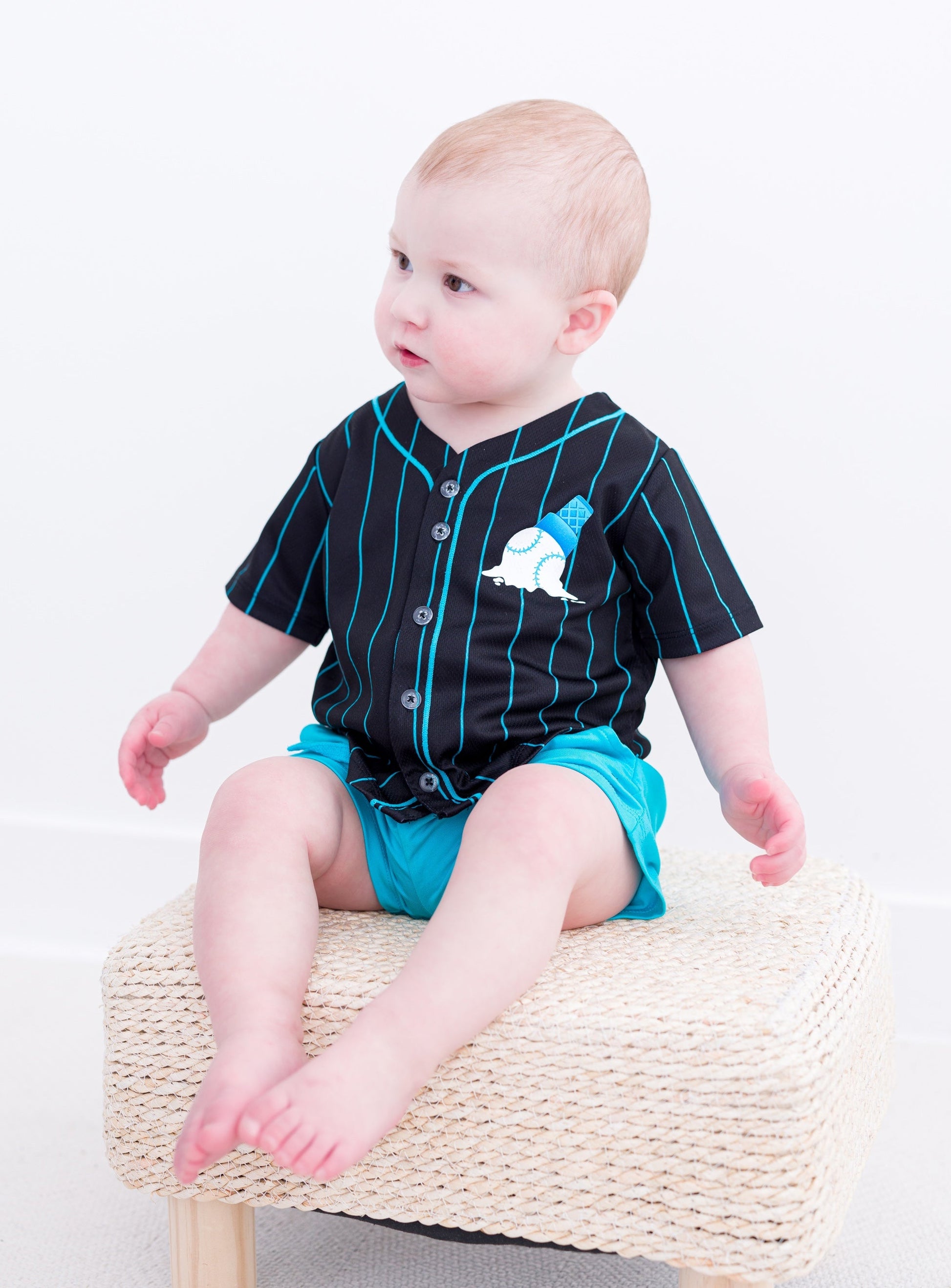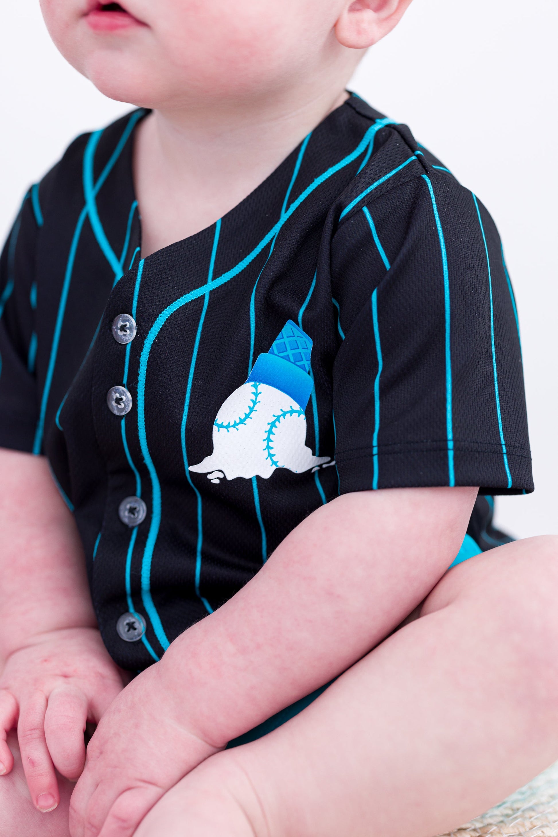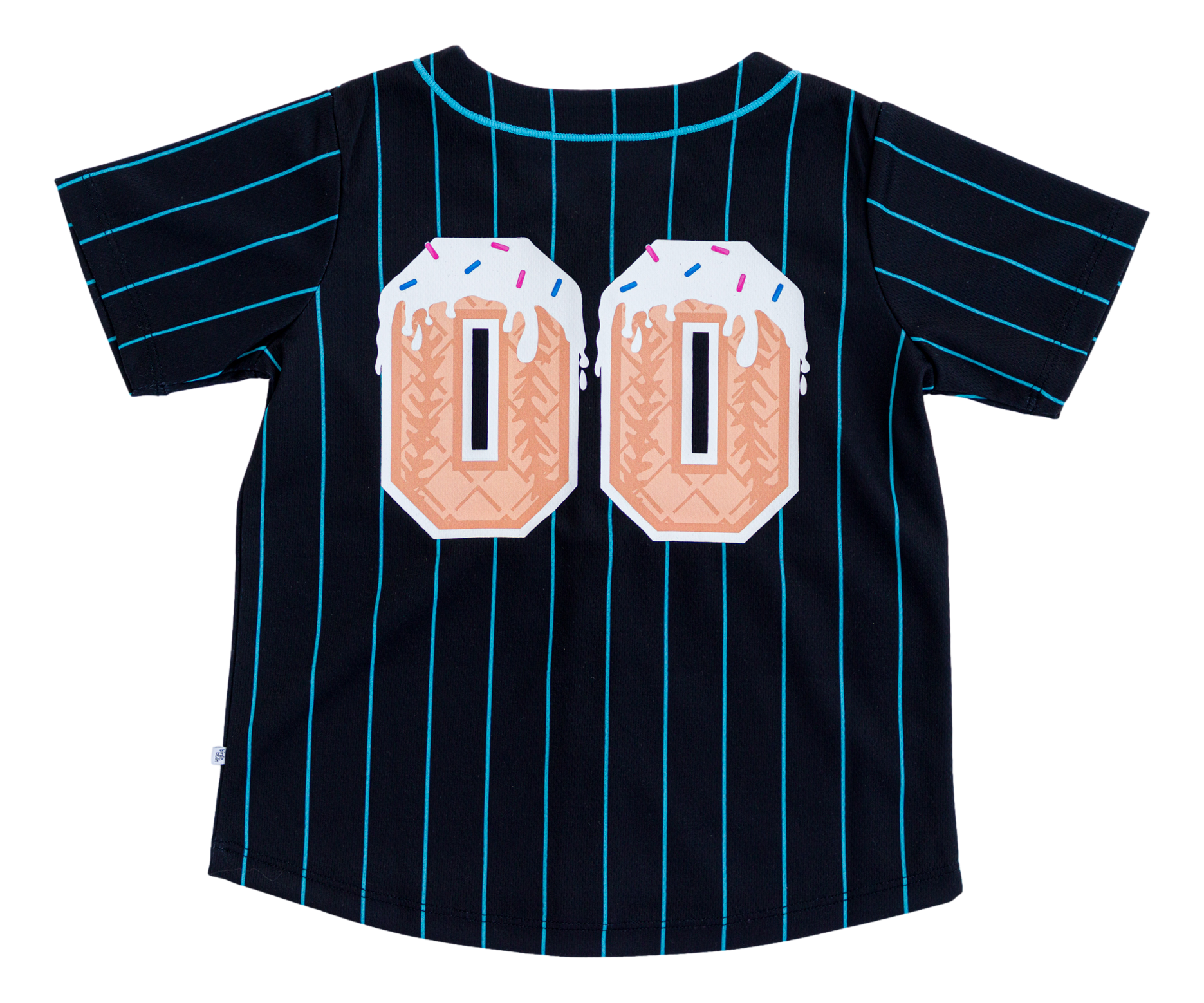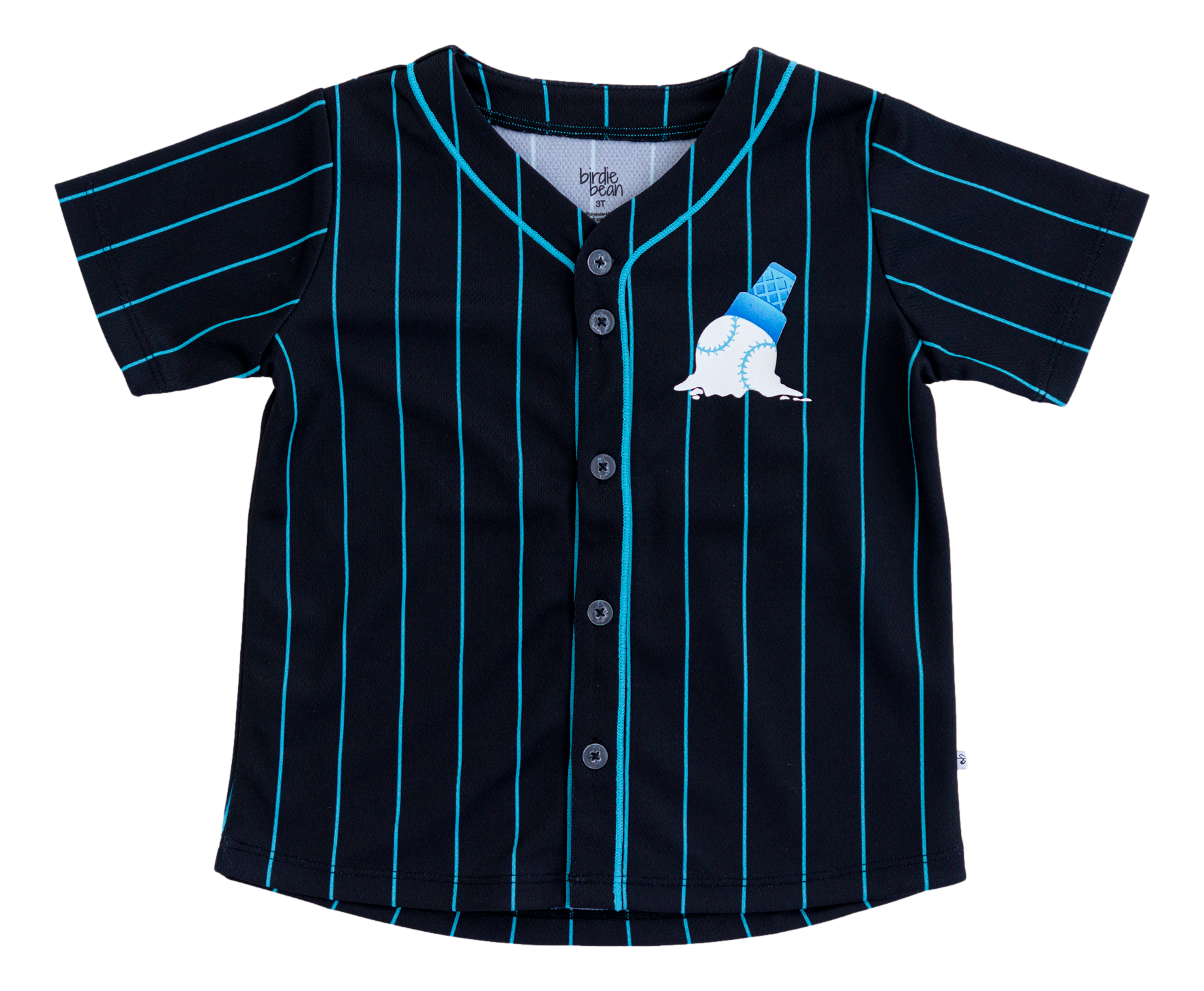 Hit a home run in style with the Sundae Sluggers Jersey! Featuring a sleek black and blue pinstripe design with vibrant accents, this jersey brings the perfect blend of sporty and sweet. The front showcases a playful baseball ice cream cone graphic, while the back delivers major league vibes with bold, waffle cone-inspired numbering. Whether it’s game day or just an everyday adventure, this jersey is sure to be a fan favorite!