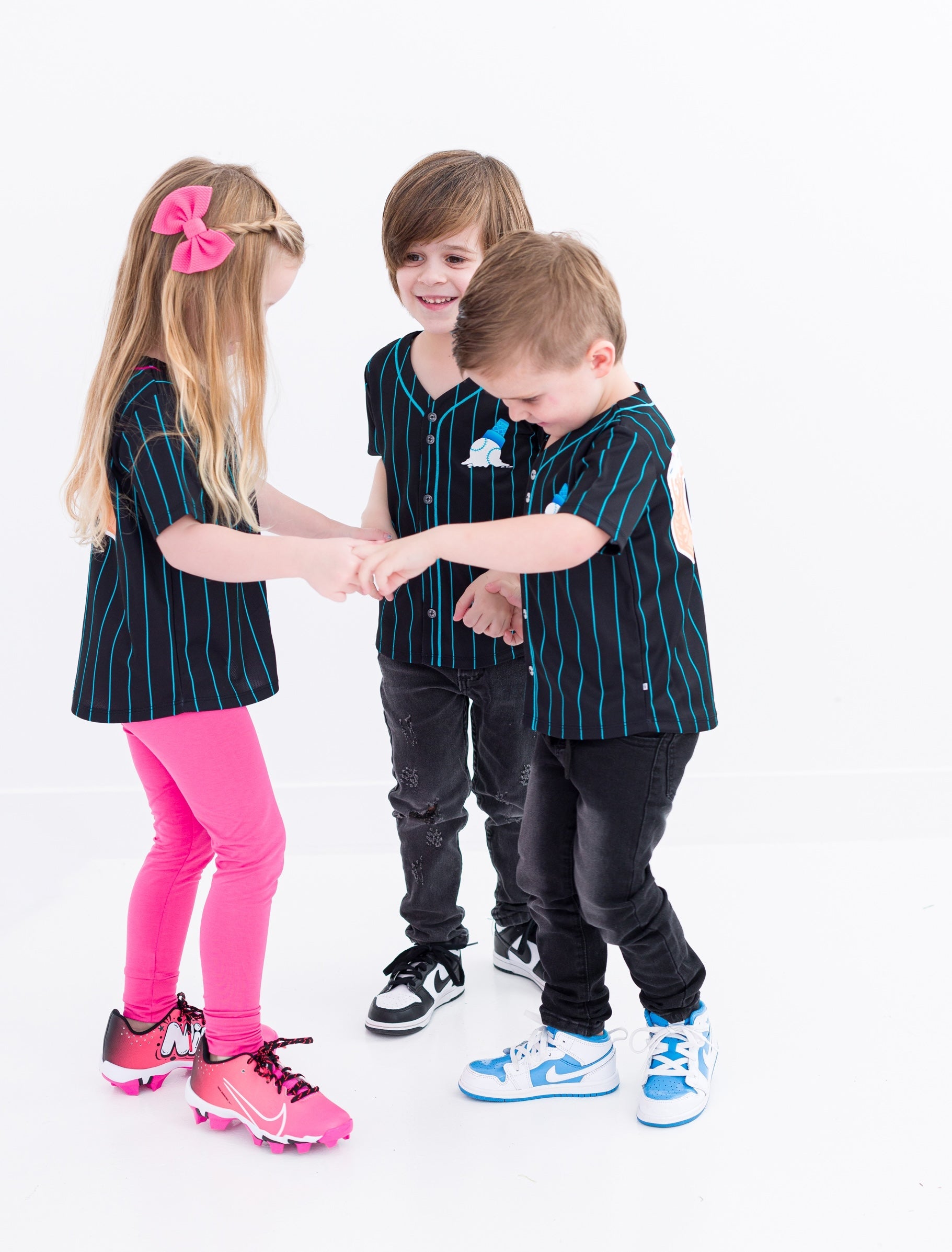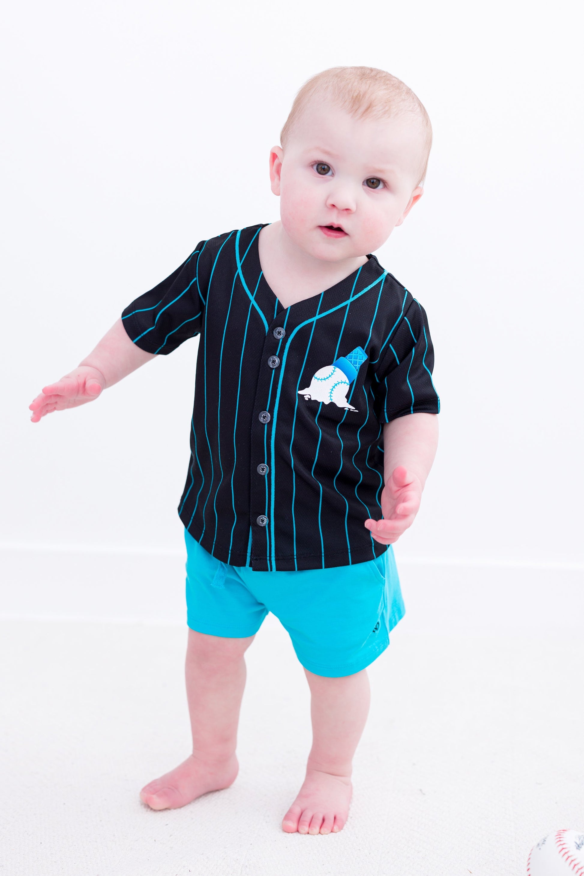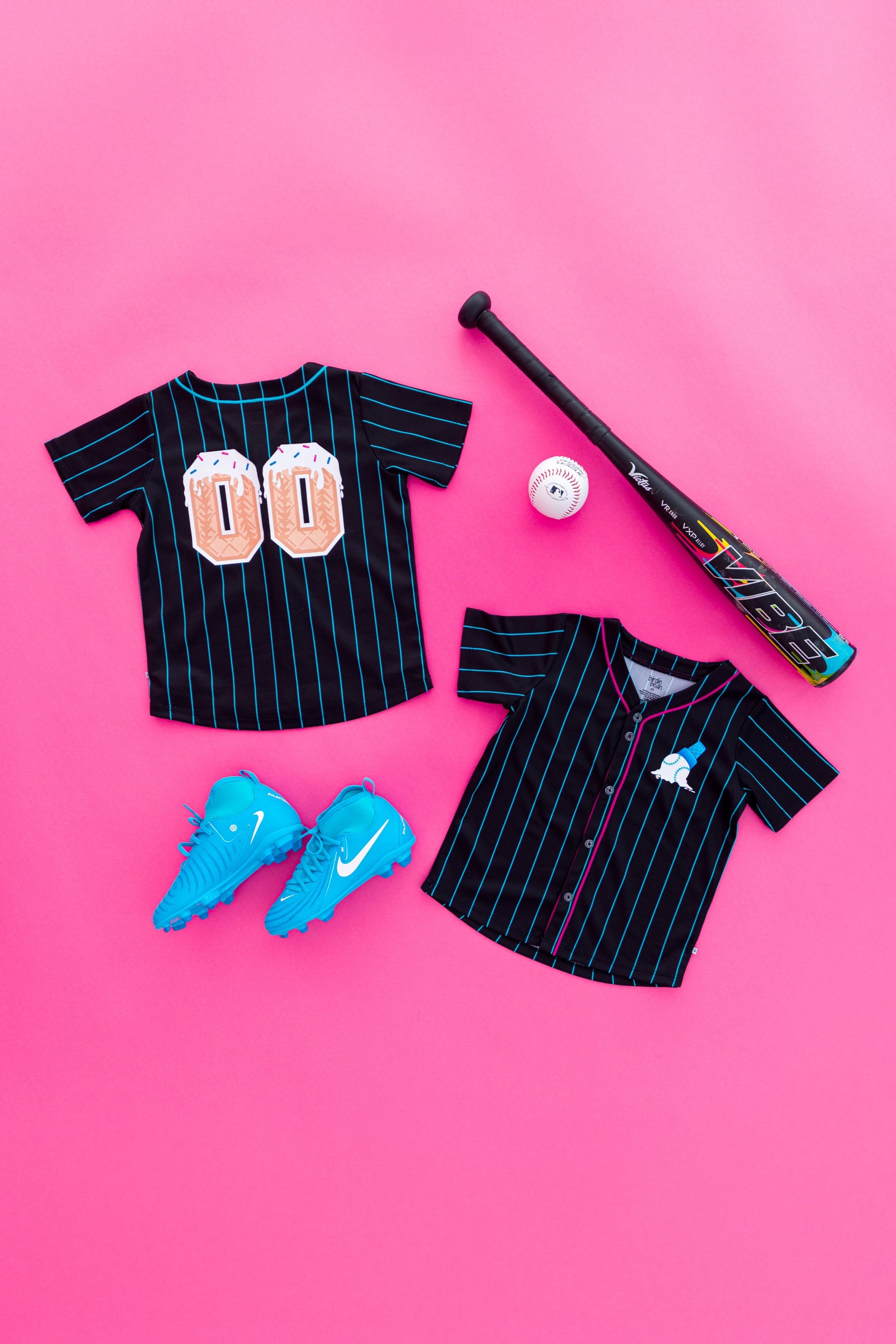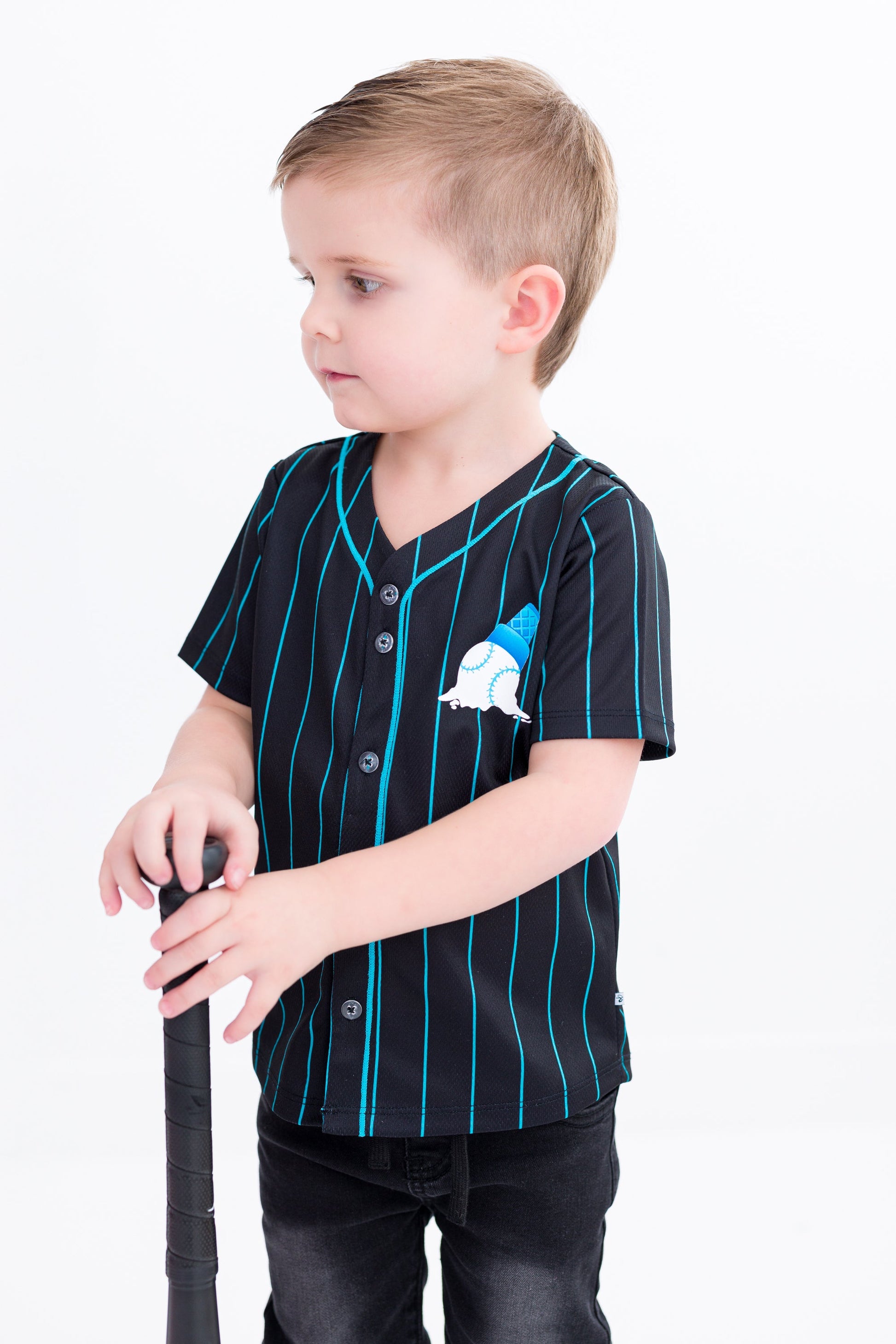 Hit a home run in style with the Sundae Sluggers Jersey! Featuring a sleek black and blue pinstripe design with vibrant accents, this jersey brings the perfect blend of sporty and sweet. The front showcases a playful baseball ice cream cone graphic, while the back delivers major league vibes with bold, waffle cone-inspired numbering. Whether it’s game day or just an everyday adventure, this jersey is sure to be a fan favorite!