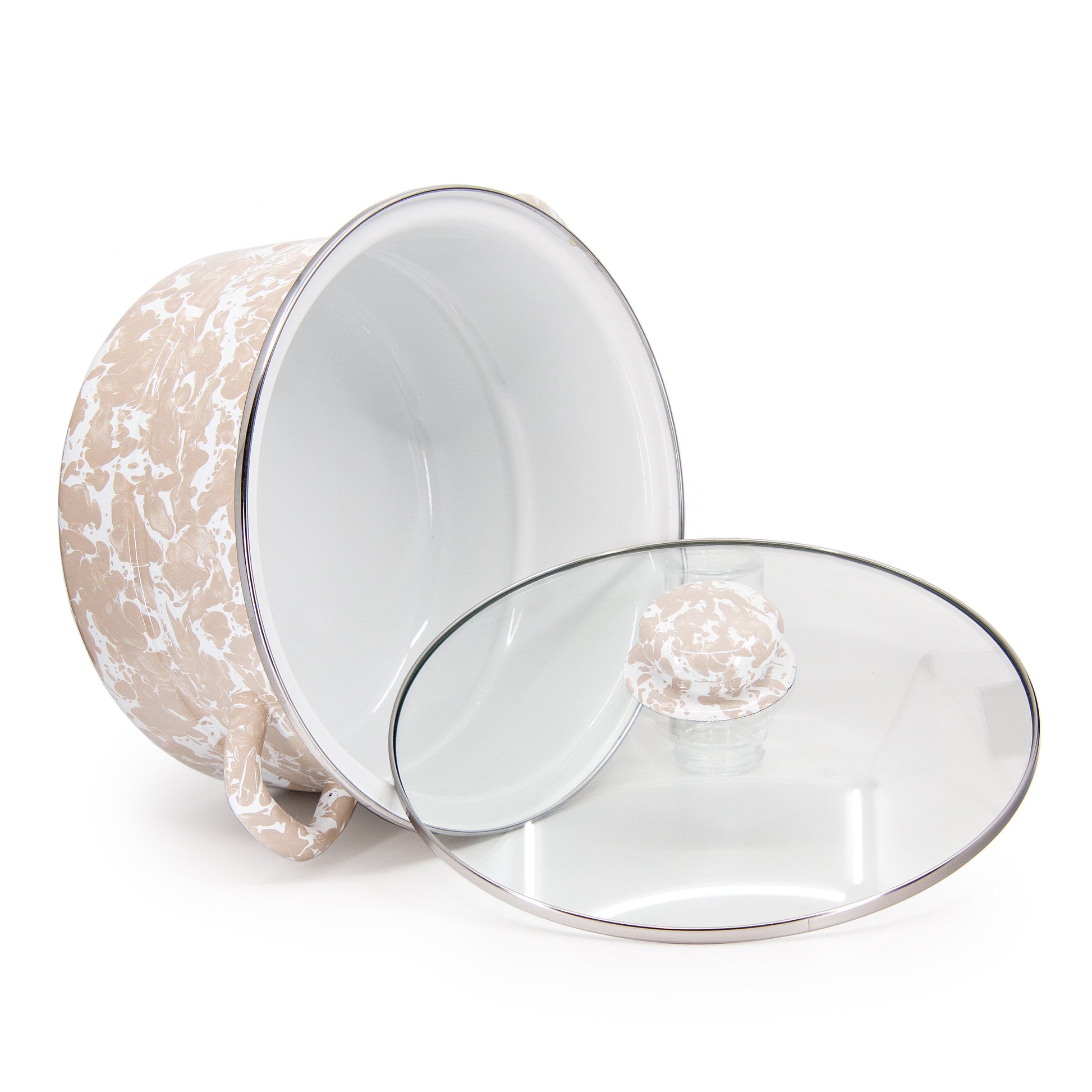 Sophisticated and practical, the Taupe Swirl 6 Qt Stock Pot brings a touch of elegance to your kitchen. Featuring a neutral taupe swirl design, this enamelware pot is perfect for preparing soups, broths, and stews in style. Its large 6-quart capacity and durable enamel construction ensure long-lasting performance and easy cleaning.