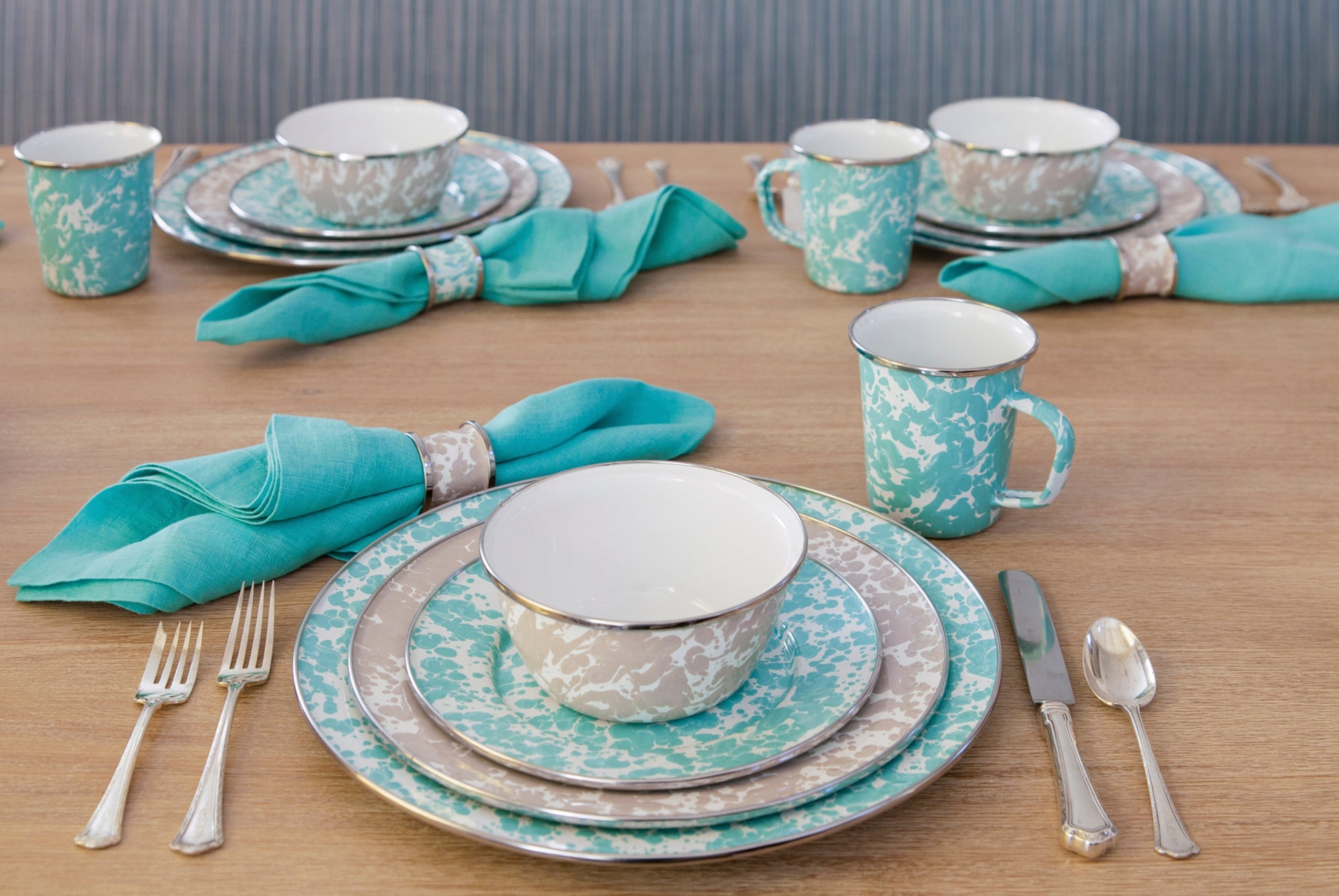 For a warm, neutral touch, the Taupe Swirl Salad Bowls are an elegant choice. Featuring a soft taupe swirl design, these enamel bowls are perfect for adding a cozy, understated style to your meals. The set of four bowls is perfect for salads, sides, or snacks and is ideal for both indoor and outdoor dining.