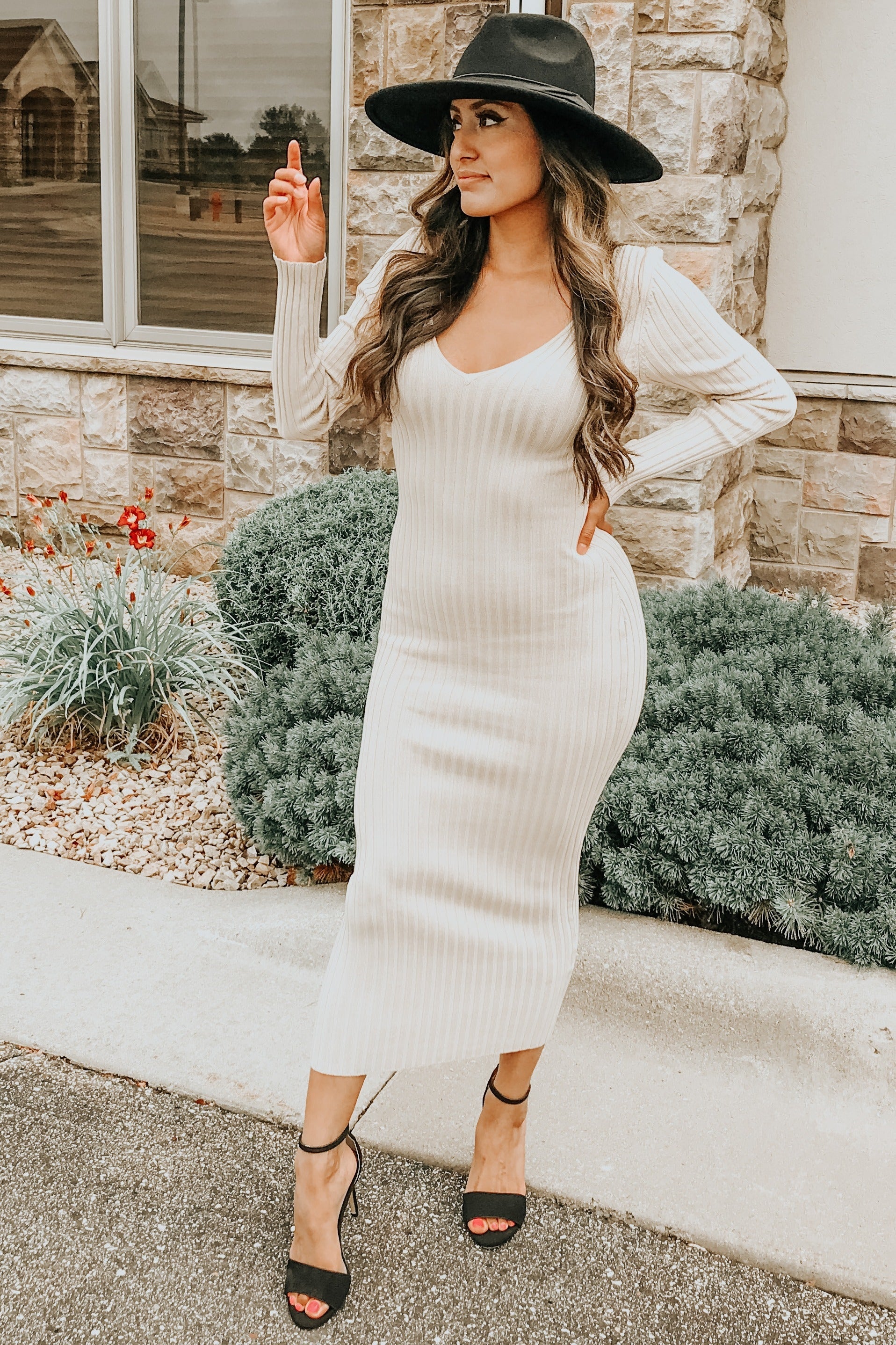 A solid hued fitted maxi dress featuring long sleeves and a v-neckline.