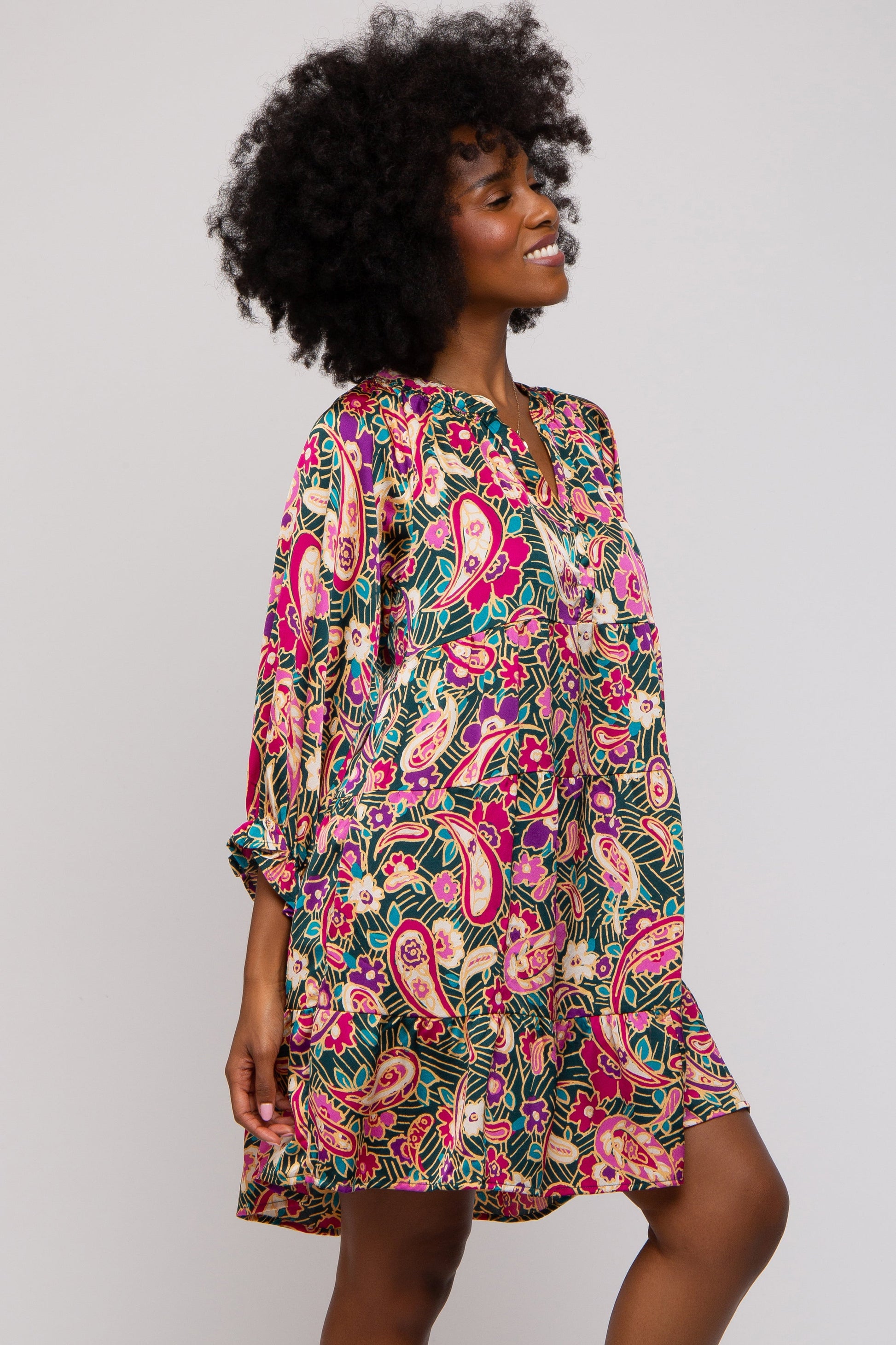 A floral print dress featuring a split v-neckline with a button front, a tiered skirt and 3/4 length sleeves with a ruffle trim.