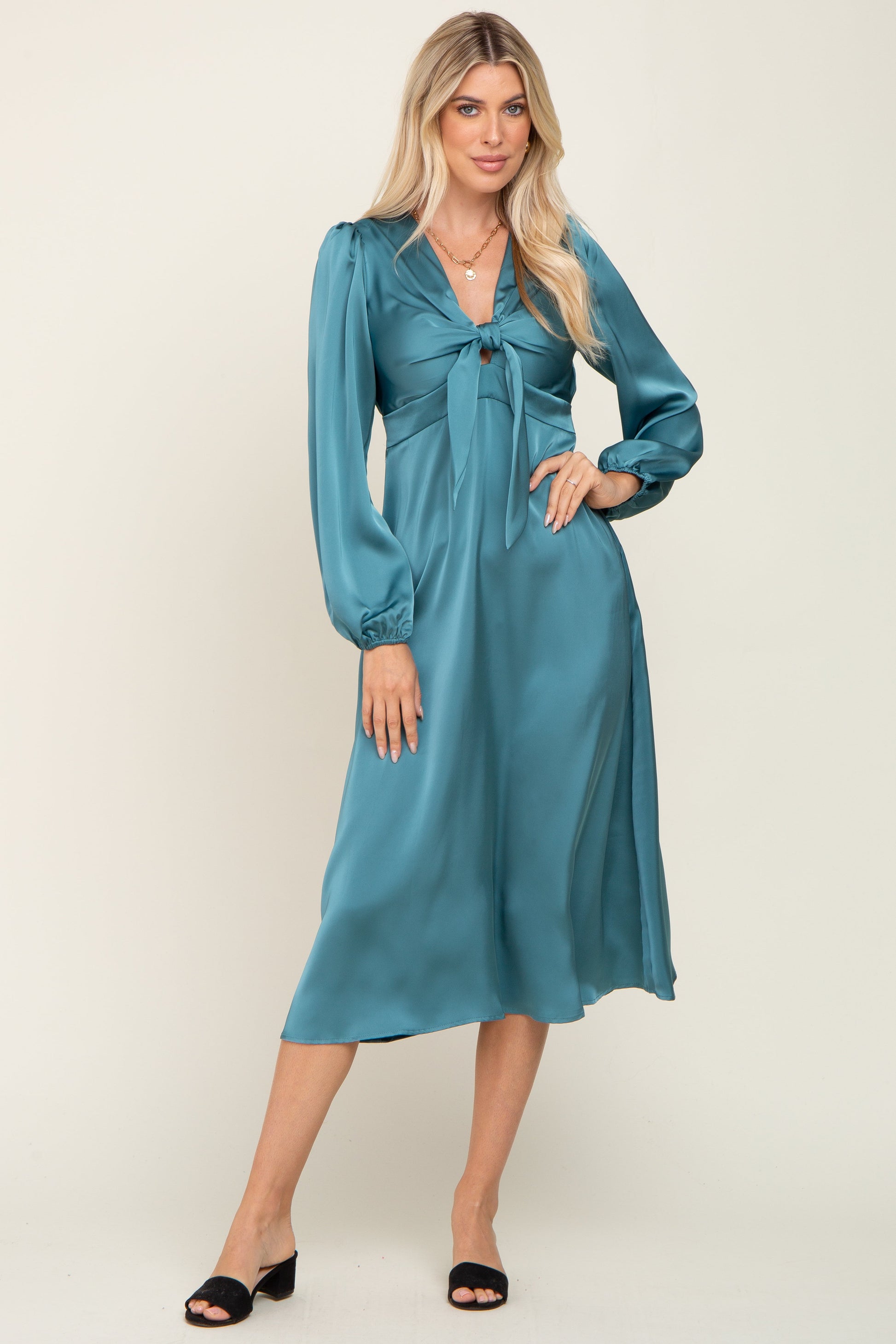 A solid satin midi dress with long sleeves. Features cutout bow tie front on bust. Hook eye zipper closure in back.