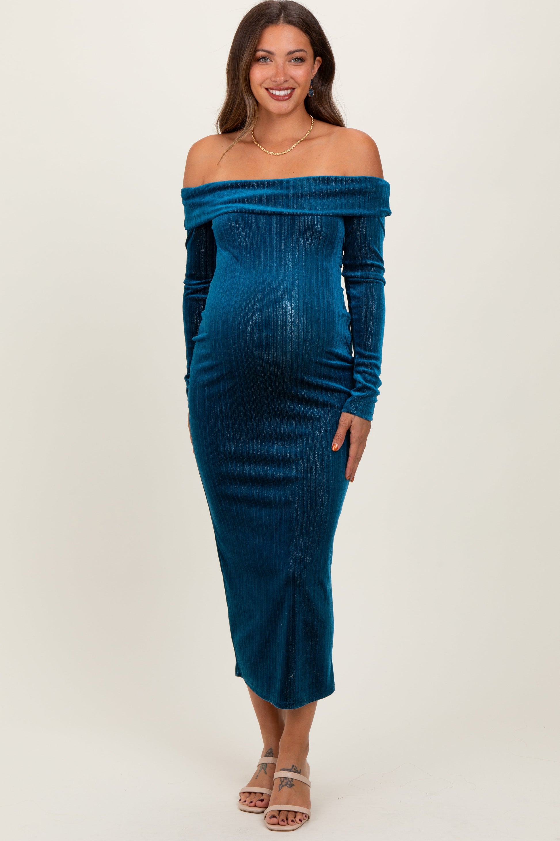 Teal Shiny Velour Off Shoulder Maternity Midi Dress