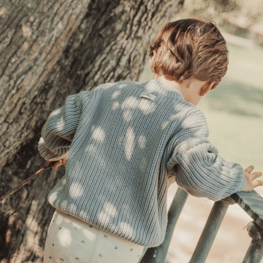With a relaxed fit, our loose-knit sweater made from 100% cotton is the cool weather essential that dreams are made of. Pair it with coordinating knit overalls or a knitted bloomer.
