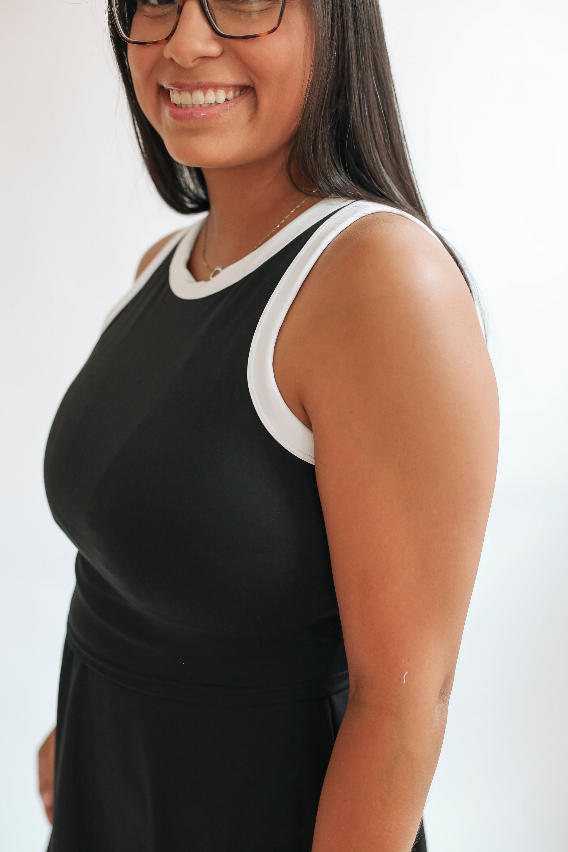 Sporty white trim + flowy skirt = cute meets functional