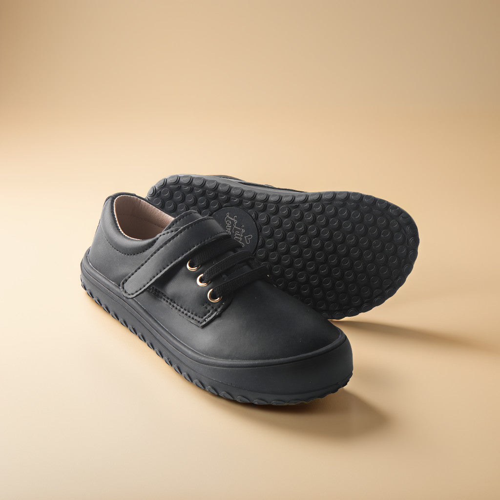 Our Latest Line of Play Perfects! Designed with active school days in mind, these barefoot-style shoes are built to withstand playground adventures. Available in sizes up to children's size 3, they feature a flat, flexible sole, wide toe box, and genuine leather for durability and style.