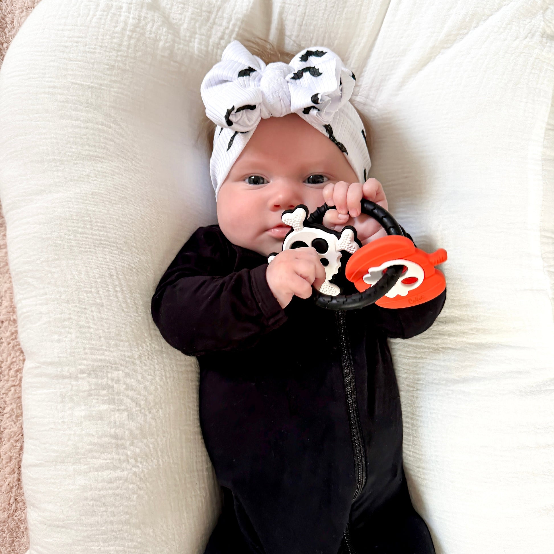 Say hello to our spooky teether - the perfect sidekick for your little one's teething journey this Halloween season! Made from 100% food-grade silicone, it's safe and gentle on delicate gums. The textured pumpkin and skull design offers varied sensory experiences that support your baby's development while soothing teething discomfort. Conveniently dishwasher, freezer, and microwave safe, it’s easy to clean and provides cool relief for those sore gums. Its compact size and lightweight design make it perfect for tiny hands to grasp, and it comes with a reusable pouch for on-the-go convenience. Give your baby the spooky comfort they deserve with our Spooky Teether—a fun blend of relief and sensory stimulation!