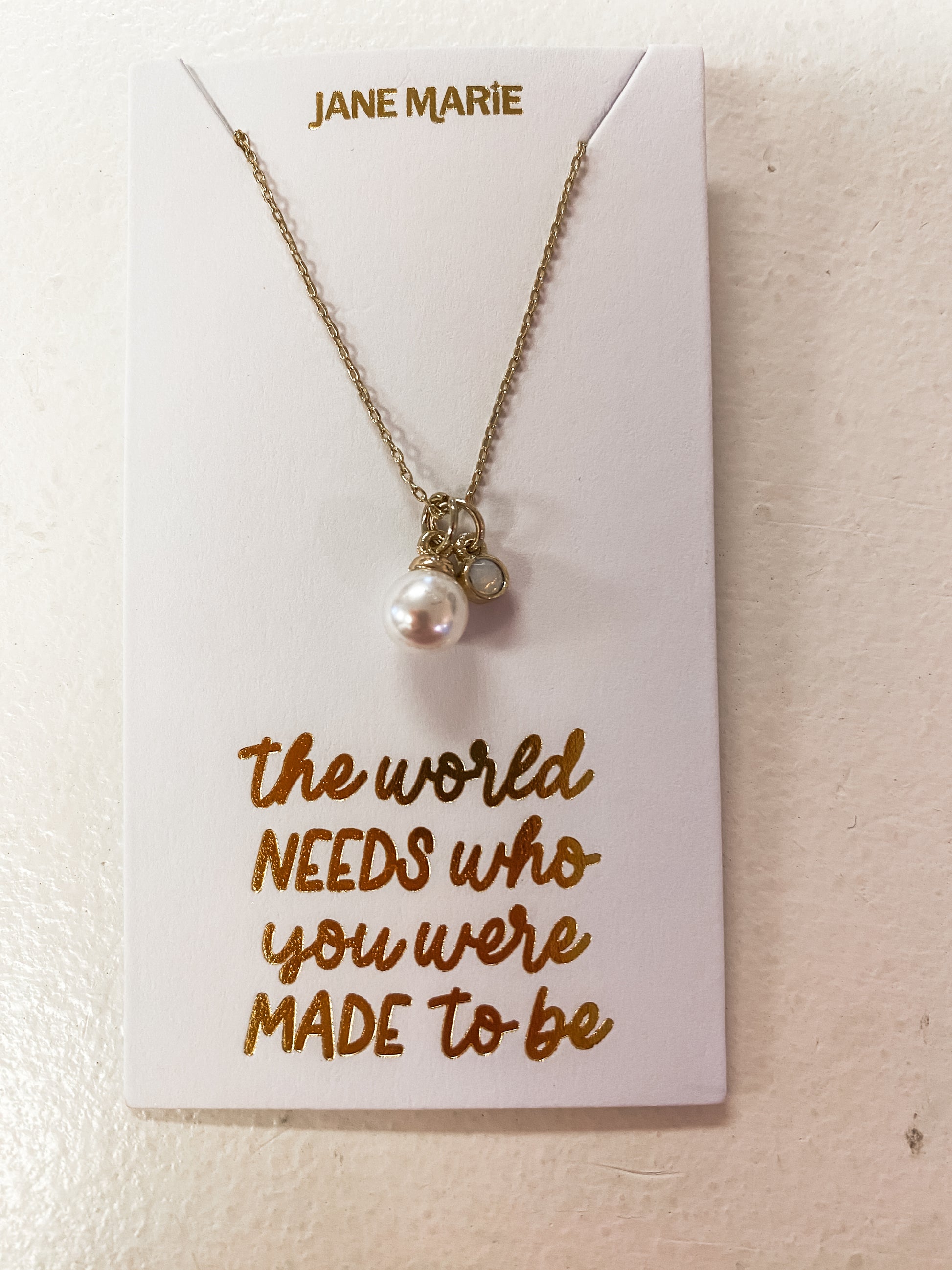 pearl moonstone charm necklace, the world needs who you were made to be necklace, Jane Marie Andie necklace, dainty gold necklace with pearl, inspirational gift necklace, boutique jewelry with meaning, minimalist charm necklace for women, layered necklace starter piece
