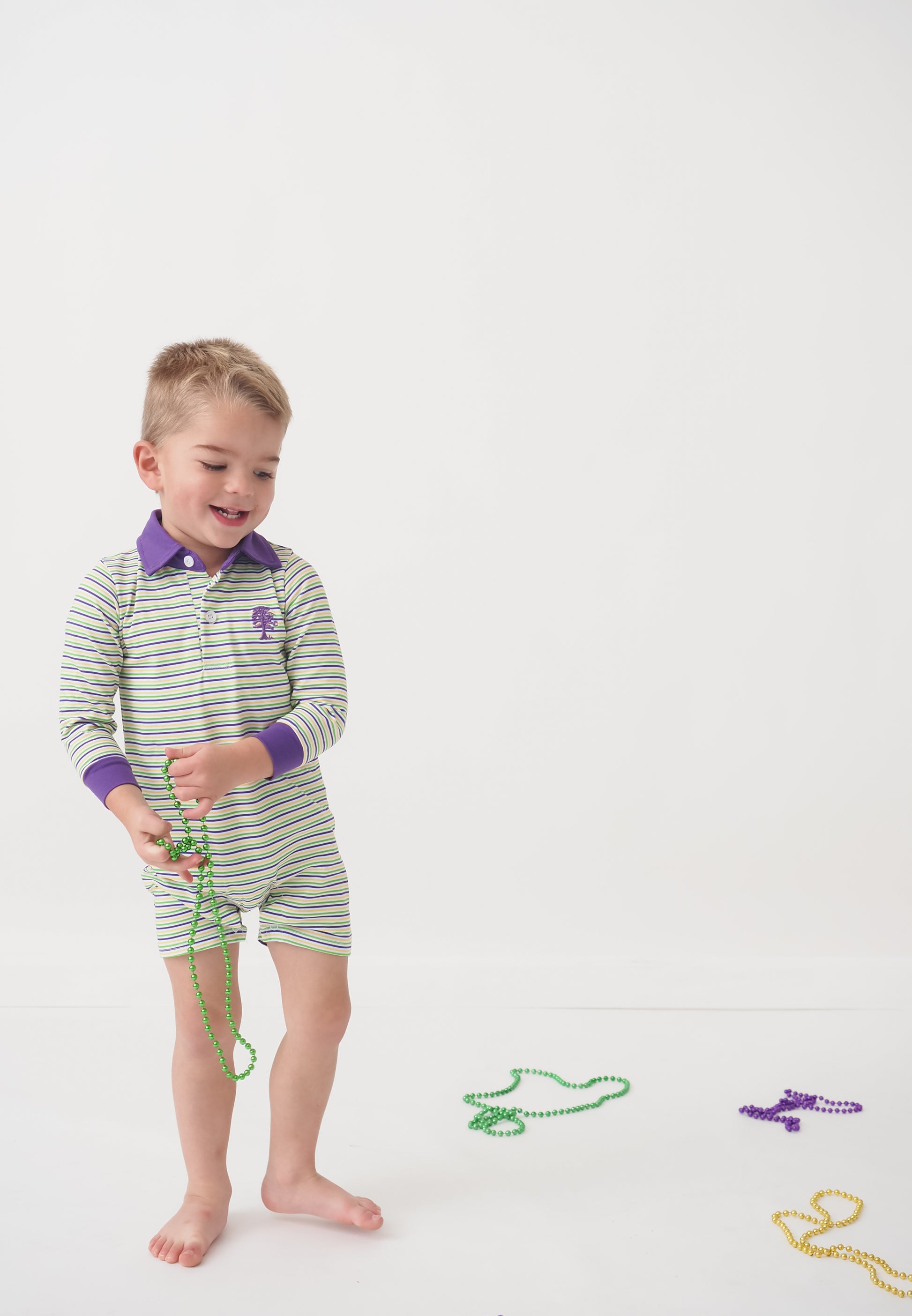 Made from soft, stretchy knit fabric with a classic purple polo collar and cuffed sleeves, this romper keeps him comfy for all-day celebrating. Whether he’s catching beads, watching floats roll by, or taking Mardi Gras photos around Bossier City, Shreveport, and anywhere in Louisiana, this easy one-piece outfit is a festive must-have.