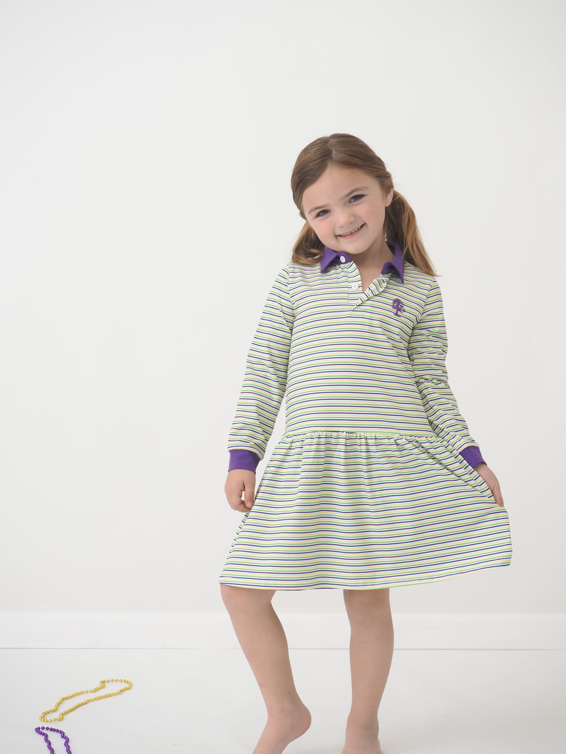 With a classic polo collar, long sleeves, and a soft knit fabric, this dress is perfect for Carnival season, school Mardi Gras parties, family photos, and parades around Bossier City, Shreveport, and all across Louisiana. Whether she’s catching beads or dancing to the second line, she’ll look absolutely adorable!