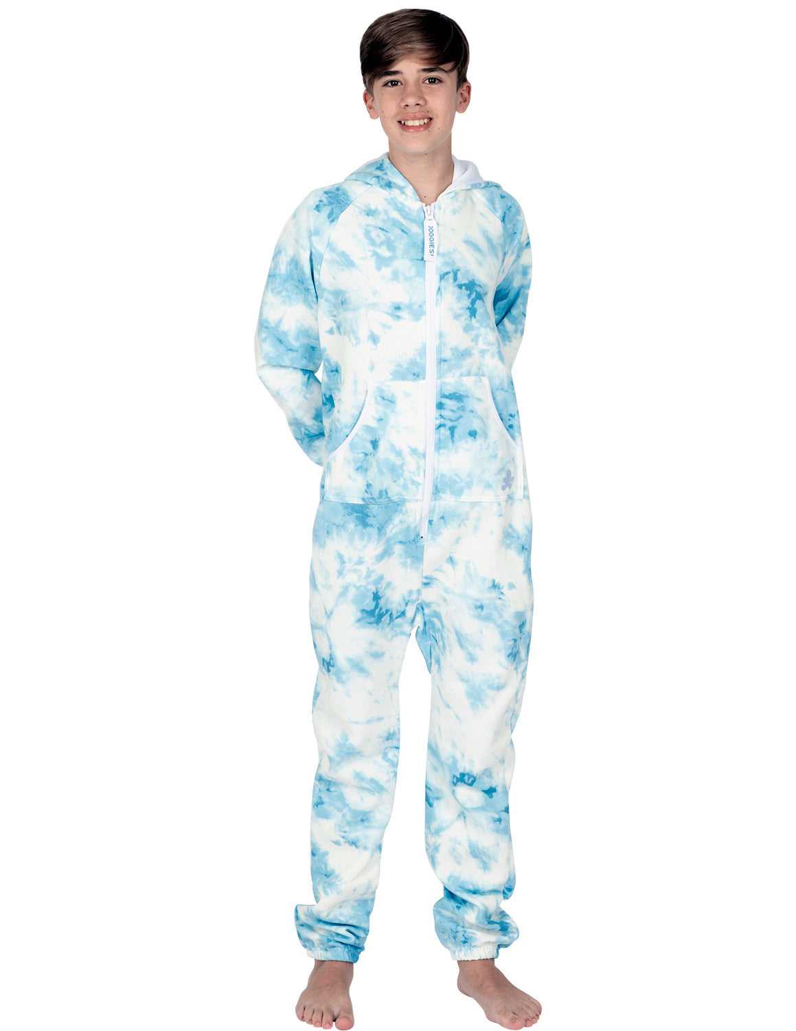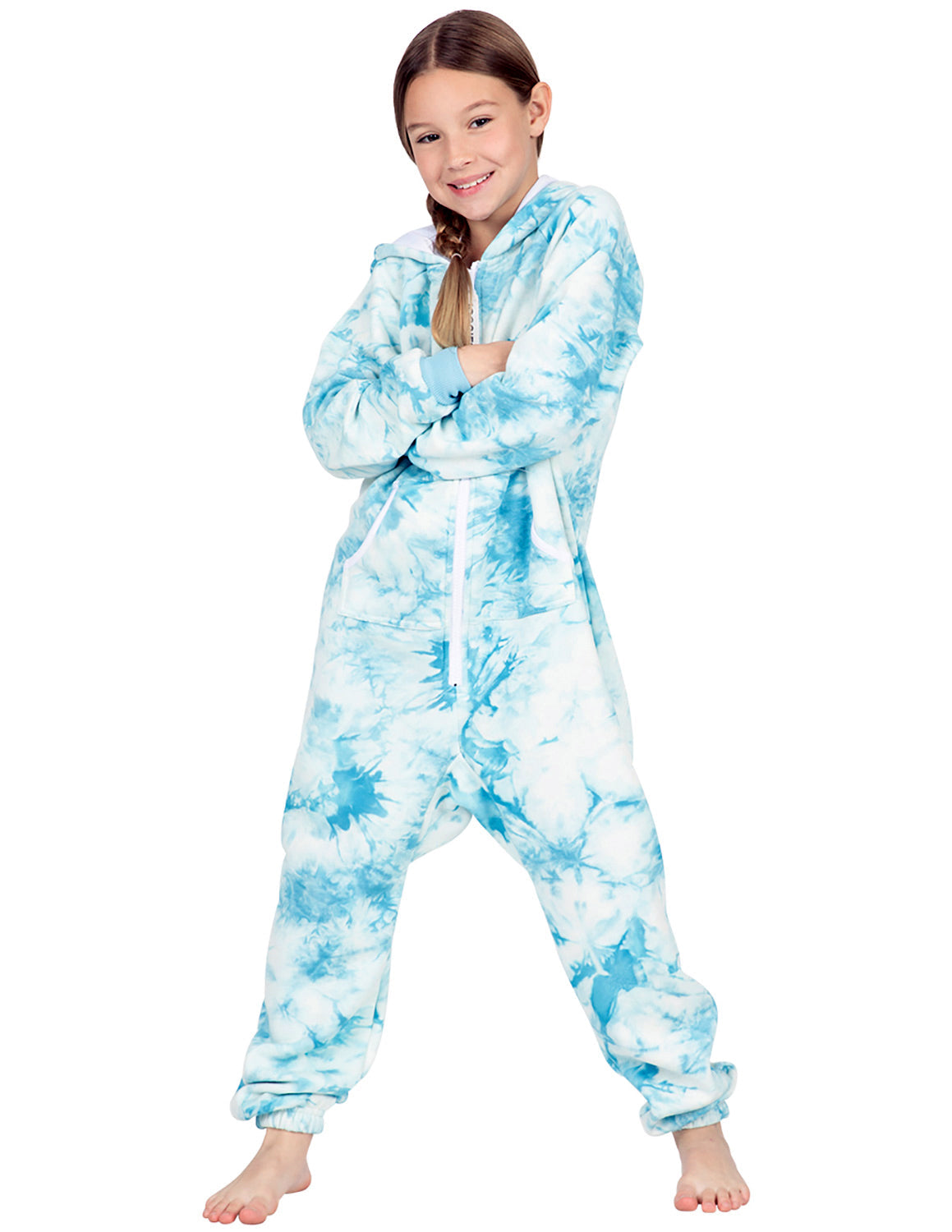 Joggies are the perfect mix between a track suit and onesie pajamas! Stylish features include hoodies and pockets, and thick sweatshirt fleece makes them ultra-cozy! Ideal for walking the dog on the chilly mornings, sitting around a bonfire and for sleepovers! Roll out of bed ready for the day! Both girls and boys will love and look great in unisex blue on white tie dye!