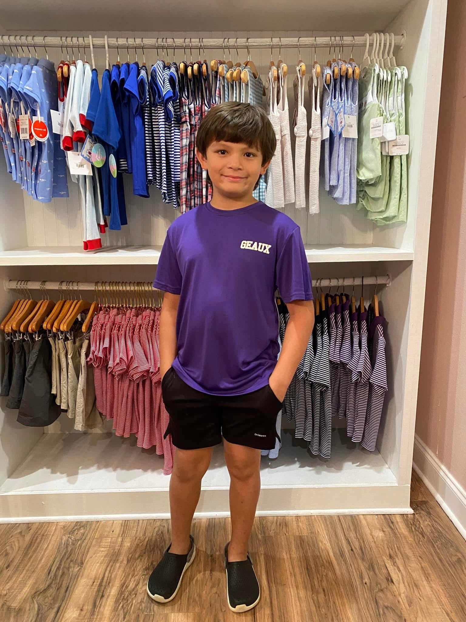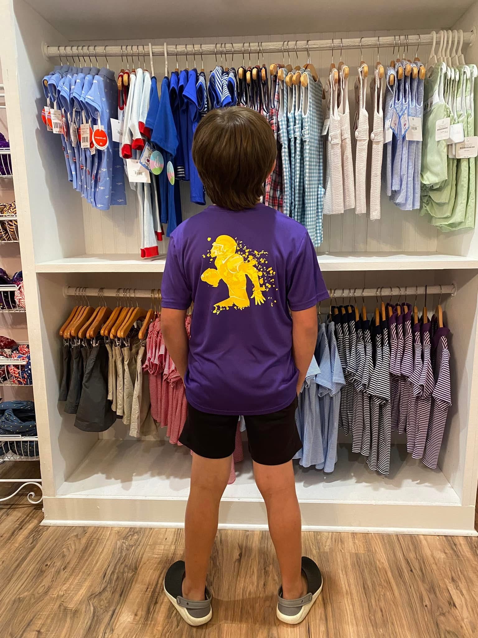 Bring the energy of Tiger football to your kiddo’s wardrobe with our Youth Purple Geaux Player Dri-Fit Tee! Featuring “GEAUX” on the front and a dynamic gold football player graphic on the back, this shirt is built for style, comfort, and team spirit in Louisiana and beyond.