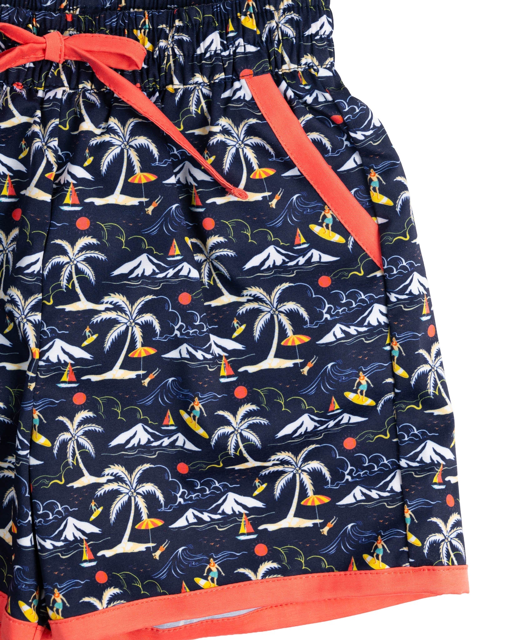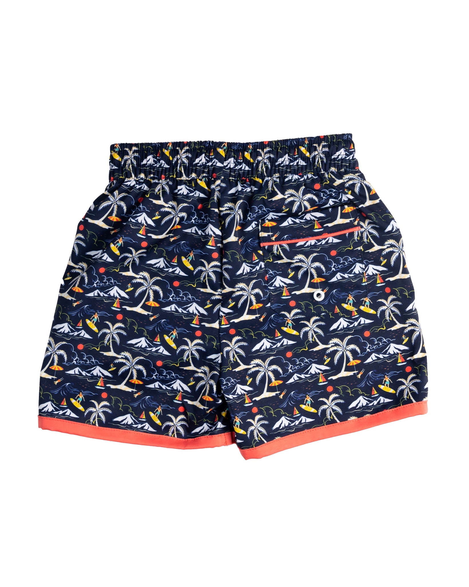 Enjoy a summer filled will fun in the sun in these tropical swim trunks. These trunks feature a print with palm trees, surfing, and sailboats. They have orange trim and a drawstring waist for a perfect fit.