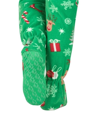 Santa, Rudolf and gingerbread men dance around with presents, candy canes, sleighs and bells on these jolly green fleece footed Christmas pajamas for men and women! Christmas trees are decorated with fresh snow from the flakes twirling above as the north star shines bright on these cozy Adult footie pj’s! Hoodie’s and front pockets add to the style and holiday cheer of these festive fleece onesies!