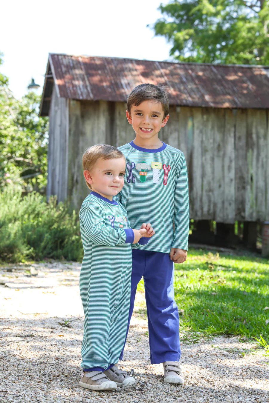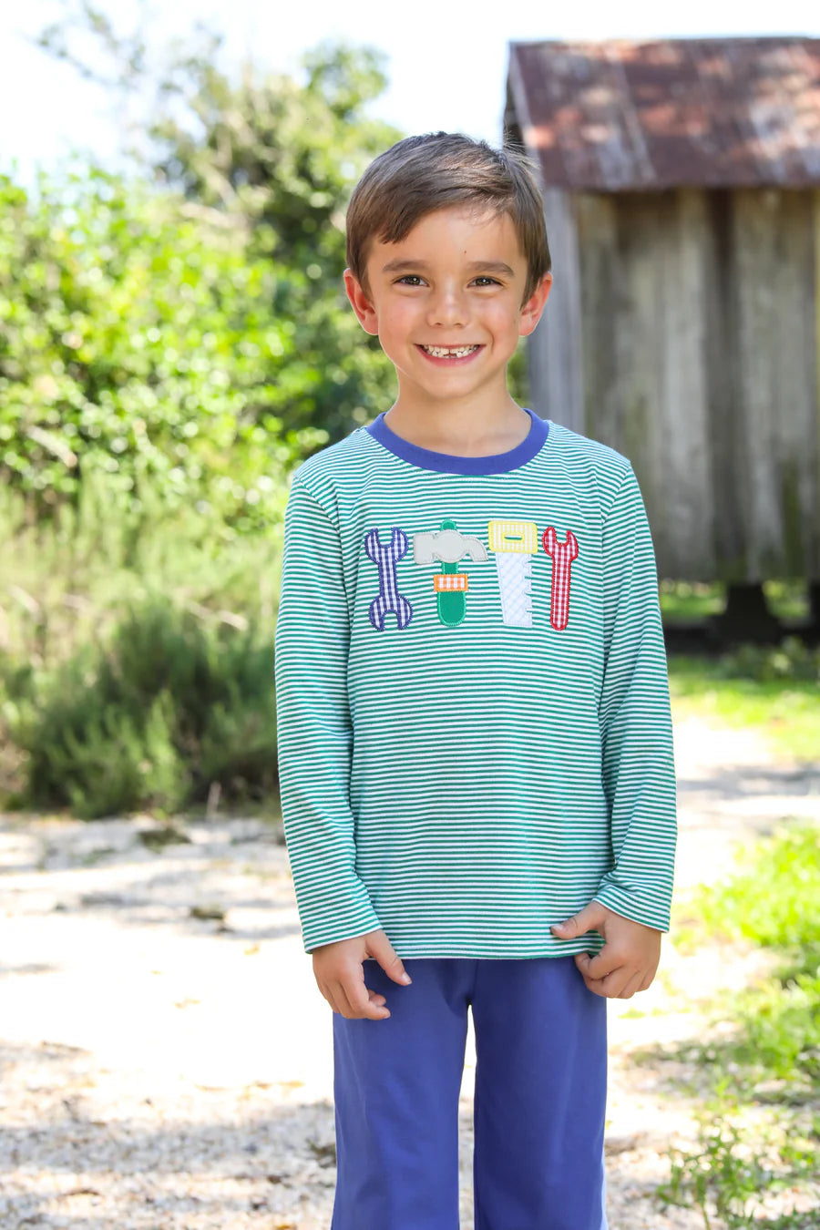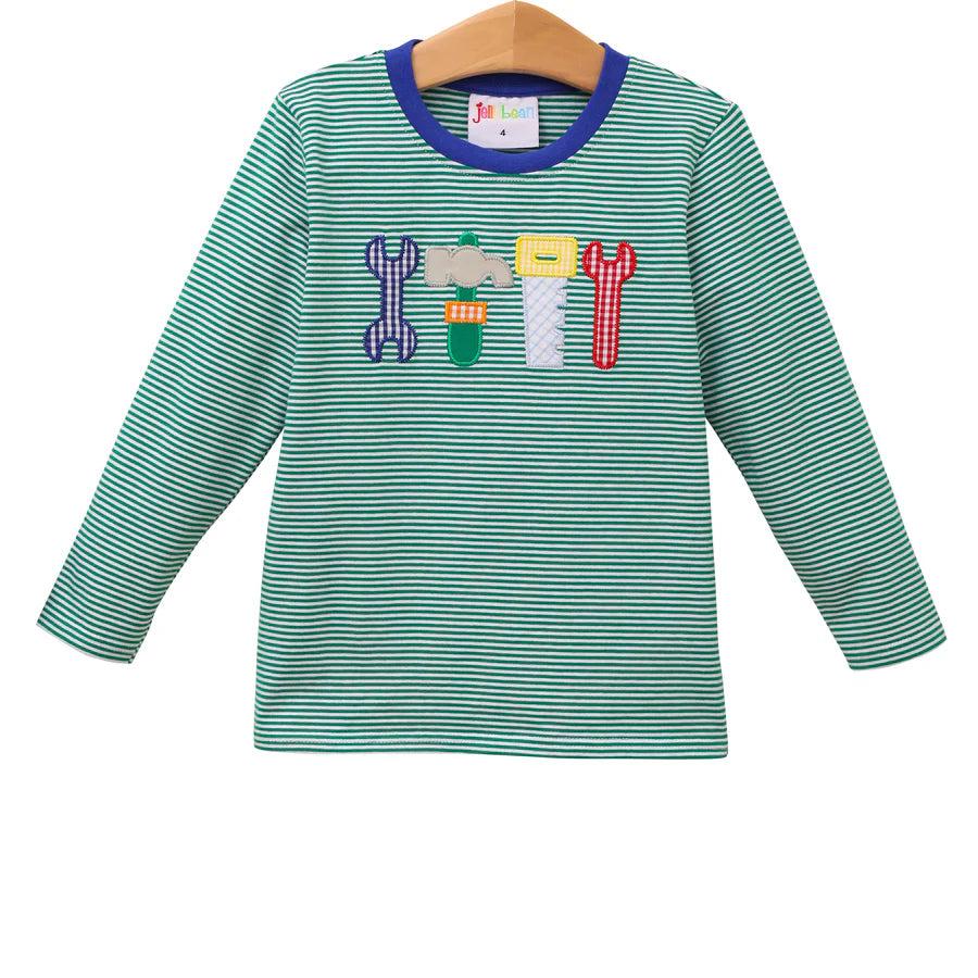 Get your little one ready to tackle any project with our Tool Shirt! Made from 95% cotton and 5% spandex, this shirt is both comfortable and durable. The green and white striped design adds a playful touch, while the 4 tool appliques add a touch of creativity. Complete the look with our matching younger brother Tool Romper. Perfect for your handyman!