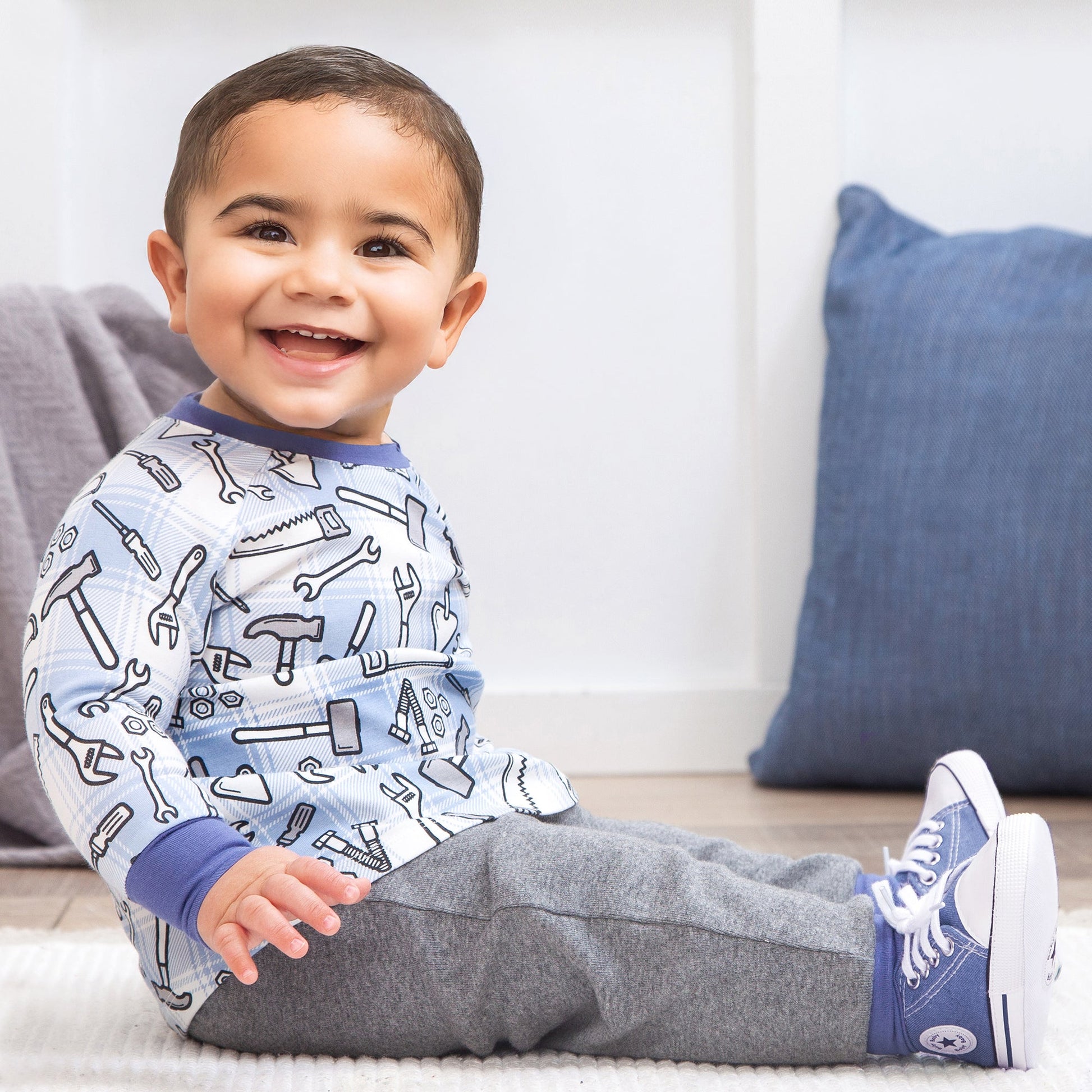 Let your little handyman nail his look with our tool-print bamboo tee, set against a blue plaid backdrop! Paired with comfy heather charcoal cotton rib pants, this ultra-soft bamboo/cotton/spandex blend is designed for all-day cuteness and comfort. Absorbent, hypoallergenic, and eco-friendly, it's sweat-resistant to keep him cozy on every adventure! The pants feature an elasticized waist for quick changes, making it a perfect fit for your busy little builder!Â
